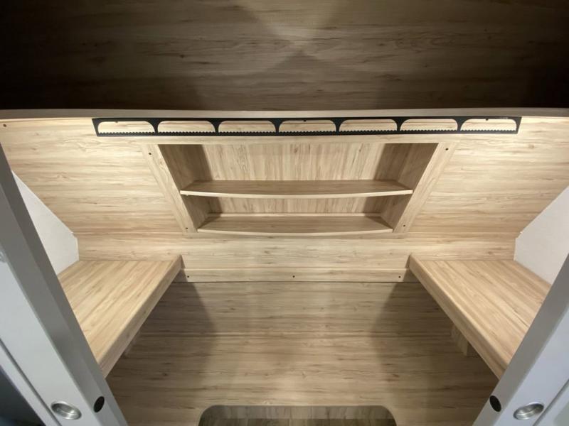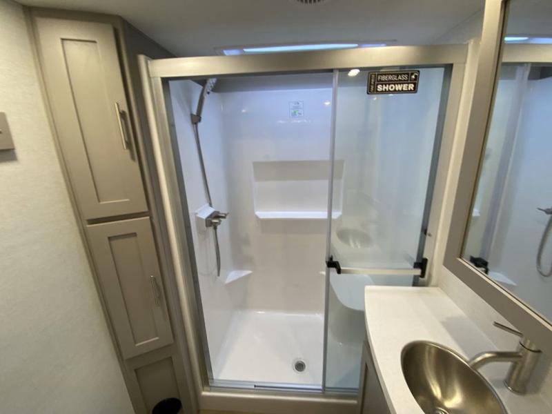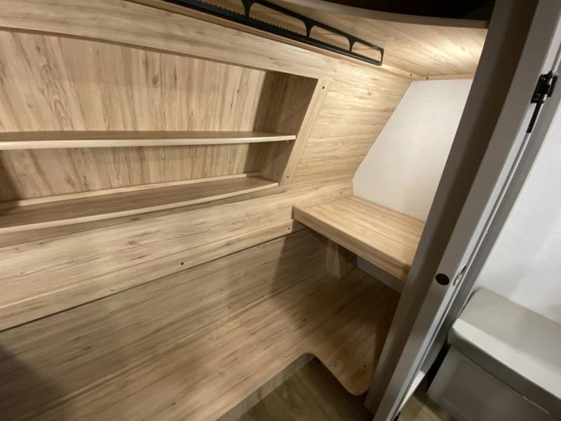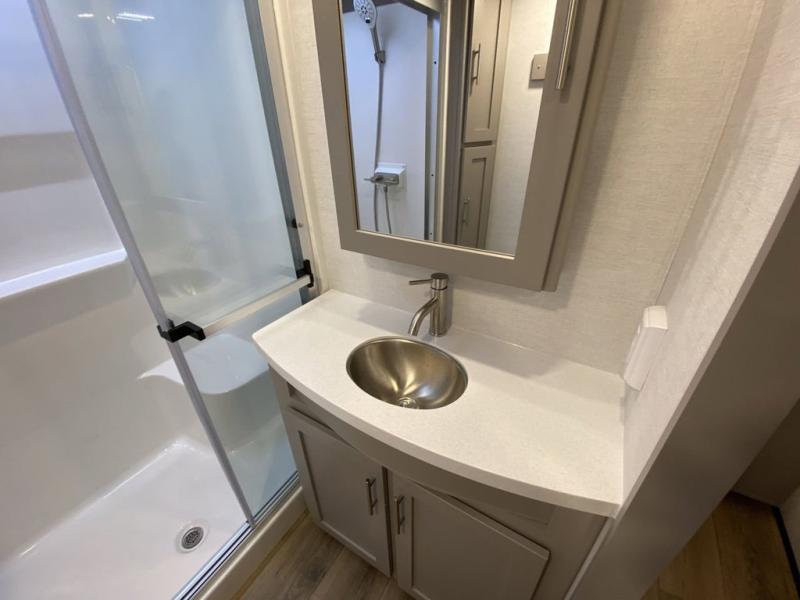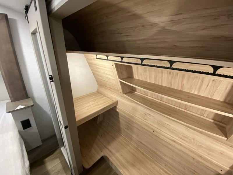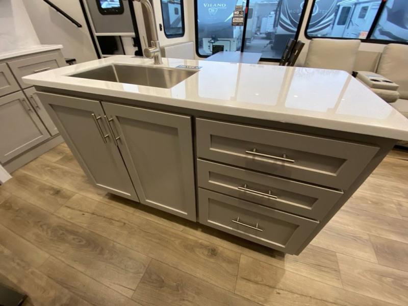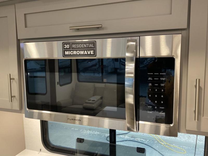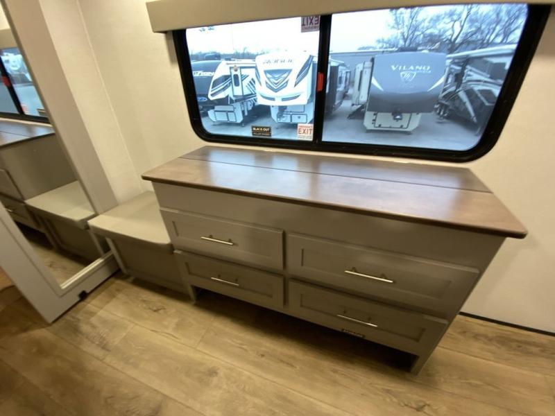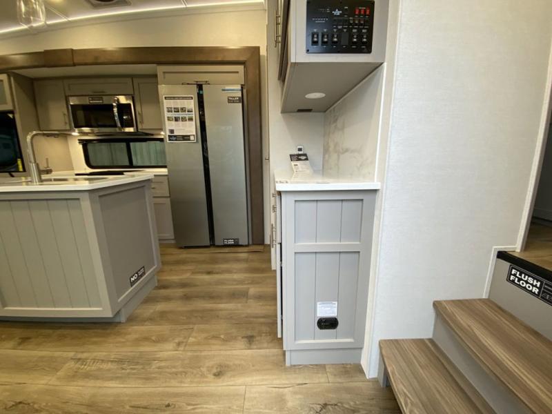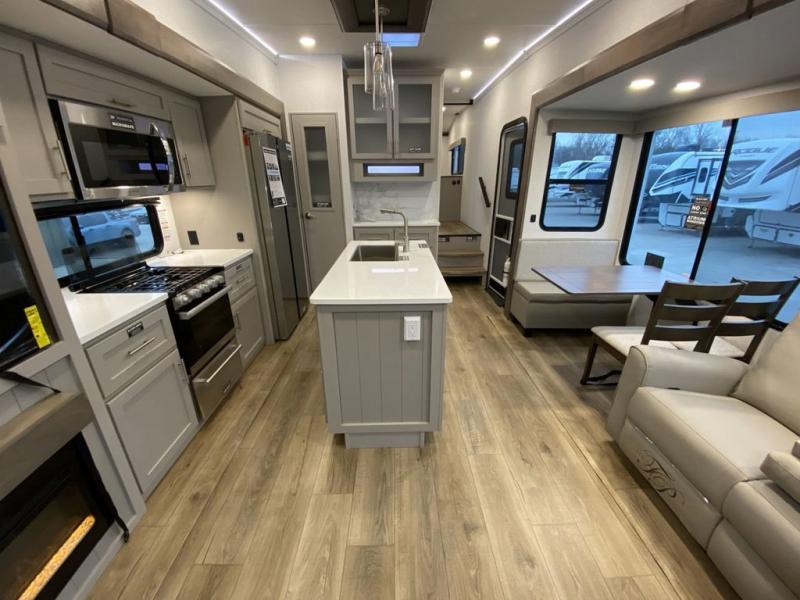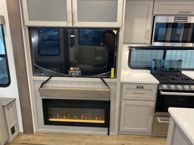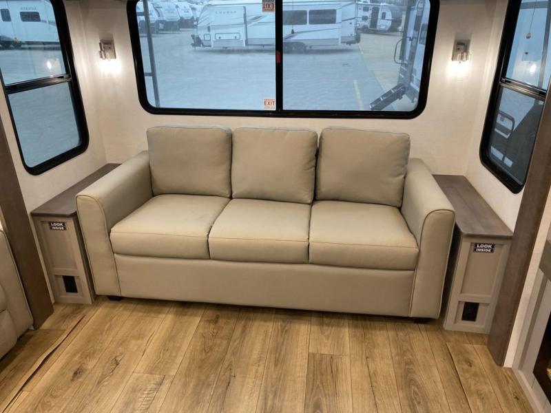 A kitchen island with countertop space makes it easy to prepare meals in this fifth wheel! The floating dinette table has two chairs on one side and a movable ottoman with flip up storage on the other side to keep your games or extra table cloths in. You can store your dishes and snacks inside the hutch/pantry or in the second pantry. The front private bedroom has a queen bed slide but can be switched out for the optional king bed if you like. There is also a dresser and large wardrobe for storage, and either side of the wardrobe with washer and dryer prep. The rear living area features a dual recliner theater seat across from an entertainment center with a 50" class HDTV with hidden storage behind it, and is also on a swing mount for all to see even at the rear sleeper sofa!