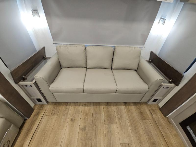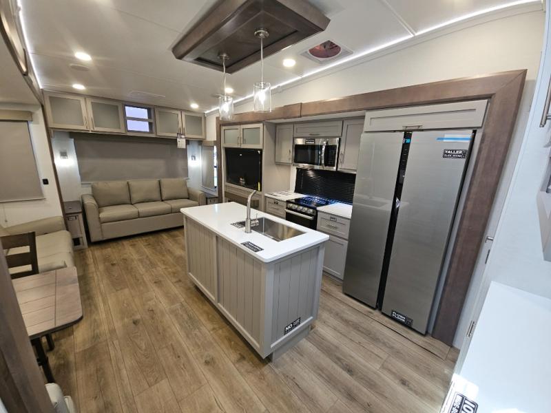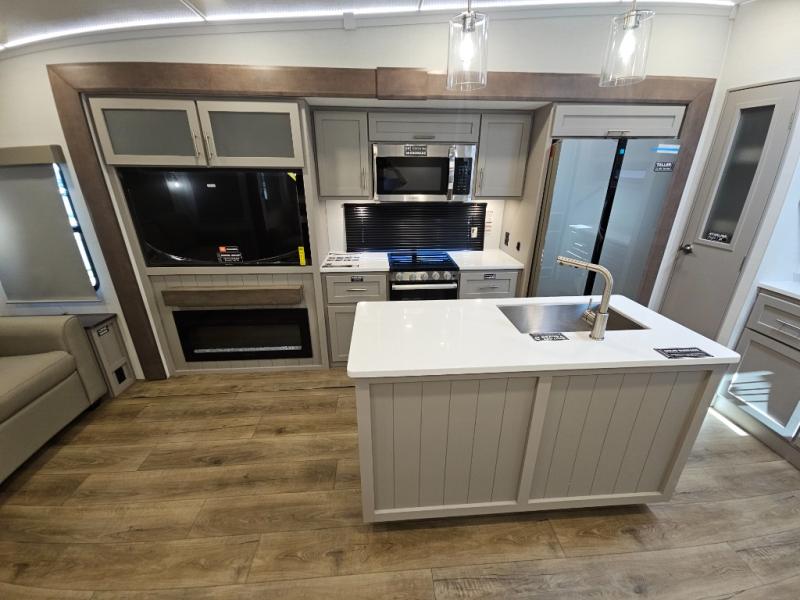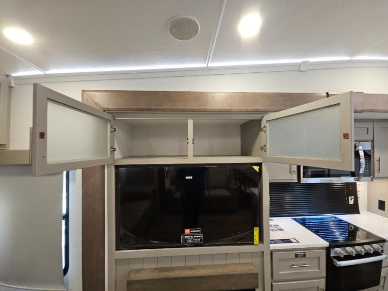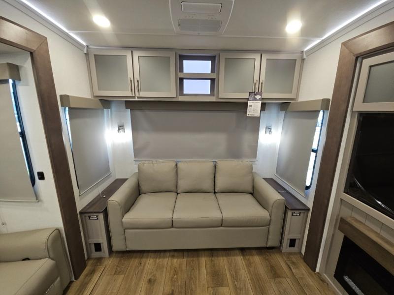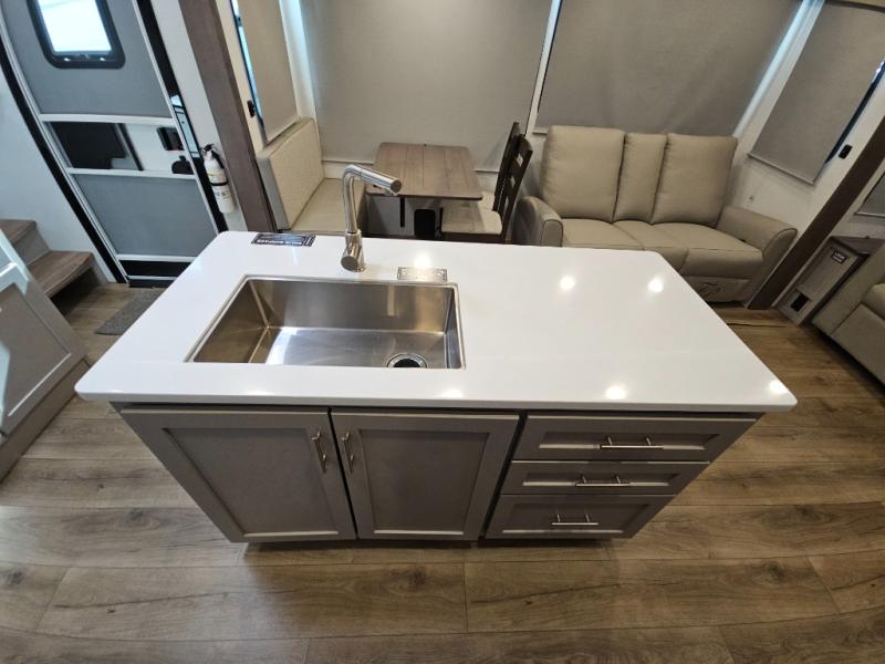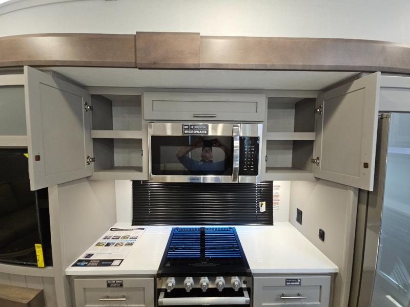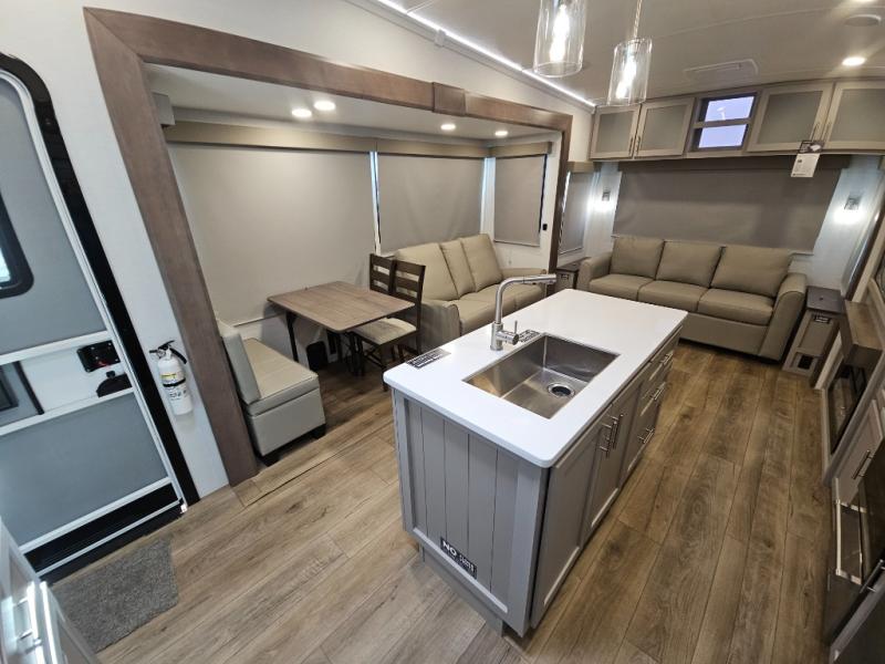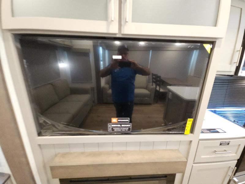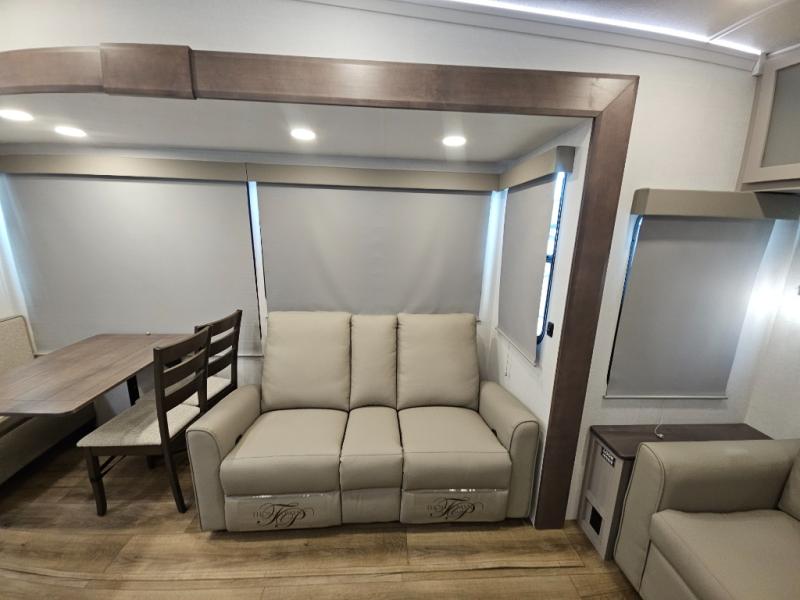 A kitchen island with countertop space makes it easy to prepare meals in this fifth wheel! The floating dinette table has two chairs on one side and a movable ottoman with flip up storage on the other side to keep your games or extra table cloths in. You can store your dishes and snacks inside the hutch/pantry or in the second pantry. The front private bedroom has a queen bed slide but can be switched out for the optional king bed if you like. There is also a dresser and large wardrobe for storage, and either side of the wardrobe with washer and dryer prep. The rear living area features a dual recliner theater seat across from an entertainment center with a 50" class HDTV with hidden storage behind it, and is also on a swing mount for all to see even at the rear sleeper sofa!