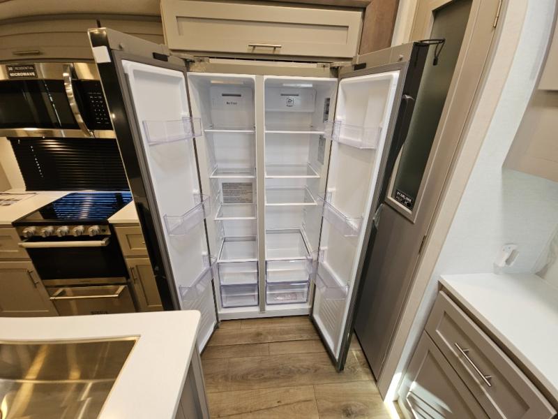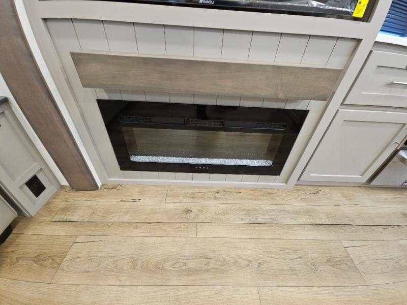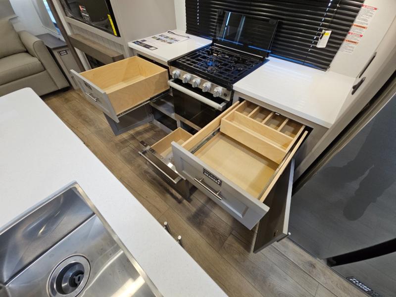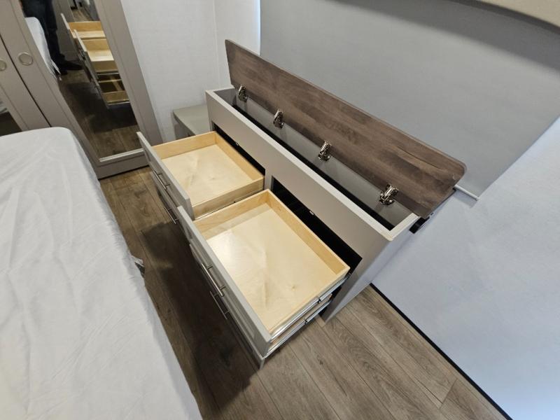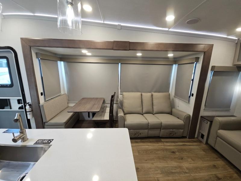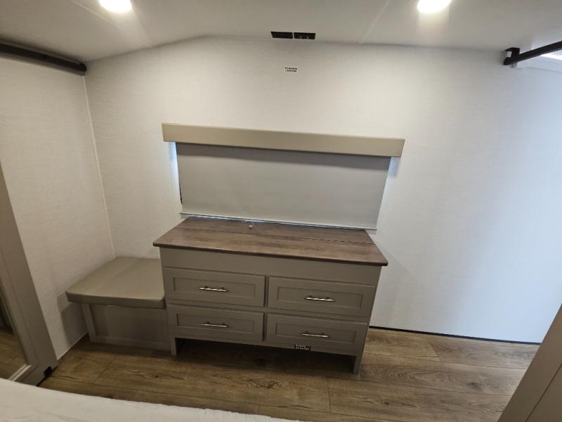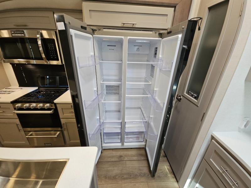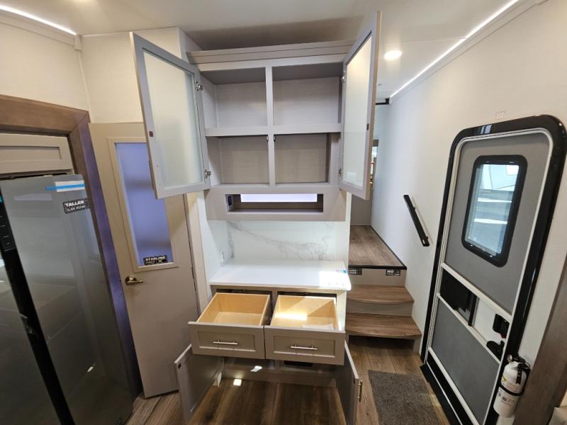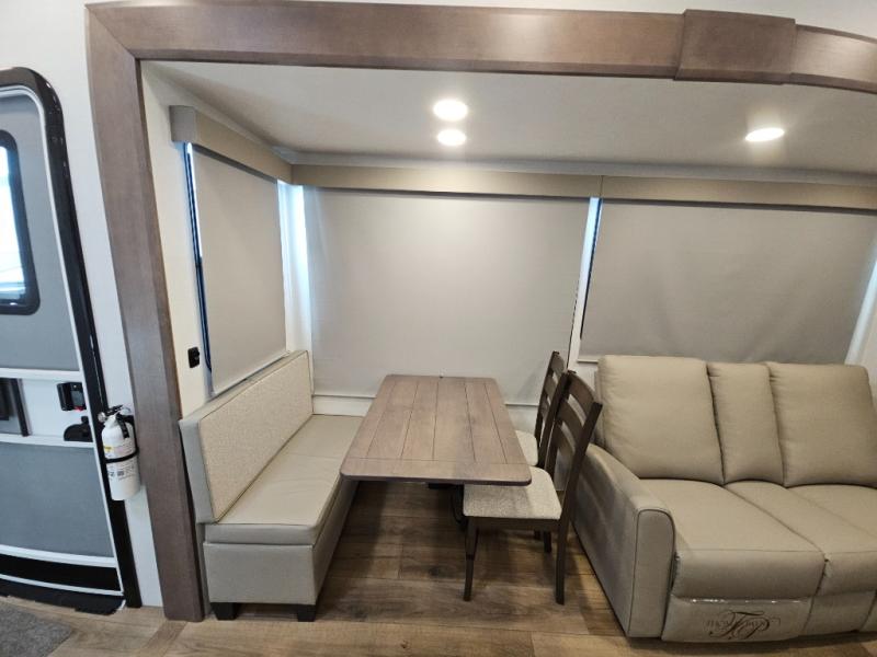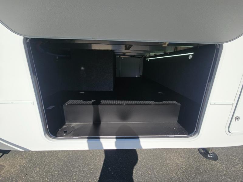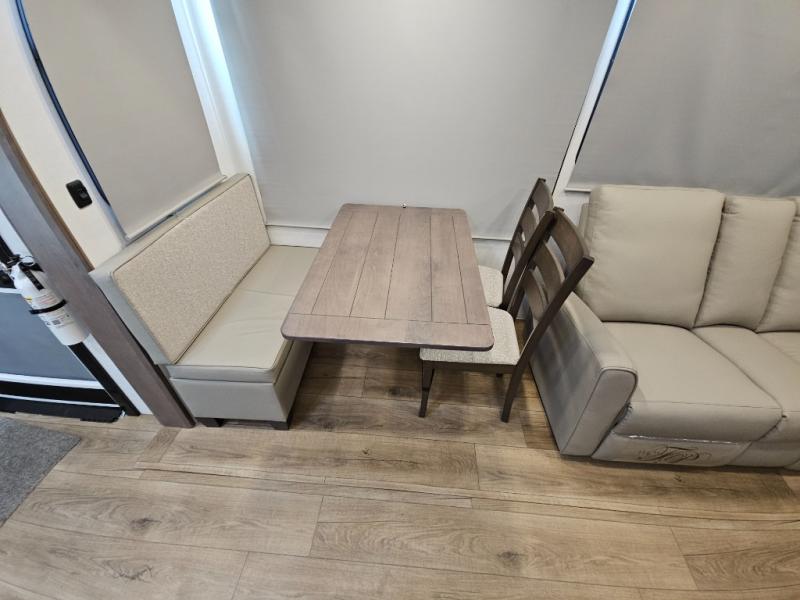 A kitchen island with countertop space makes it easy to prepare meals in this fifth wheel! The floating dinette table has two chairs on one side and a movable ottoman with flip up storage on the other side to keep your games or extra table cloths in. You can store your dishes and snacks inside the hutch/pantry or in the second pantry. The front private bedroom has a queen bed slide but can be switched out for the optional king bed if you like. There is also a dresser and large wardrobe for storage, and either side of the wardrobe with washer and dryer prep. The rear living area features a dual recliner theater seat across from an entertainment center with a 50" class HDTV with hidden storage behind it, and is also on a swing mount for all to see even at the rear sleeper sofa!