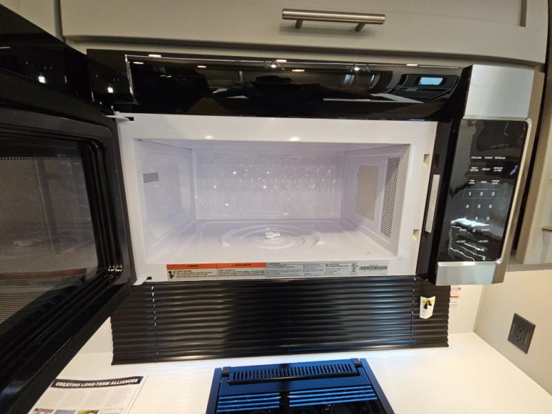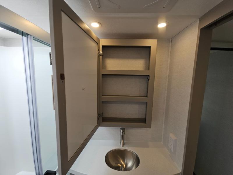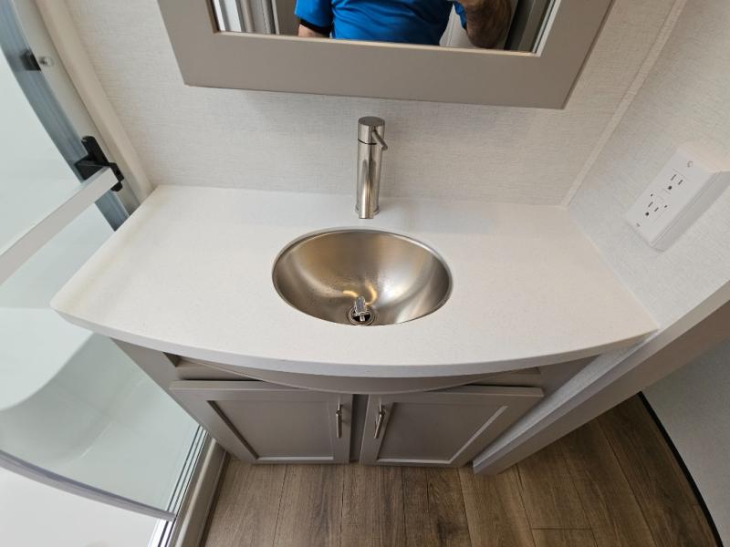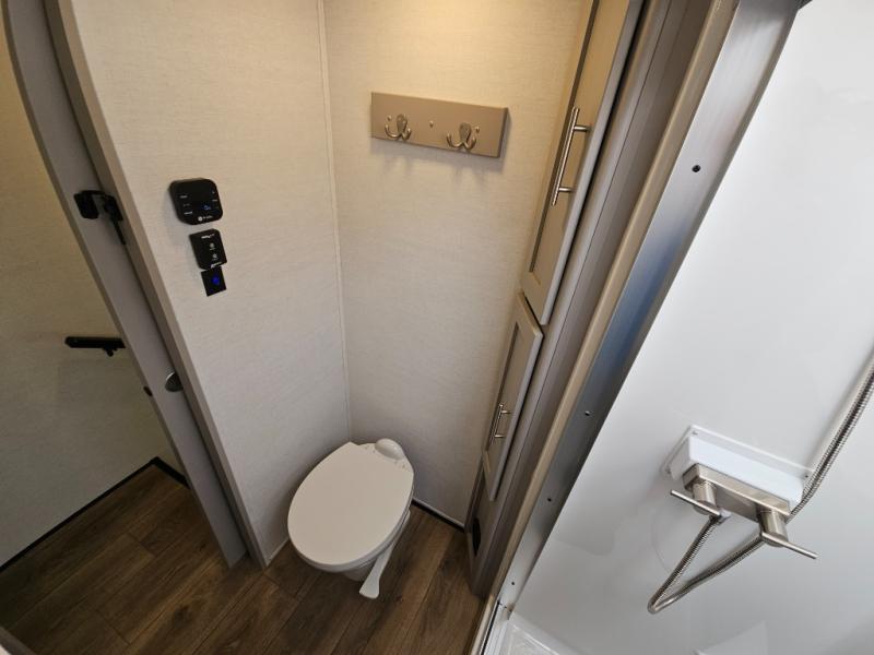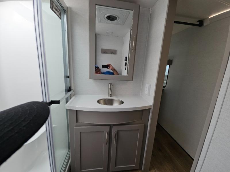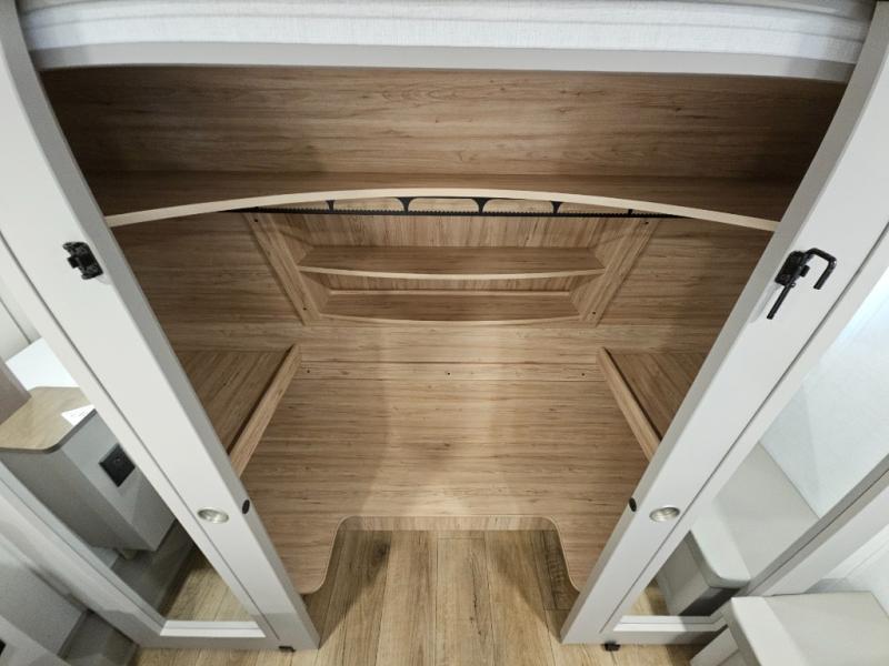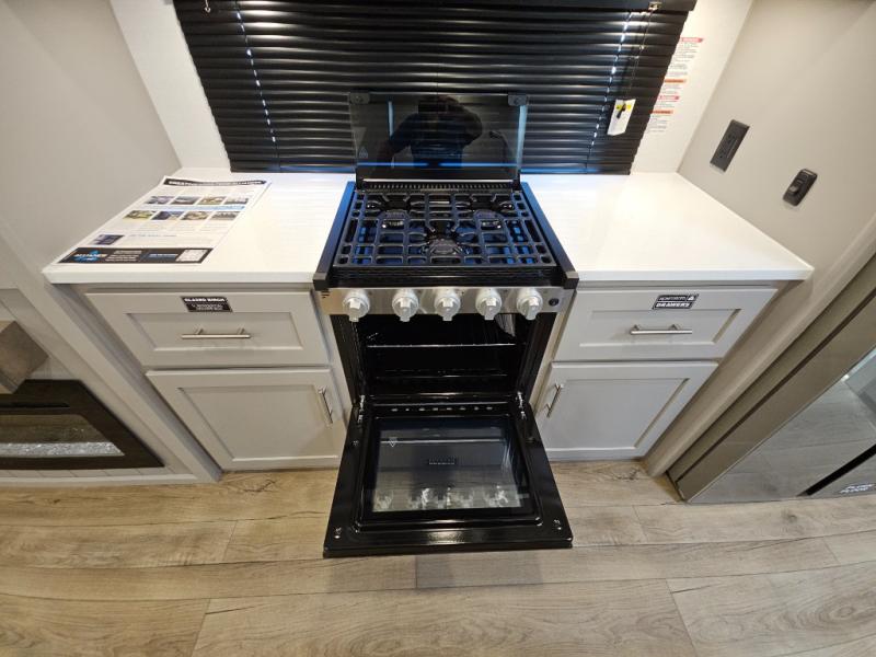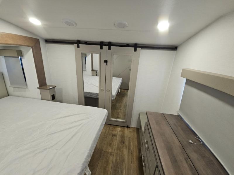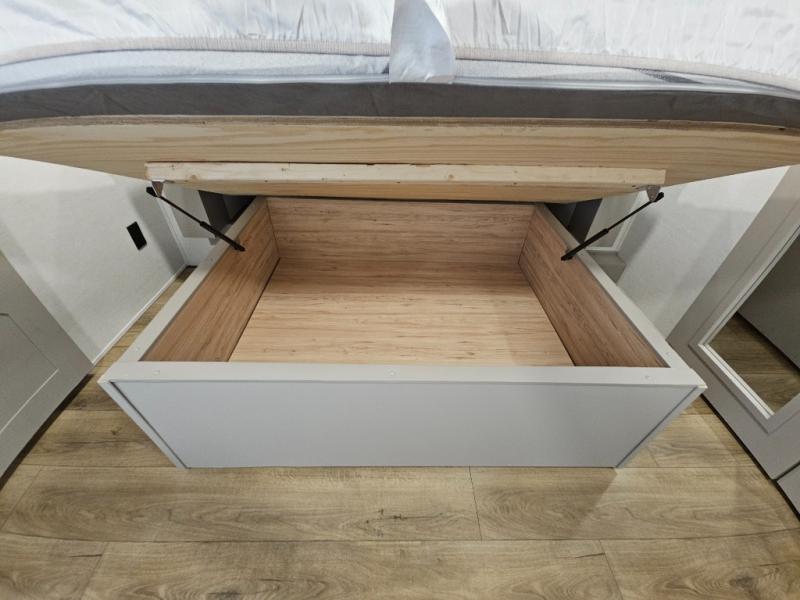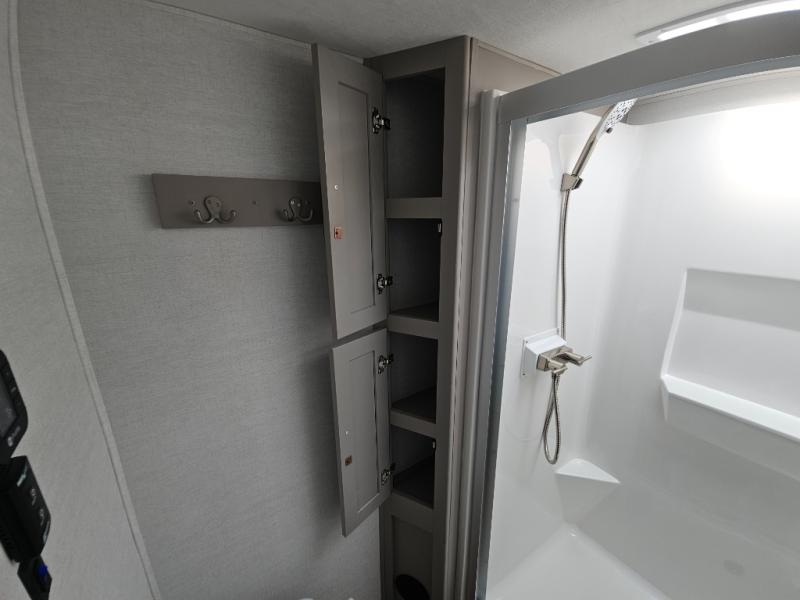 A kitchen island with countertop space makes it easy to prepare meals in this fifth wheel! The floating dinette table has two chairs on one side and a movable ottoman with flip up storage on the other side to keep your games or extra table cloths in. You can store your dishes and snacks inside the hutch/pantry or in the second pantry. The front private bedroom has a queen bed slide but can be switched out for the optional king bed if you like. There is also a dresser and large wardrobe for storage, and either side of the wardrobe with washer and dryer prep. The rear living area features a dual recliner theater seat across from an entertainment center with a 50" class HDTV with hidden storage behind it, and is also on a swing mount for all to see even at the rear sleeper sofa!