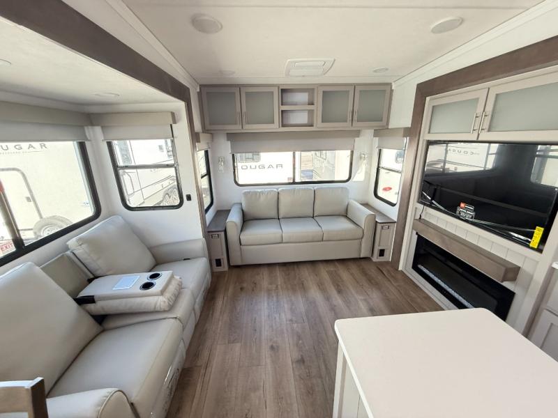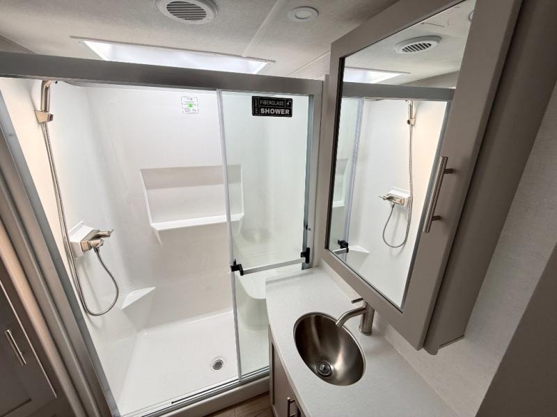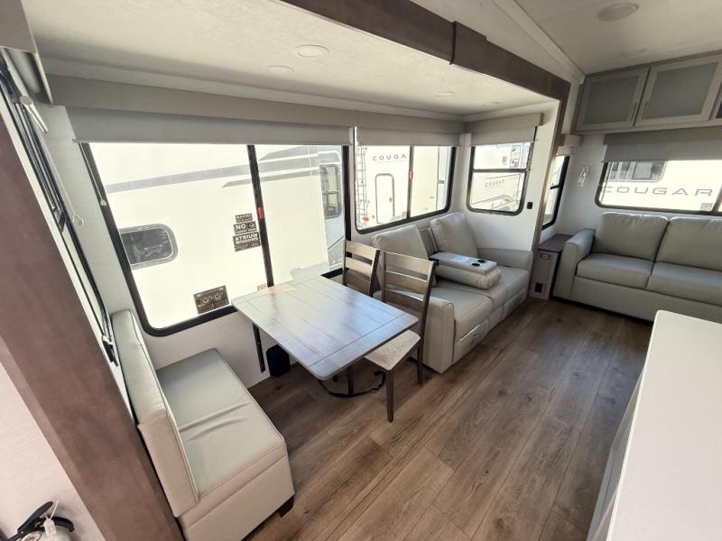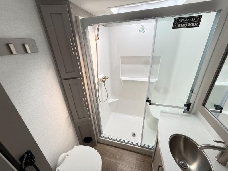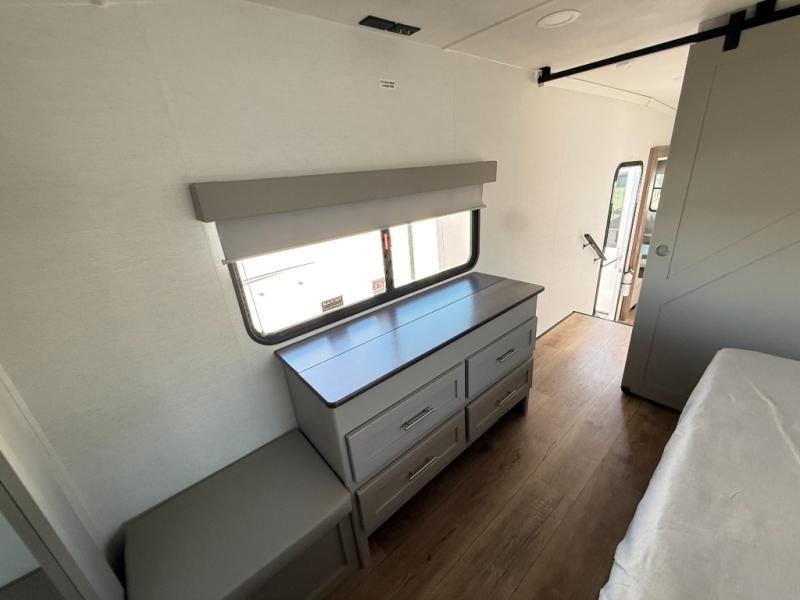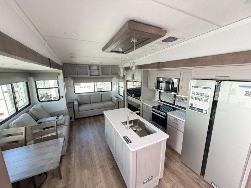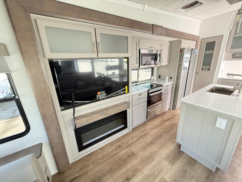 A kitchen island with countertop space makes it easy to prepare meals in this fifth wheel! The floating dinette table has two chairs on one side and a movable ottoman with flip up storage on the other side to keep your games or extra table cloths in. You can store your dishes and snacks inside the hutch/pantry or in the second pantry. The front private bedroom has a queen bed slide but can be switched out for the optional king bed if you like. There is also a dresser and large wardrobe for storage, and either side of the wardrobe with washer and dryer prep. The rear living area features a dual recliner theater seat across from an entertainment center with a 50" class HDTV with hidden storage behind it, and is also on a swing mount for all to see even at the rear sleeper sofa!