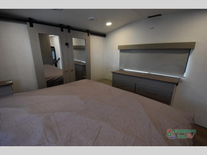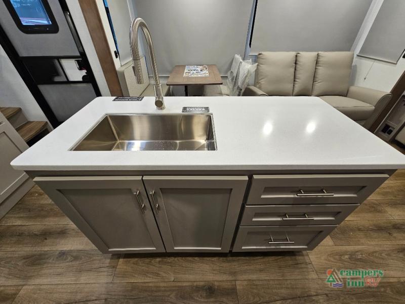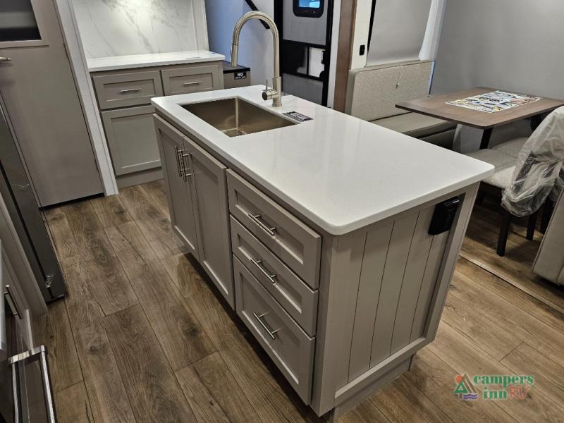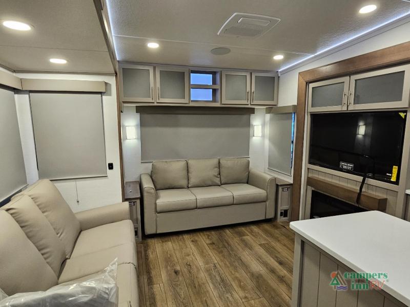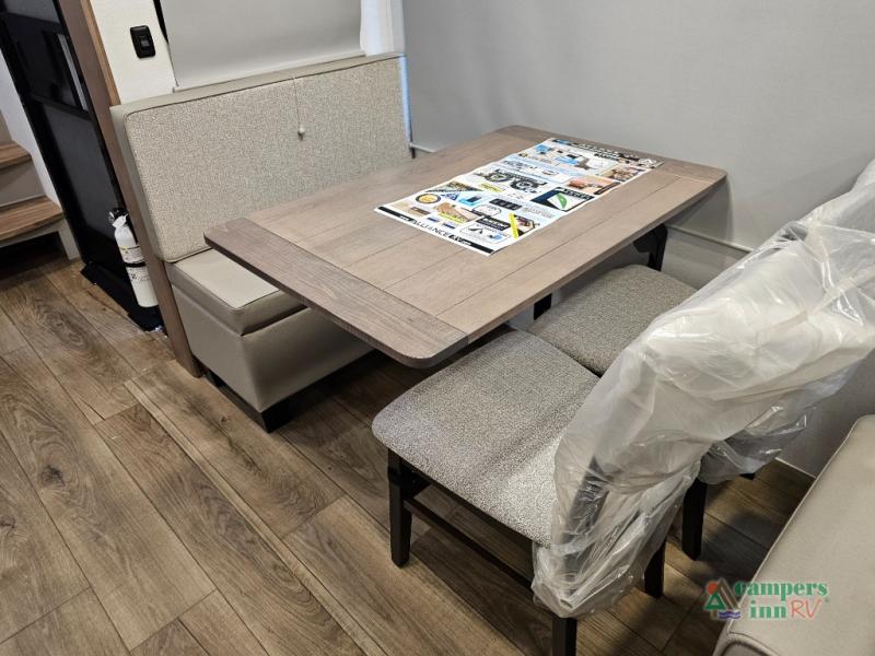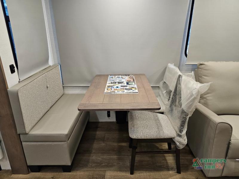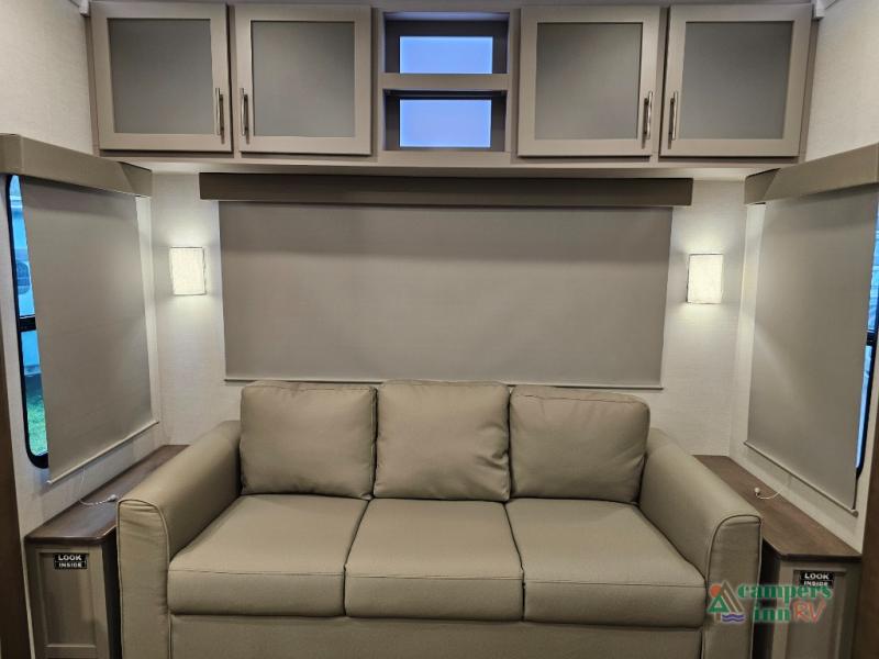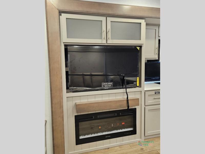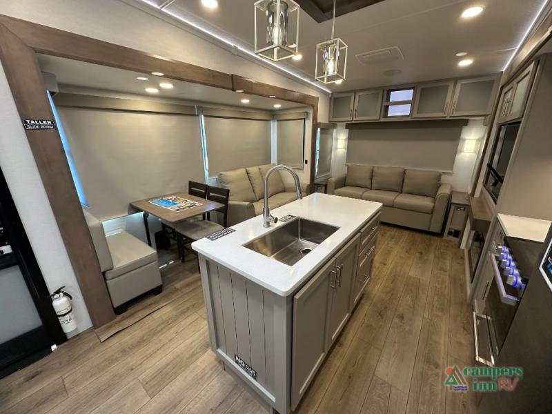 A kitchen island with countertop space makes it easy to prepare meals in this fifth wheel! The floating dinette table has two chairs on one side and a movable ottoman with flip up storage on the other side to keep your games or extra table cloths in. You can store your dishes and snacks inside the hutch/pantry or in the second pantry. The front private bedroom has a queen bed slide but can be switched out for the optional king bed if you like. There is also a dresser and large wardrobe for storage, and either side of the wardrobe with washer and dryer prep. The rear living area features a dual recliner theater seat across from an entertainment center with a 50" class HDTV with hidden storage behind it, and is also on a swing mount for all to see even at the rear sleeper sofa!