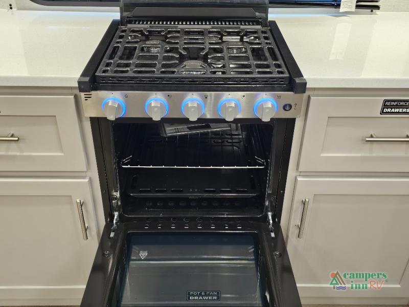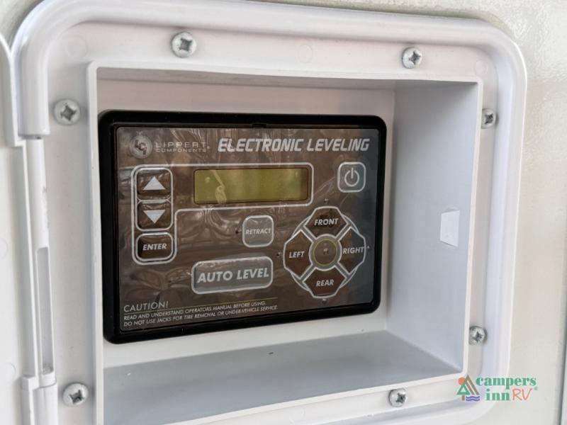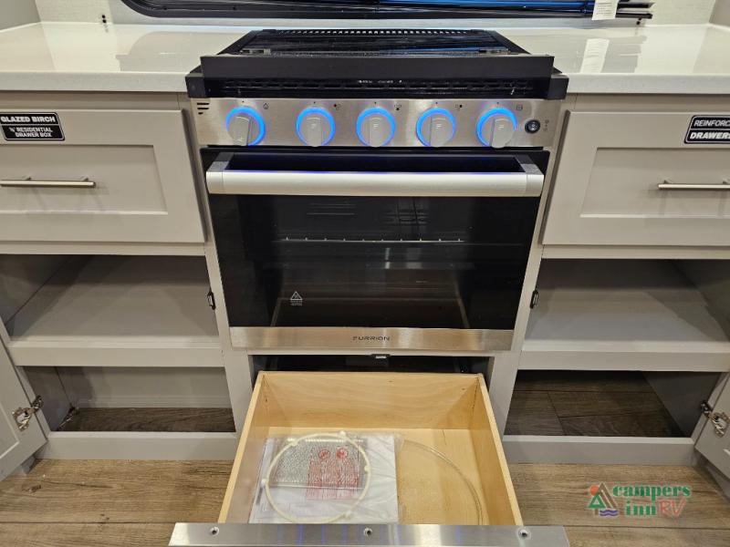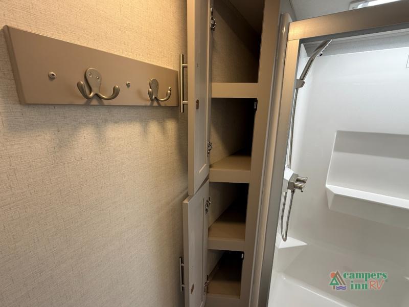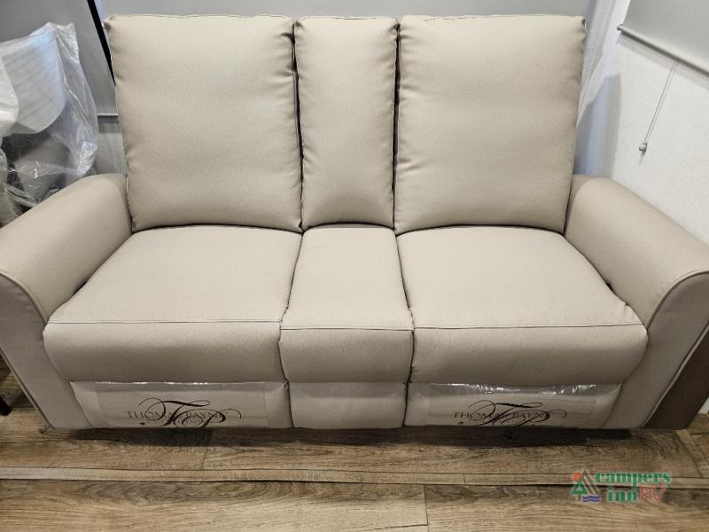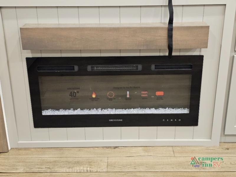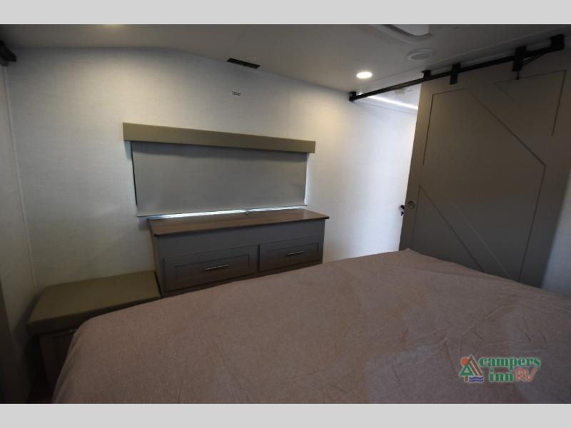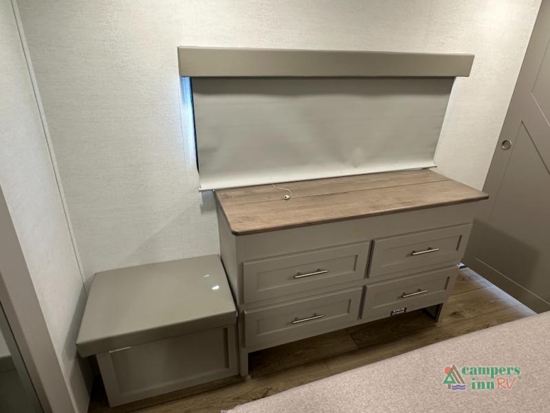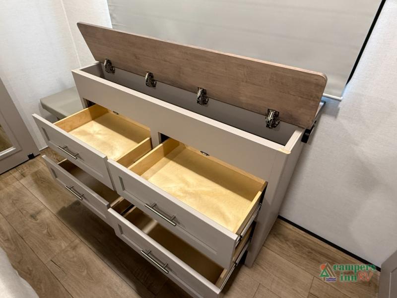 A kitchen island with countertop space makes it easy to prepare meals in this fifth wheel! The floating dinette table has two chairs on one side and a movable ottoman with flip up storage on the other side to keep your games or extra table cloths in. You can store your dishes and snacks inside the hutch/pantry or in the second pantry. The front private bedroom has a queen bed slide but can be switched out for the optional king bed if you like. There is also a dresser and large wardrobe for storage, and either side of the wardrobe with washer and dryer prep. The rear living area features a dual recliner theater seat across from an entertainment center with a 50" class HDTV with hidden storage behind it, and is also on a swing mount for all to see even at the rear sleeper sofa!