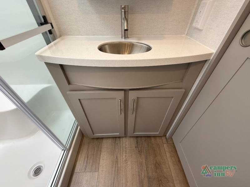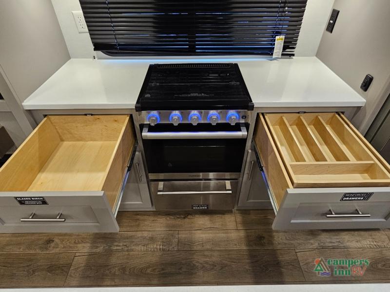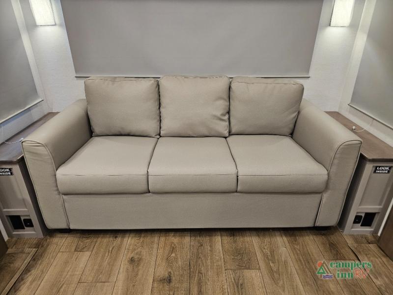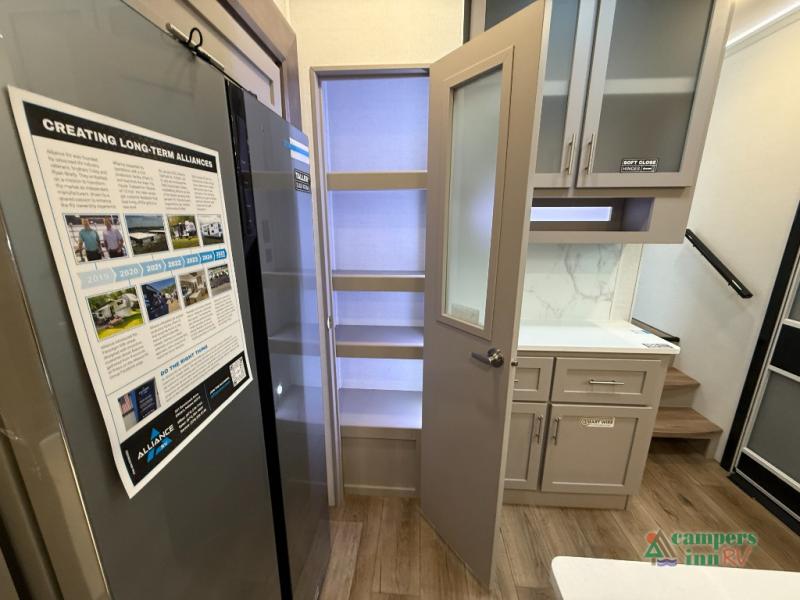 With any Avenue fifth wheel or travel trailer by Alliance RV, you will enjoy more interior space provided by the 8' 5" wide-body construction, and a long list of luxury features. Each is built with Azdel composite sidewalls both inside and out, along with a PVC roof for added strength. There are innovative storage solutions that include hidden storage behind the TV, within end tables and ottomans, and more. Since these units feature no carpet throughout, cleaning will be easier than ever, and there are flush floor slides throughout for seamless living spaces. The Avenue also comes with the OTG Solar Package with a 400 watt solar panel, inverter prep, multiple outlets, and more to keep you charged up!
