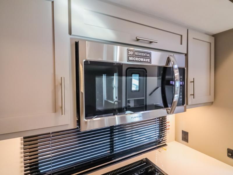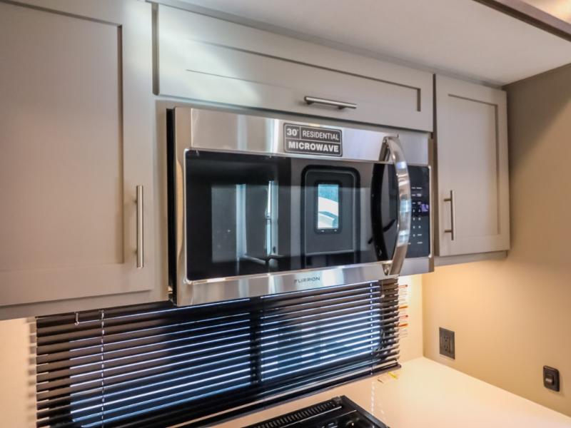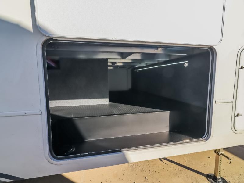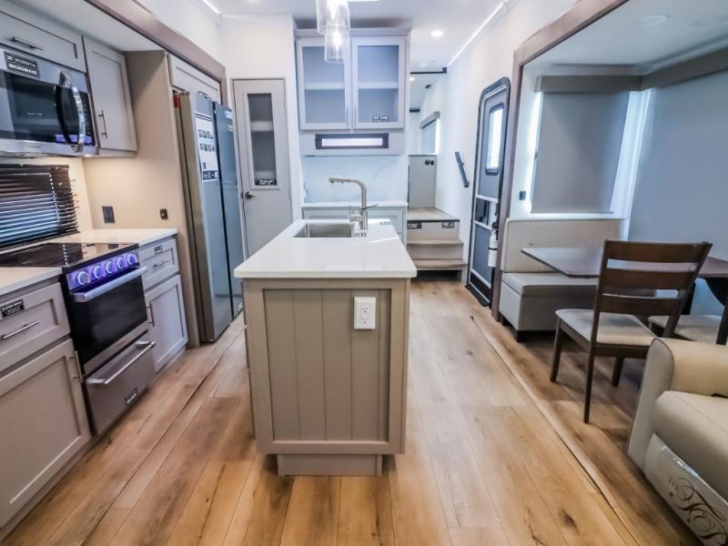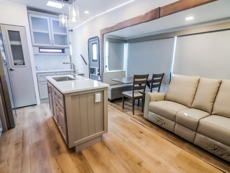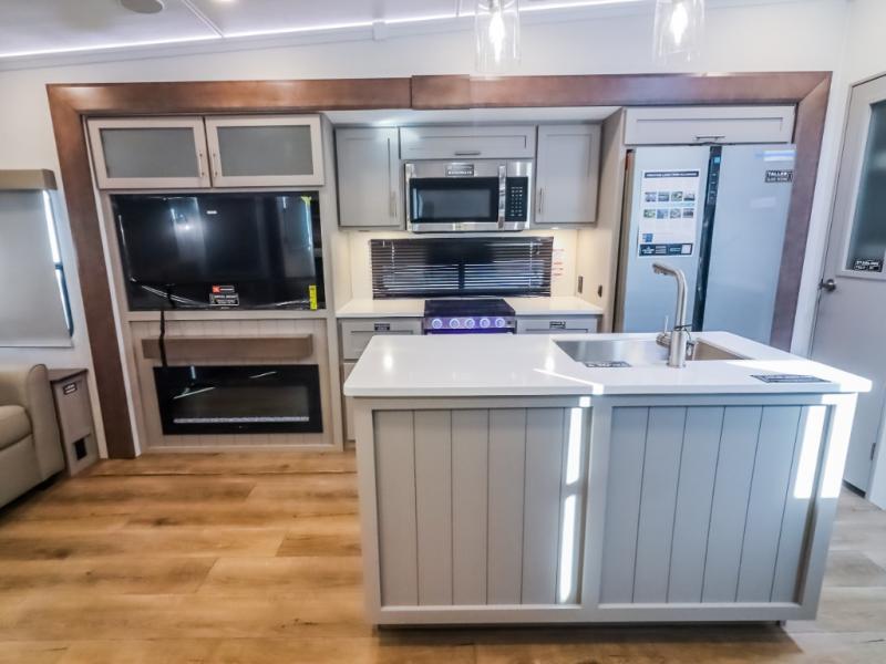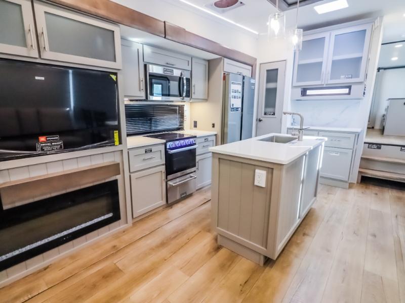 A kitchen island with countertop space makes it easy to prepare meals in this fifth wheel! The floating dinette table has two chairs on one side and a movable ottoman with flip up storage on the other side to keep your games or extra table cloths in. You can store your dishes and snacks inside the hutch/pantry or in the second pantry. The front private bedroom has a queen bed slide but can be switched out for the optional king bed if you like. There is also a dresser and large wardrobe for storage, and either side of the wardrobe with washer and dryer prep. The rear living area features a dual recliner theater seat across from an entertainment center with a 50" class HDTV with hidden storage behind it, and is also on a swing mount for all to see even at the rear sleeper sofa!