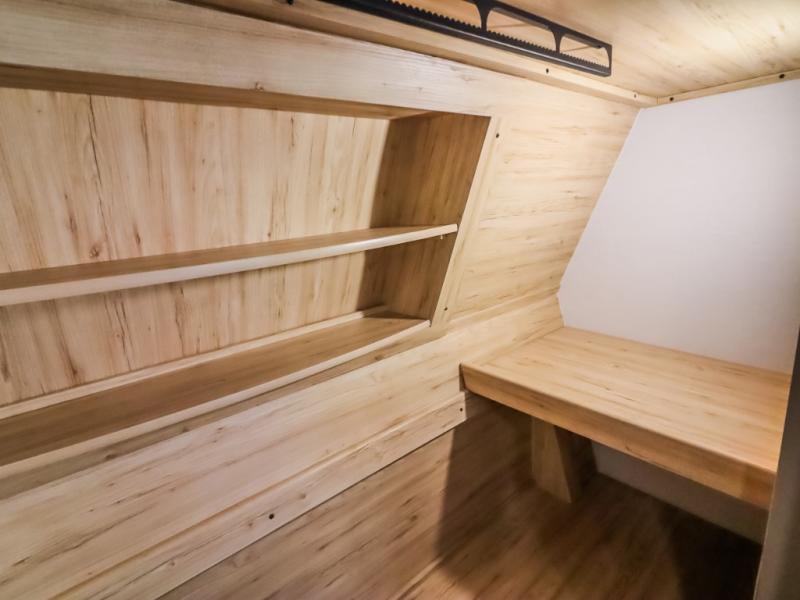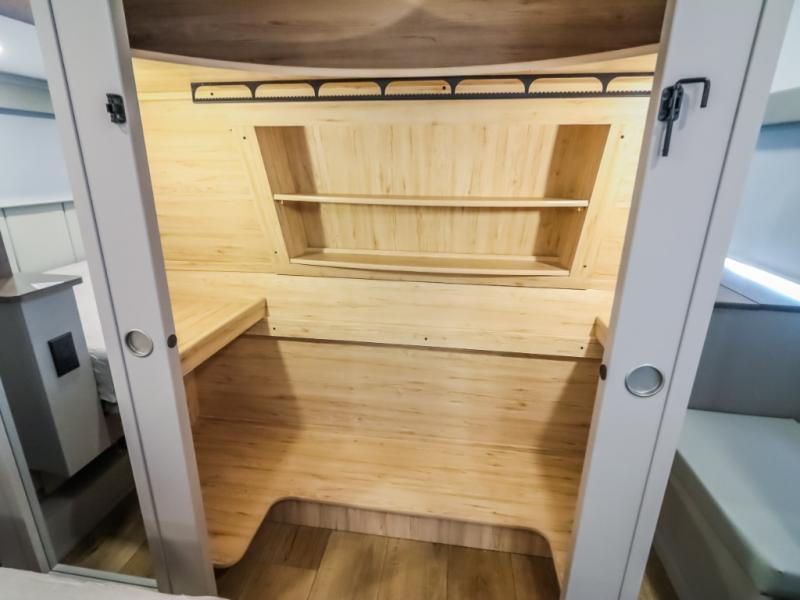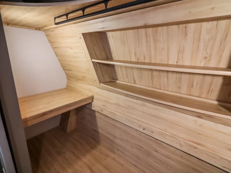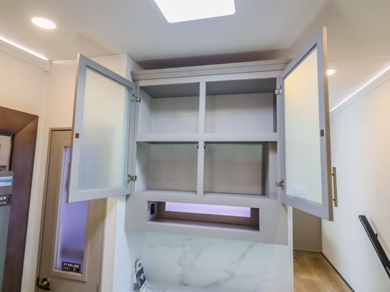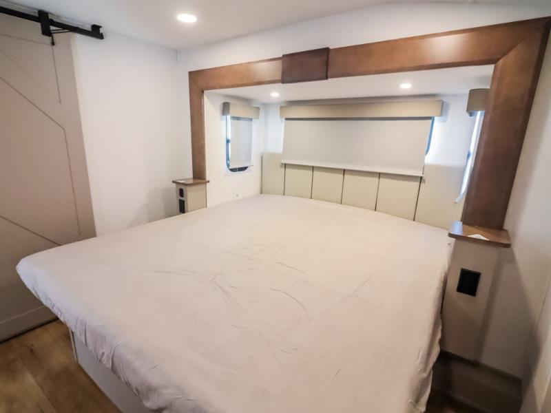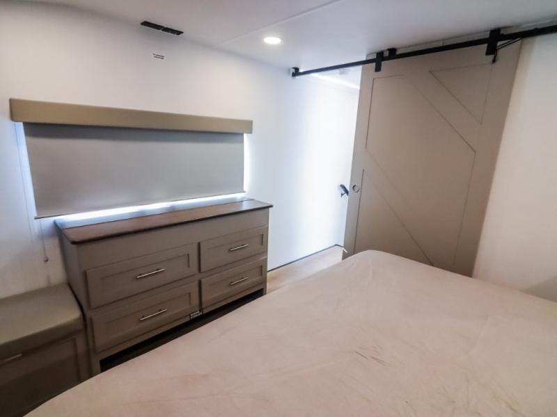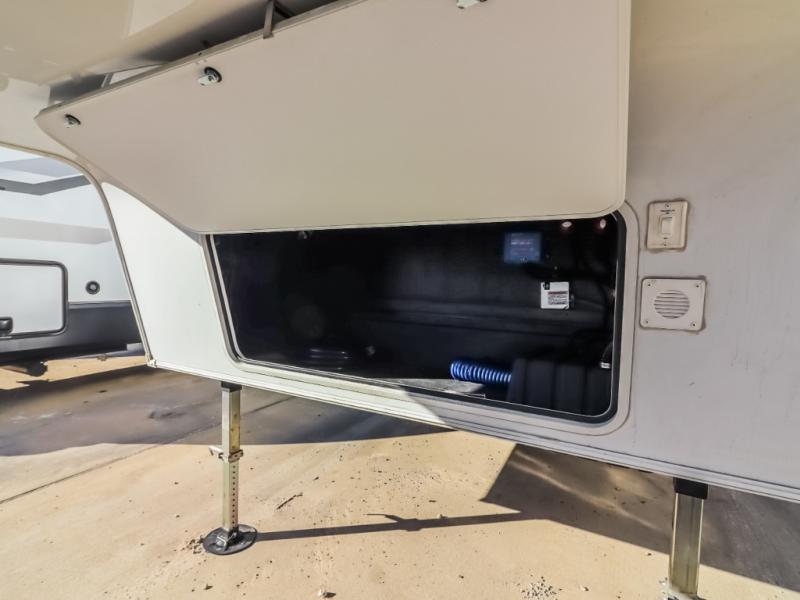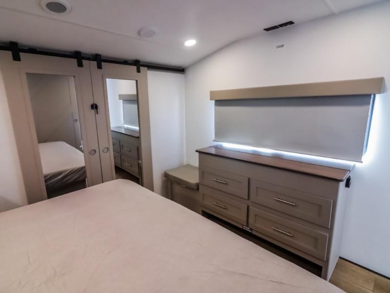 A kitchen island with countertop space makes it easy to prepare meals in this fifth wheel! The floating dinette table has two chairs on one side and a movable ottoman with flip up storage on the other side to keep your games or extra table cloths in. You can store your dishes and snacks inside the hutch/pantry or in the second pantry. The front private bedroom has a queen bed slide but can be switched out for the optional king bed if you like. There is also a dresser and large wardrobe for storage, and either side of the wardrobe with washer and dryer prep. The rear living area features a dual recliner theater seat across from an entertainment center with a 50" class HDTV with hidden storage behind it, and is also on a swing mount for all to see even at the rear sleeper sofa!