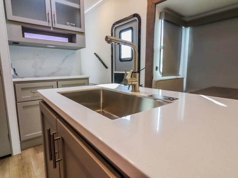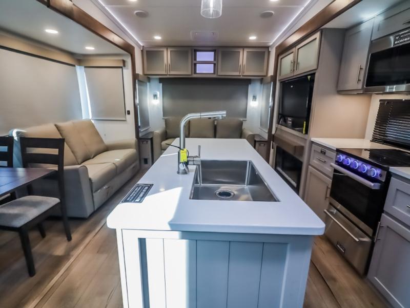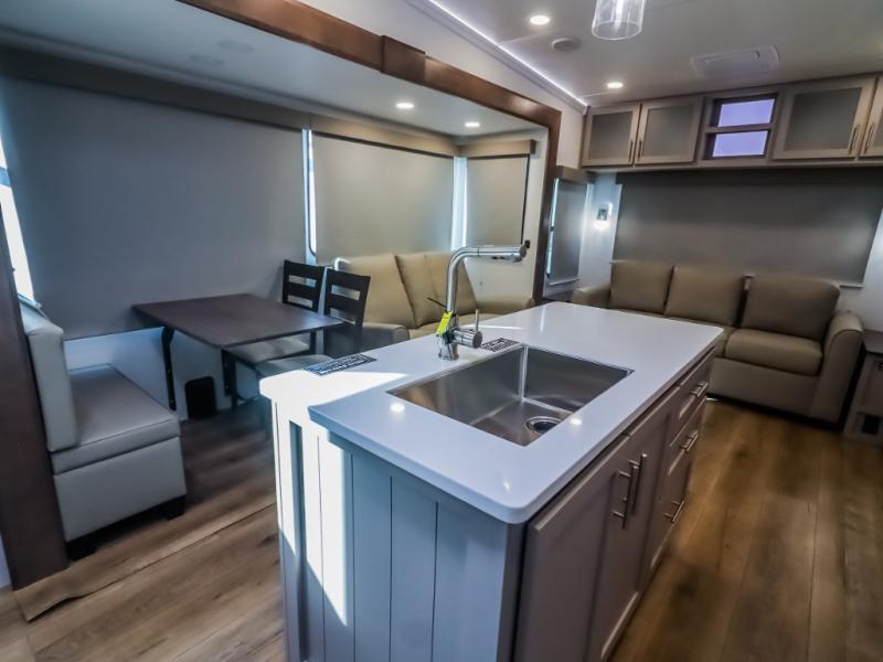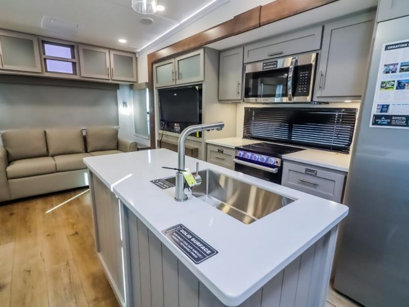 With any Avenue fifth wheel or travel trailer by Alliance RV, you will enjoy more interior space provided by the 8' 5" wide-body construction, and a long list of luxury features. Each is built with Azdel composite sidewalls both inside and out, along with a PVC roof for added strength. There are innovative storage solutions that include hidden storage behind the TV, within end tables and ottomans, and more. Since these units feature no carpet throughout, cleaning will be easier than ever, and there are flush floor slides throughout for seamless living spaces. The Avenue also comes with the OTG Solar Package with a 400 watt solar panel, inverter prep, multiple outlets, and more to keep you charged up!
