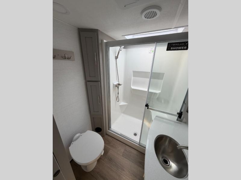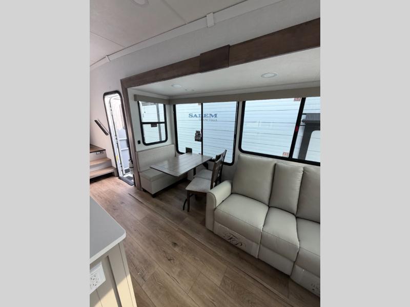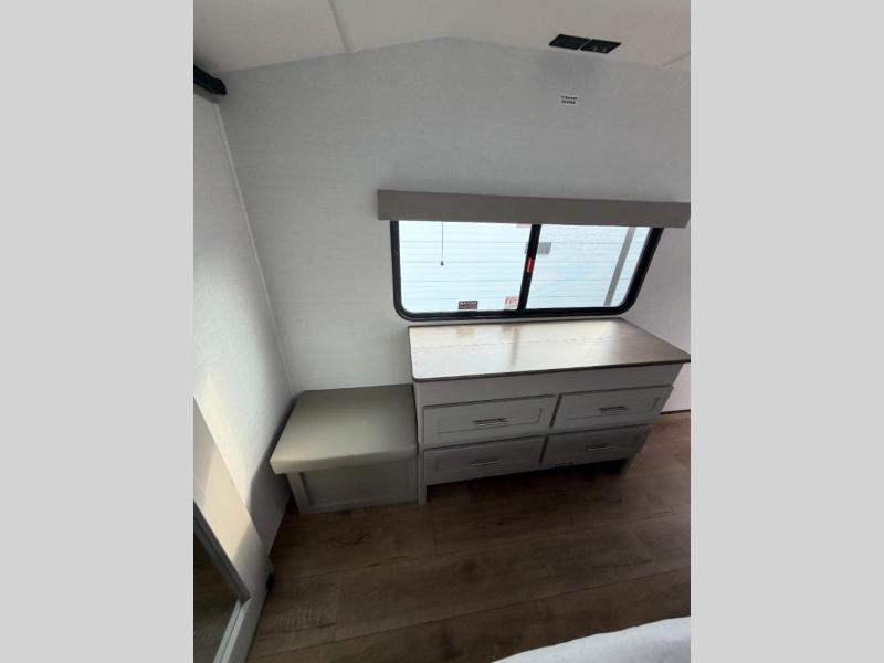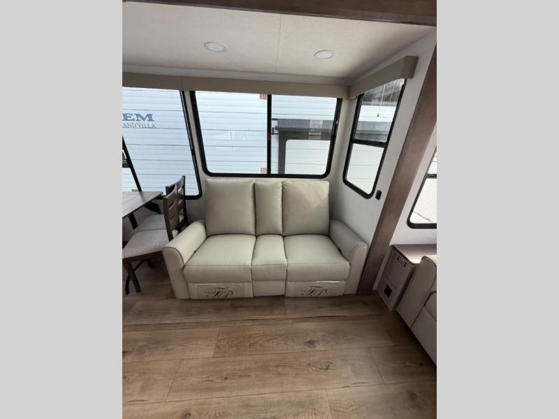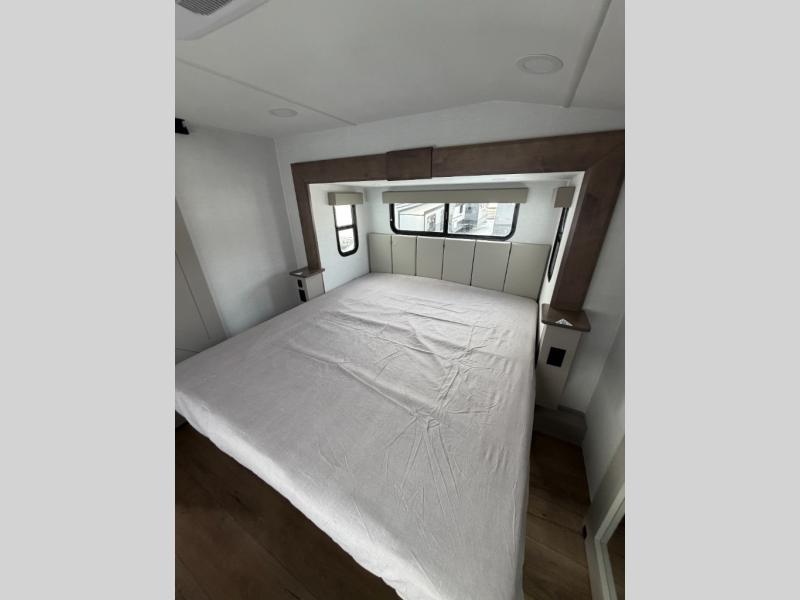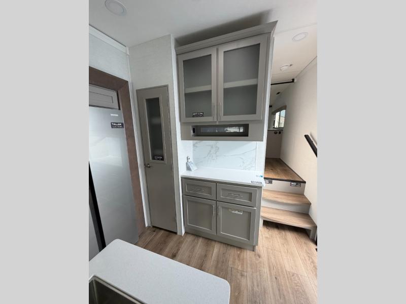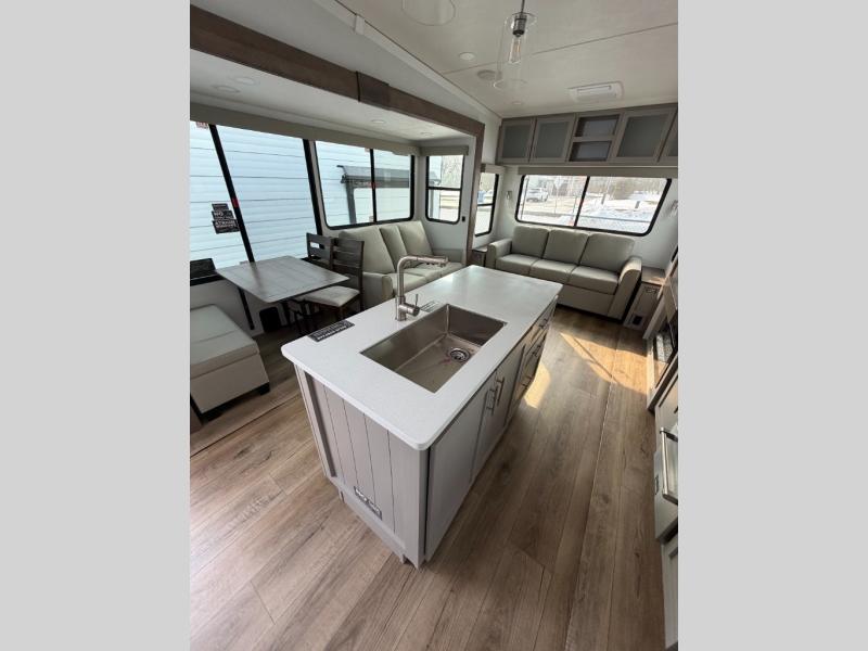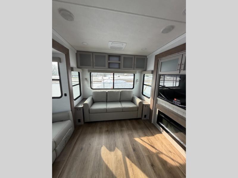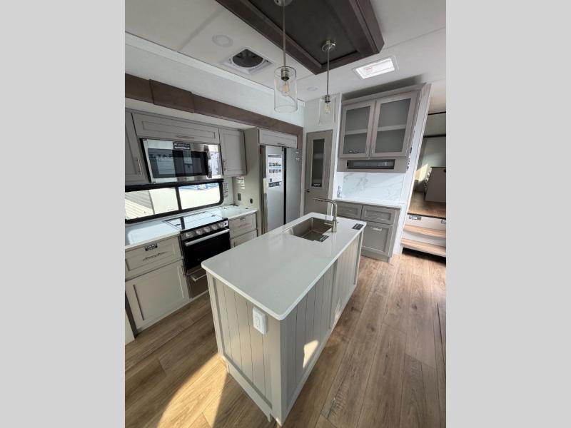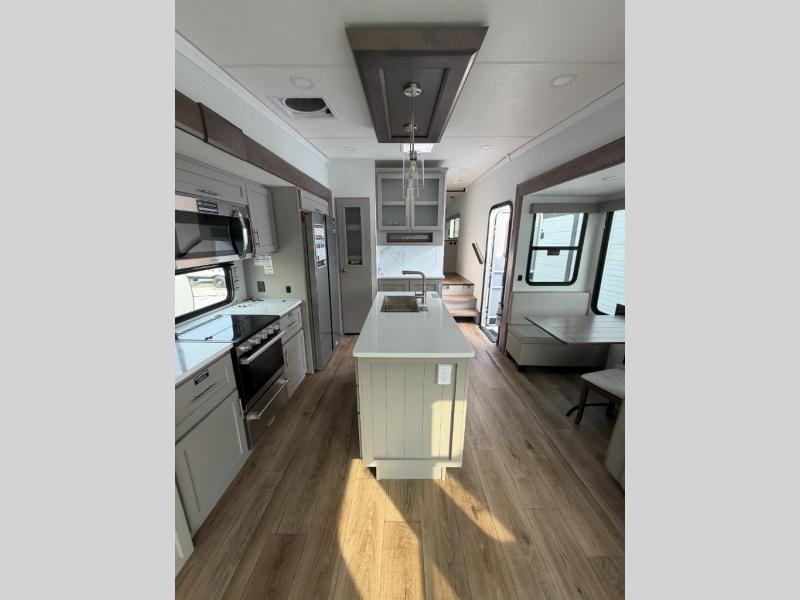 A kitchen island with countertop space makes it easy to prepare meals in this fifth wheel! The floating dinette table has two chairs on one side and a movable ottoman with flip up storage on the other side to keep your games or extra table cloths in. You can store your dishes and snacks inside the hutch/pantry or in the second pantry. The front private bedroom has a queen bed slide but can be switched out for the optional king bed if you like. There is also a dresser and large wardrobe for storage, and either side of the wardrobe with washer and dryer prep. The rear living area features a dual recliner theater seat across from an entertainment center with a 50" class HDTV with hidden storage behind it, and is also on a swing mount for all to see even at the rear sleeper sofa!