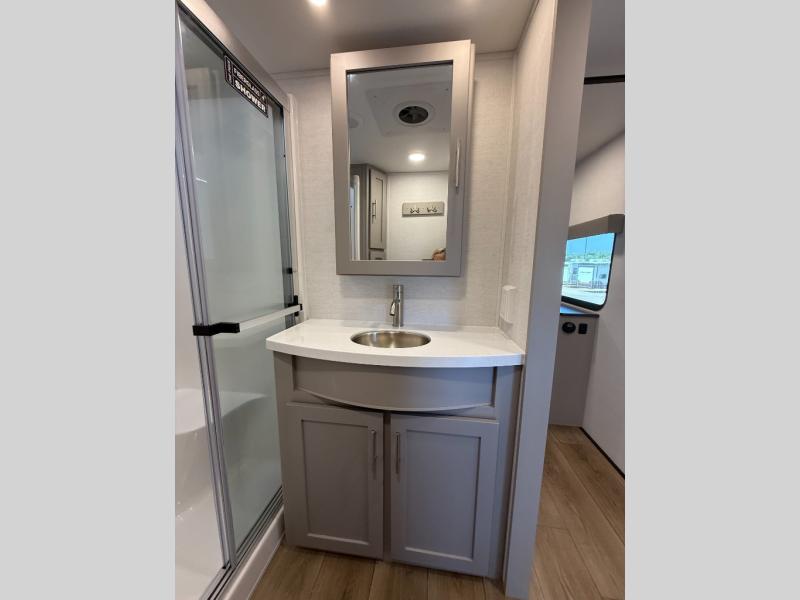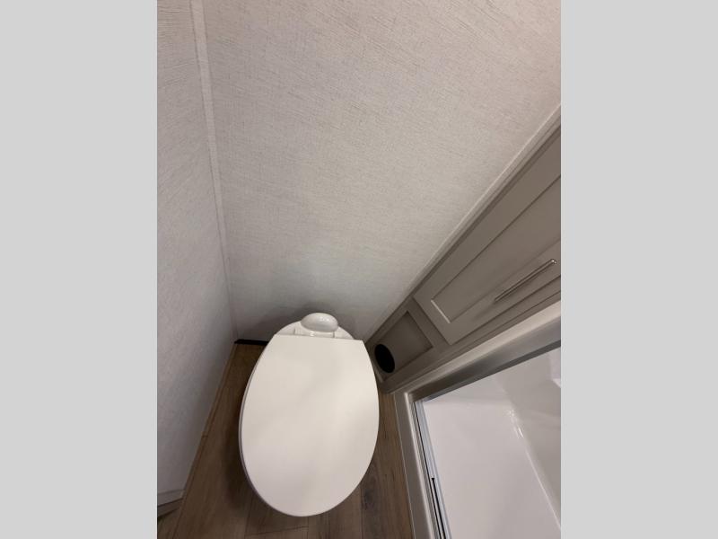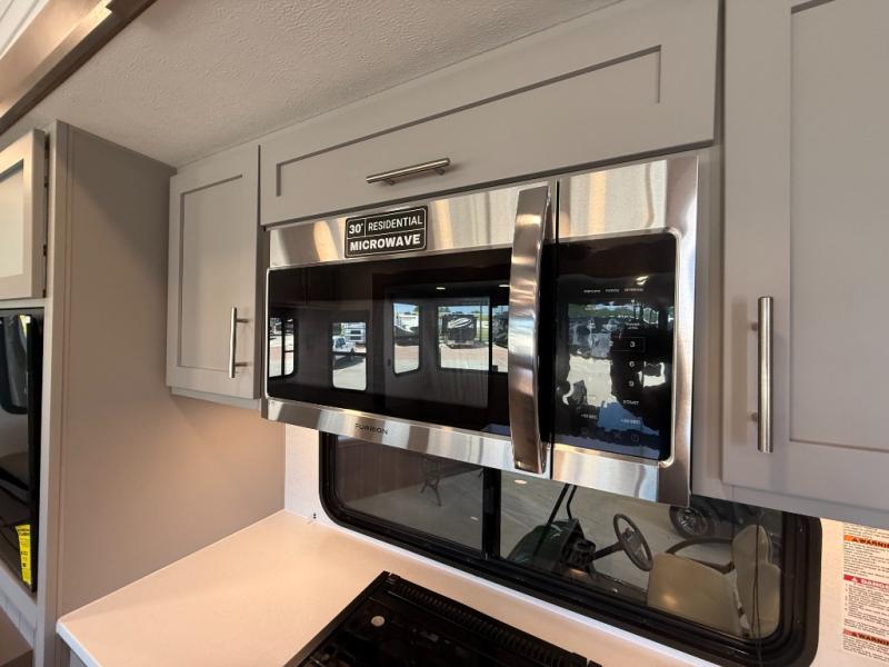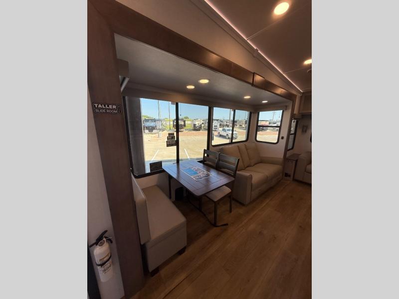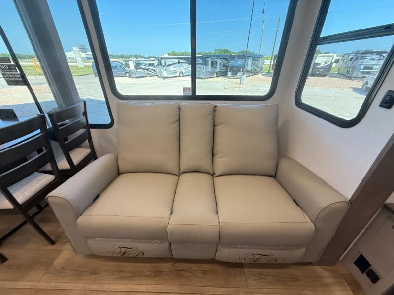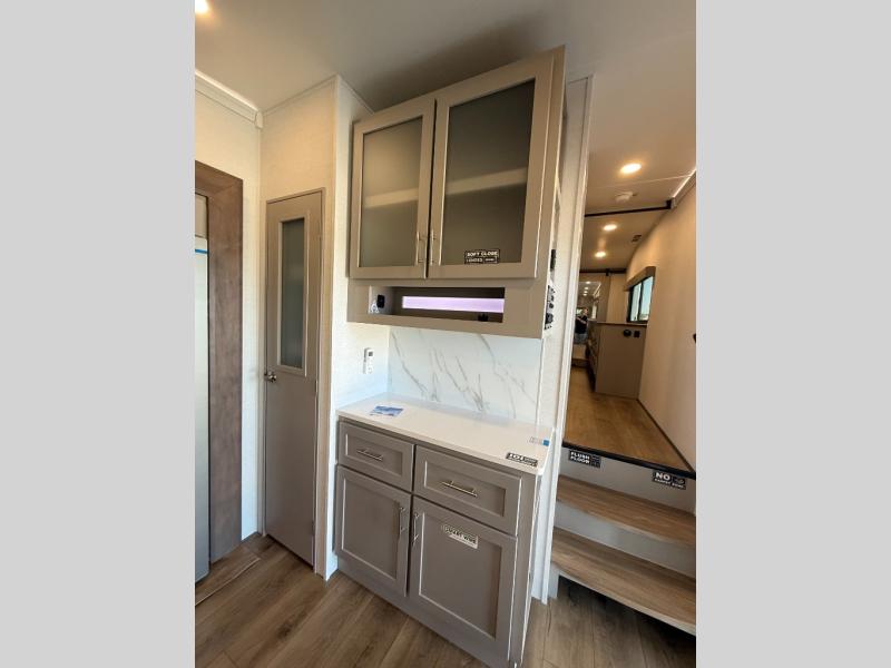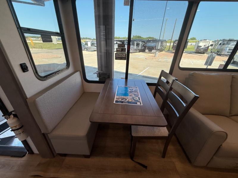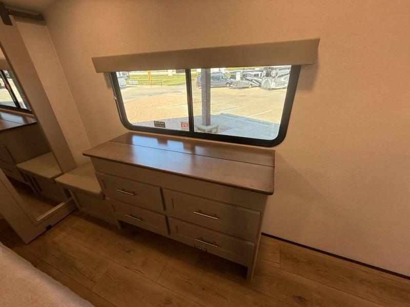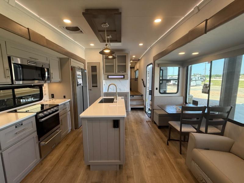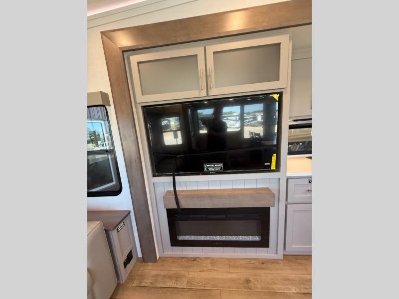 A kitchen island with countertop space makes it easy to prepare meals in this fifth wheel! The floating dinette table has two chairs on one side and a movable ottoman with flip up storage on the other side to keep your games or extra table cloths in. You can store your dishes and snacks inside the hutch/pantry or in the second pantry. The front private bedroom has a queen bed slide but can be switched out for the optional king bed if you like. There is also a dresser and large wardrobe for storage, and either side of the wardrobe with washer and dryer prep. The rear living area features a dual recliner theater seat across from an entertainment center with a 50" class HDTV with hidden storage behind it, and is also on a swing mount for all to see even at the rear sleeper sofa!