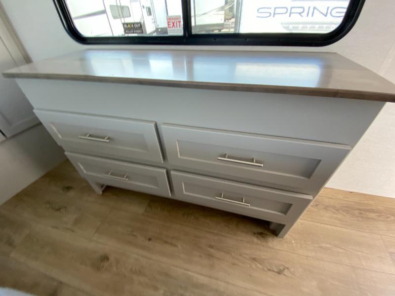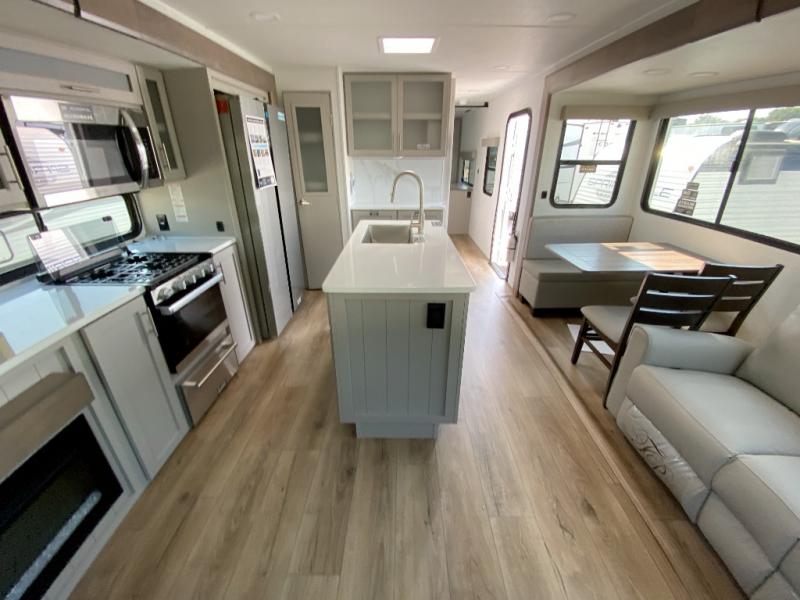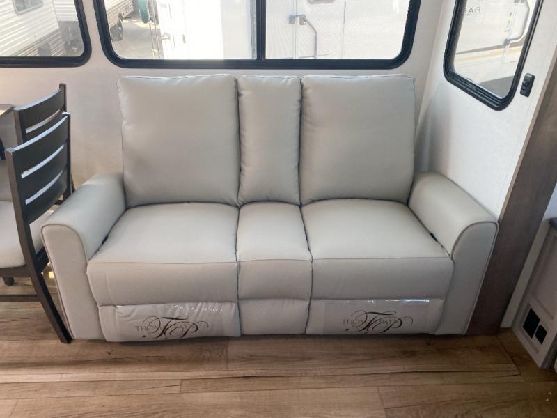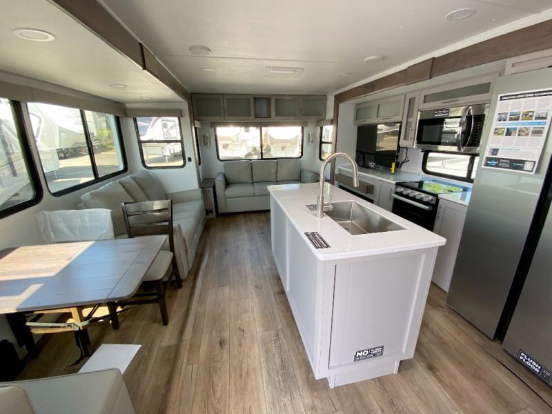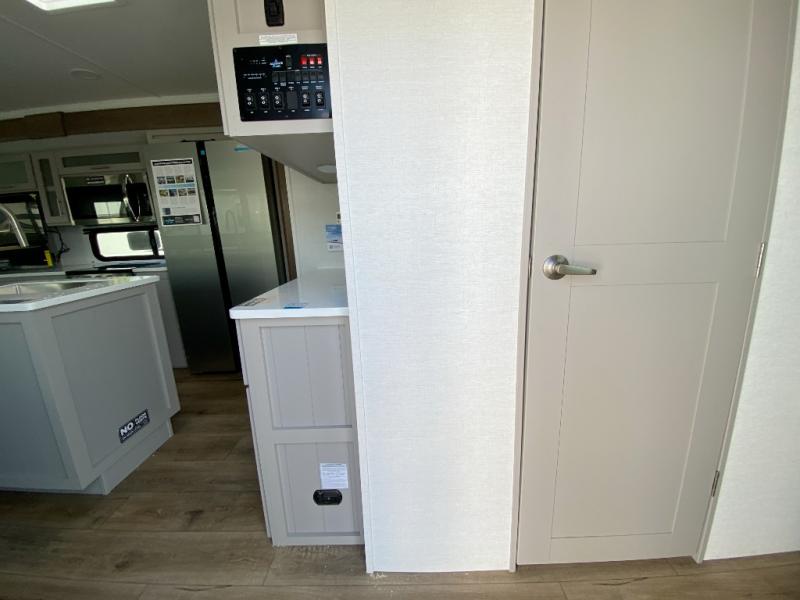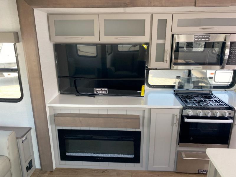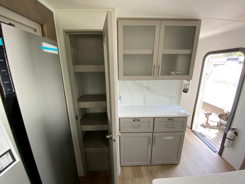 A kitchen island with countertop space makes it easy to prepare meals in this travel trailer! The floating dinette table has two chairs on one side and a movable ottoman with flip up storage on the other side to keep your games or extra table cloths in. You can store your dishes and snacks inside the hutch/pantry or in the second pantry. The front private bedroom has a queen bed slide but can be switched out for the optional king bed if you like. There is also a dresser and large wardrobe with shelving plus washer and dryer prep if you choose to add those appliances. The rear living area features a dual recliner theater seat across from an entertainment center with a 50" class HDTV with hidden storage behind it, and is also on a swing mount for all to see even at the rear sleeper sofa!
