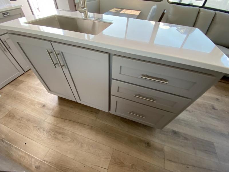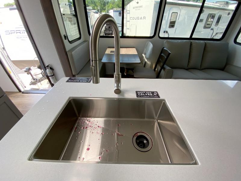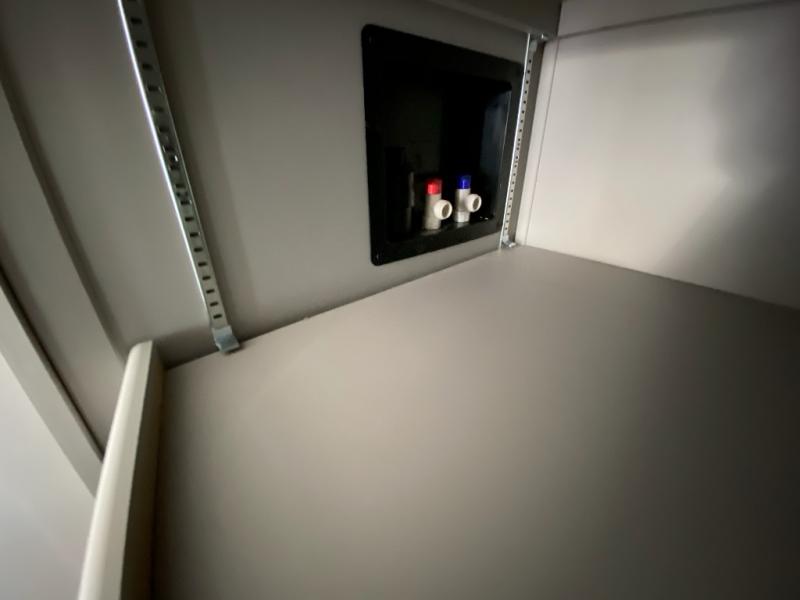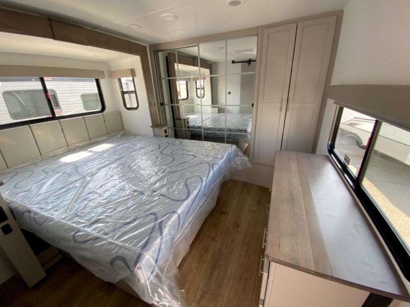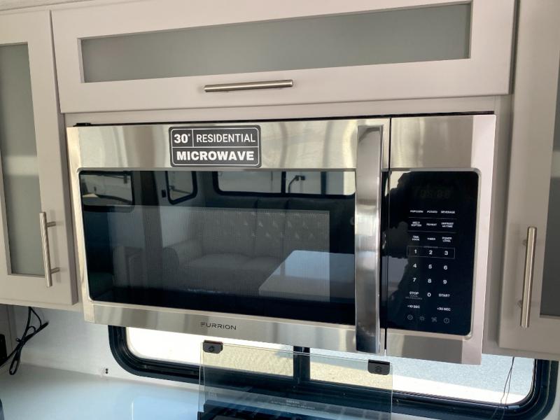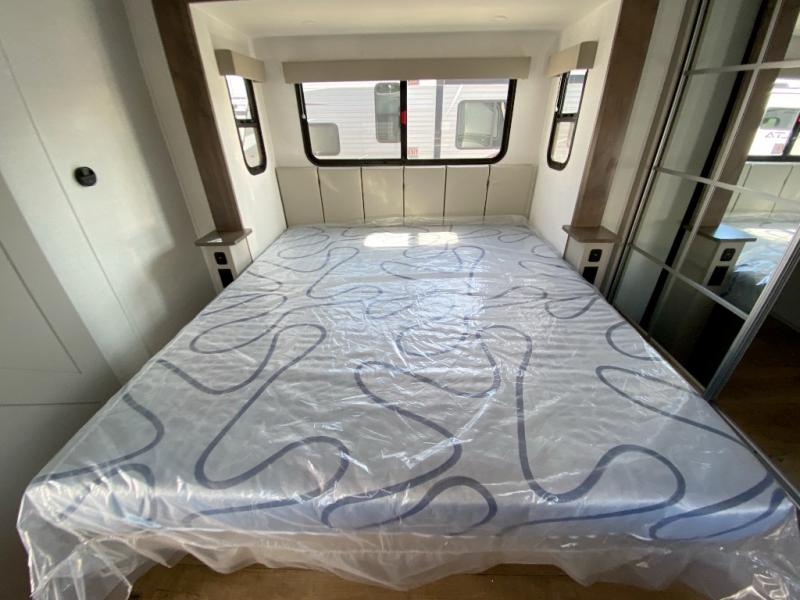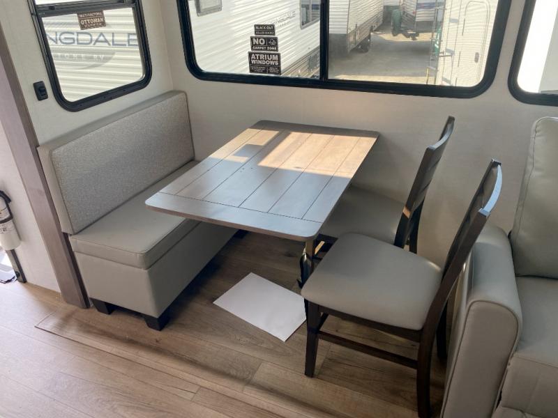 A kitchen island with countertop space makes it easy to prepare meals in this travel trailer! The floating dinette table has two chairs on one side and a movable ottoman with flip up storage on the other side to keep your games or extra table cloths in. You can store your dishes and snacks inside the hutch/pantry or in the second pantry. The front private bedroom has a queen bed slide but can be switched out for the optional king bed if you like. There is also a dresser and large wardrobe with shelving plus washer and dryer prep if you choose to add those appliances. The rear living area features a dual recliner theater seat across from an entertainment center with a 50" class HDTV with hidden storage behind it, and is also on a swing mount for all to see even at the rear sleeper sofa!