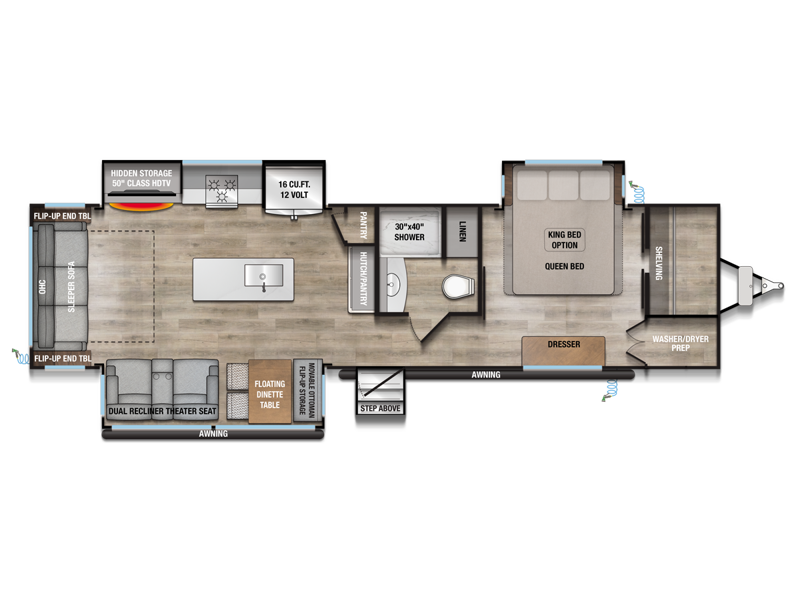 - Upon entry via quad steps, you’re welcomed into a spacious living and kitchen area with a dual recliner theater seat, floating dinette table, and movable ottoman with flip-up storage