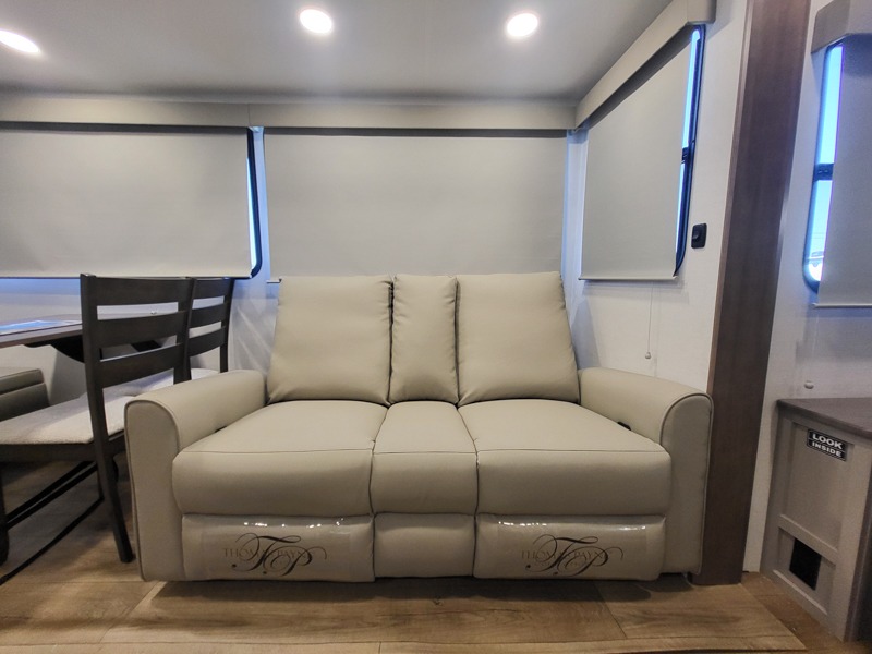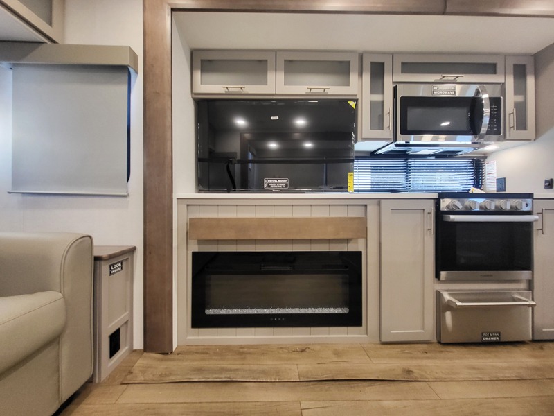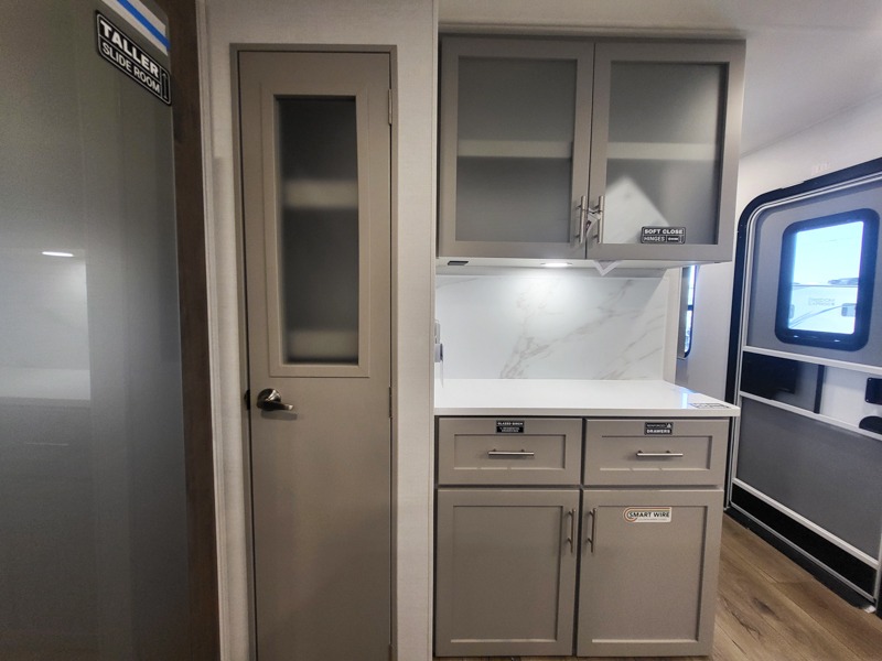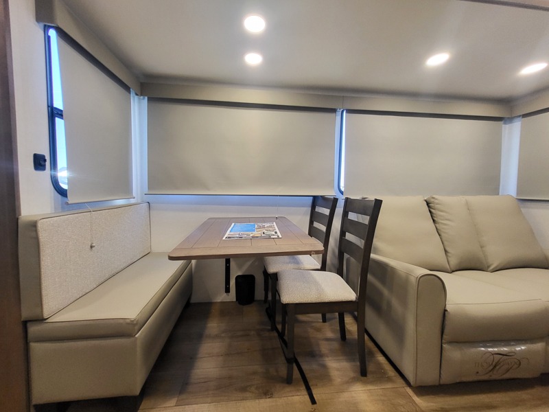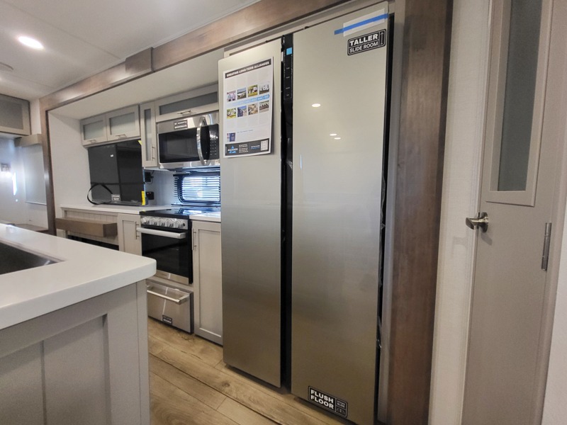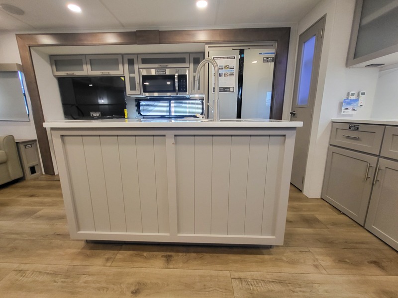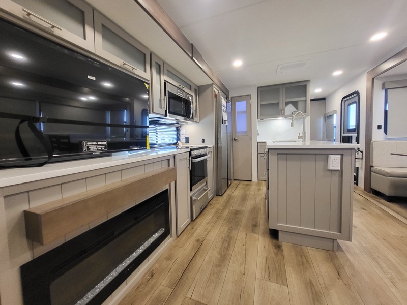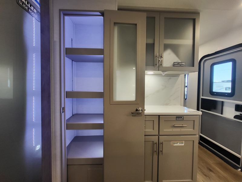 A kitchen island with countertop space makes it easy to prepare meals in this travel trailer! The floating dinette table has two chairs on one side and a movable ottoman with flip up storage on the other side to keep your games or extra table cloths in. You can store your dishes and snacks inside the hutch/pantry or in the second pantry. The front private bedroom has a queen bed slide but can be switched out for the optional king bed if you like. There is also a dresser and large wardrobe with shelving plus washer and dryer prep if you choose to add those appliances. The rear living area features a dual recliner theater seat across from an entertainment center with a 50" class HDTV with hidden storage behind it, and is also on a swing mount for all to see even at the rear sleeper sofa!