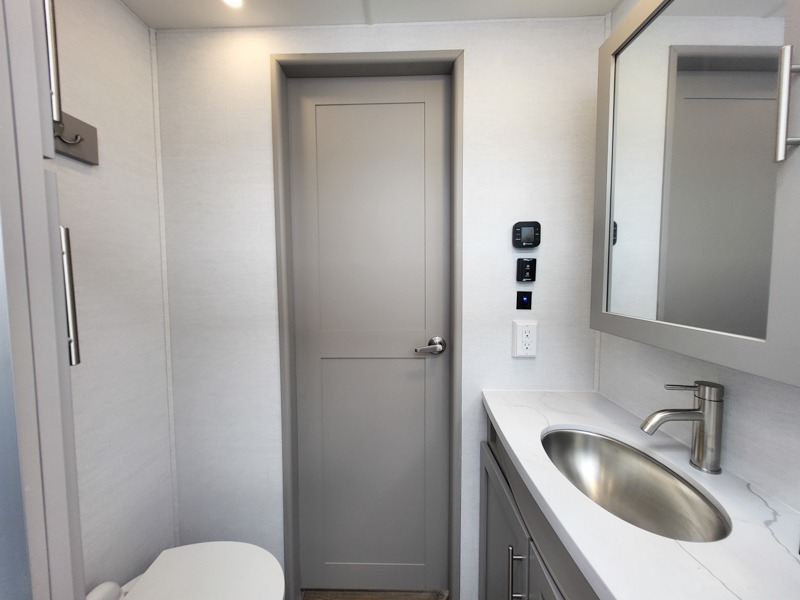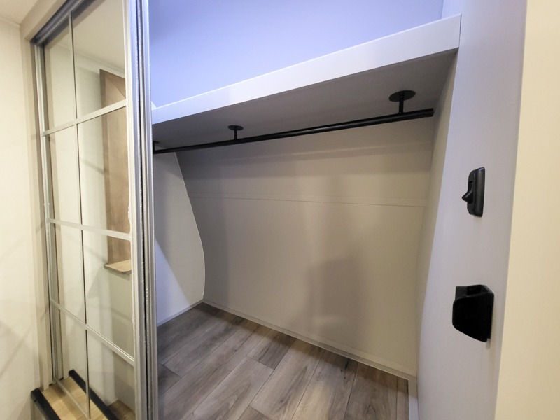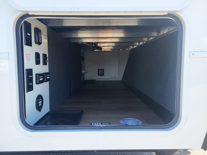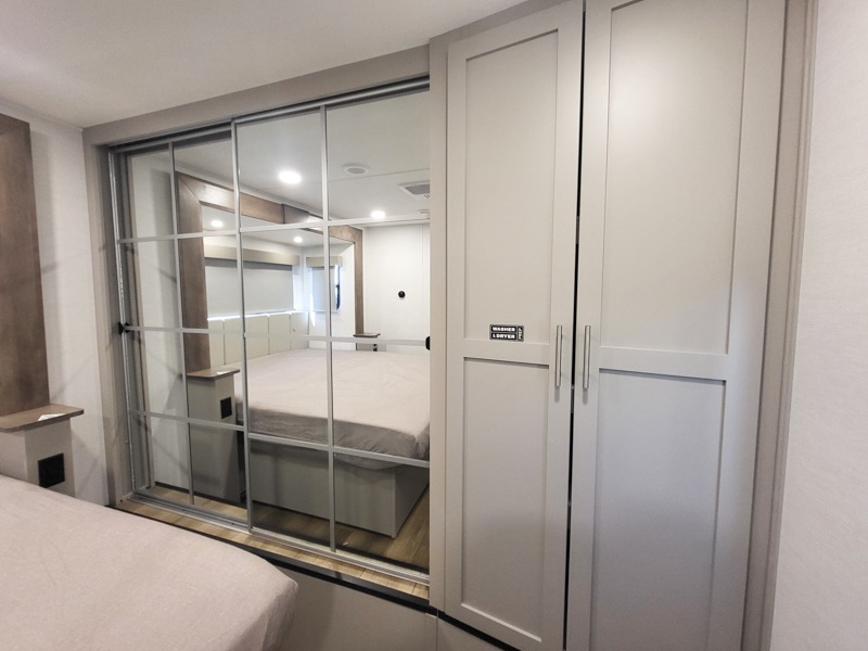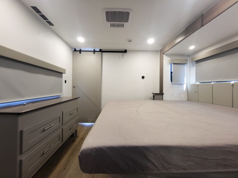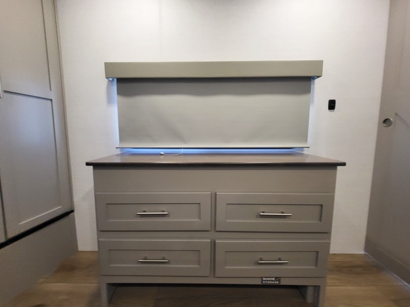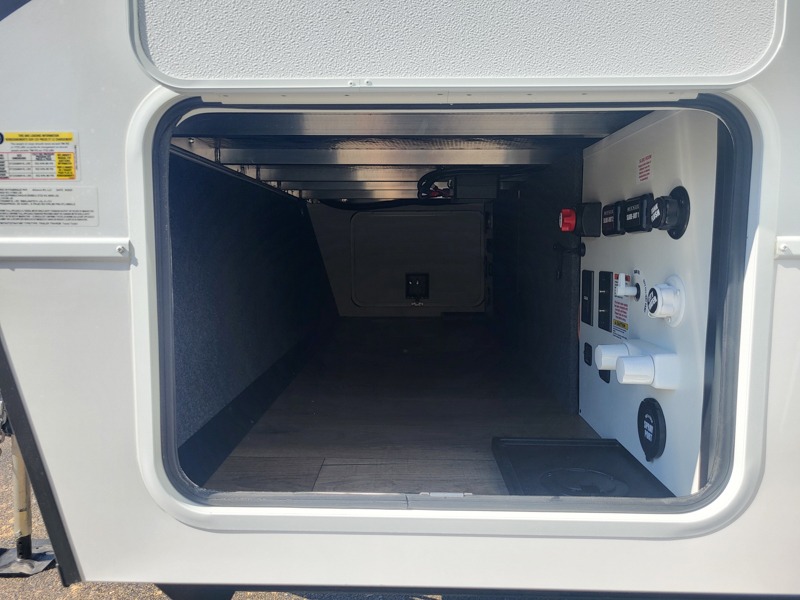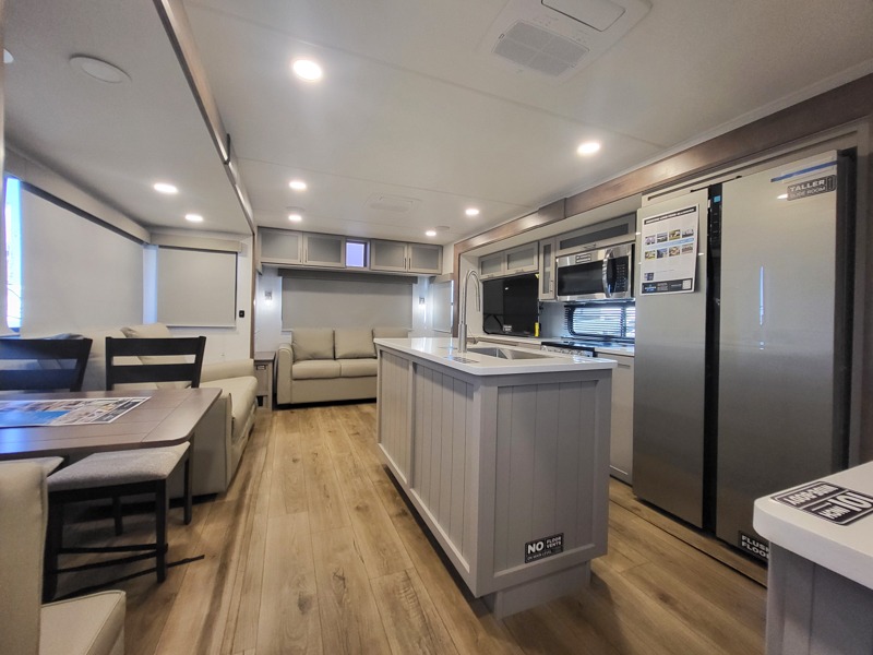 A kitchen island with countertop space makes it easy to prepare meals in this travel trailer! The floating dinette table has two chairs on one side and a movable ottoman with flip up storage on the other side to keep your games or extra table cloths in. You can store your dishes and snacks inside the hutch/pantry or in the second pantry. The front private bedroom has a queen bed slide but can be switched out for the optional king bed if you like. There is also a dresser and large wardrobe with shelving plus washer and dryer prep if you choose to add those appliances. The rear living area features a dual recliner theater seat across from an entertainment center with a 50" class HDTV with hidden storage behind it, and is also on a swing mount for all to see even at the rear sleeper sofa!