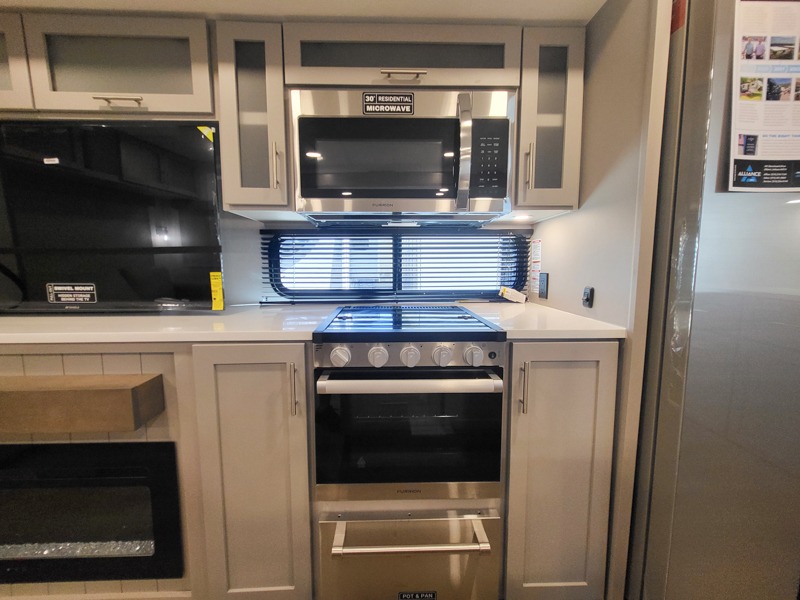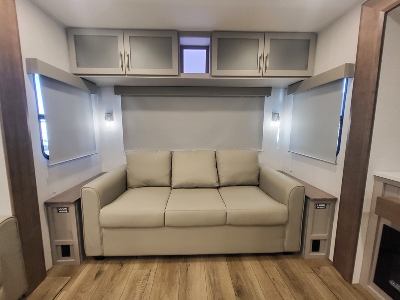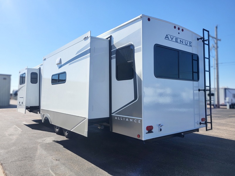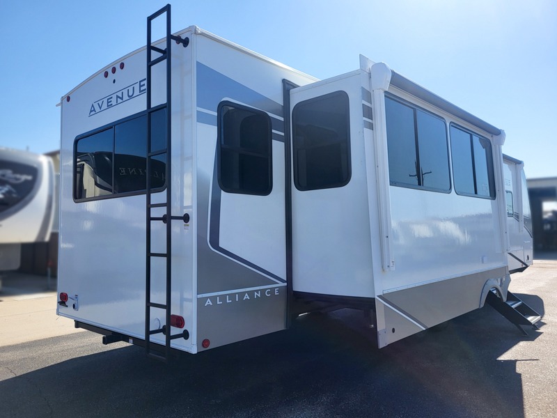 With any Avenue fifth wheel or travel trailer by Alliance RV, you will enjoy more interior space provided by the 8' 5" wide-body construction, and a long list of luxury features. Each is built with Azdel composite sidewalls both inside and out, along with a PVC roof for added strength. There are innovative storage solutions that include hidden storage behind the TV, within end tables and ottomans, and more. Since these units feature no carpet throughout, cleaning will be easier than ever, and there are flush floor slides throughout for seamless living spaces. The Avenue also comes with the OTG Solar Package with a 400 watt solar panel, inverter prep, multiple outlets, and more to keep you charged up!