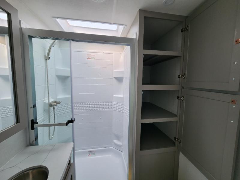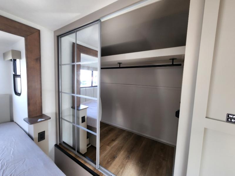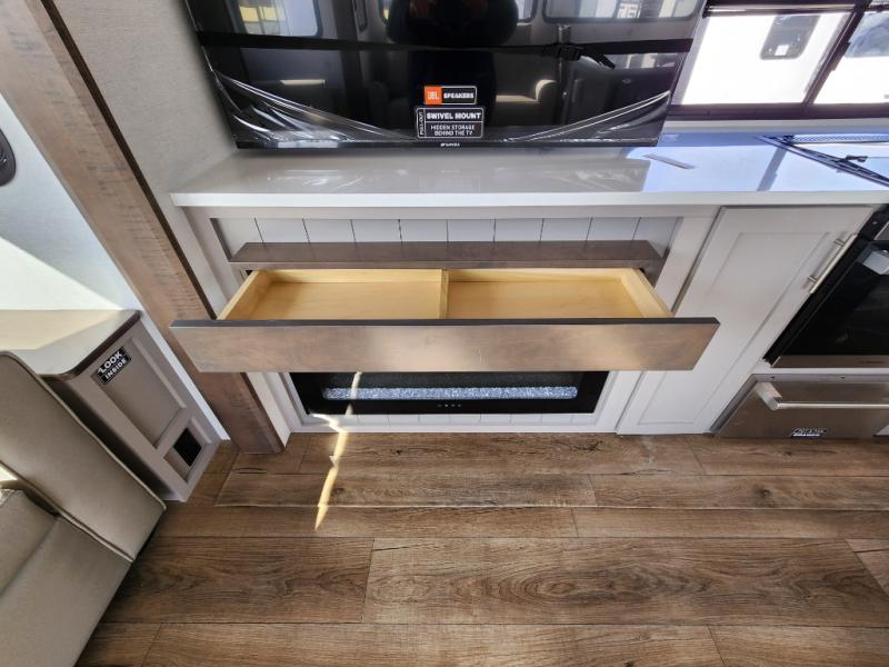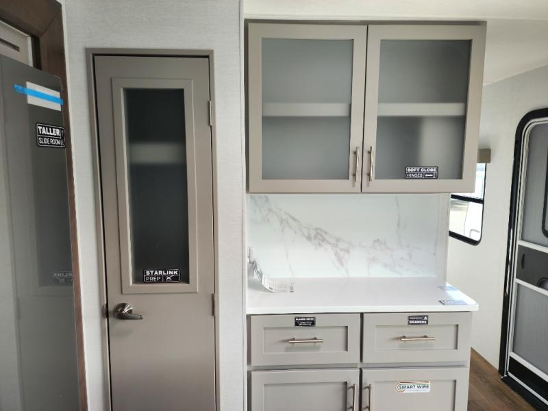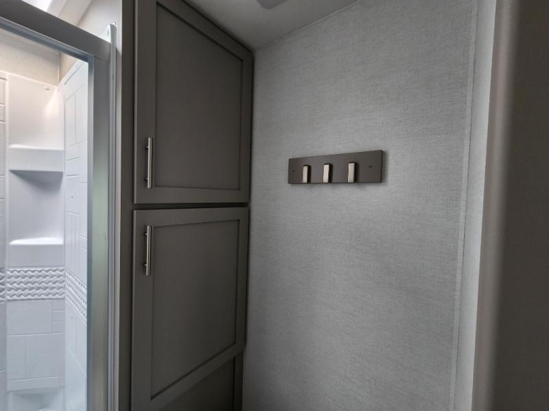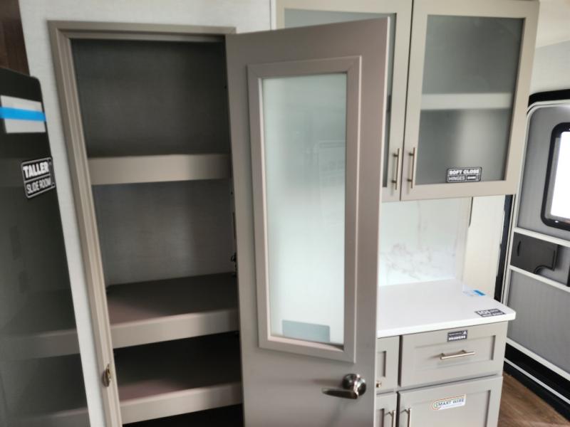 A kitchen island with countertop space makes it easy to prepare meals in this travel trailer! The floating dinette table has two chairs on one side and a movable ottoman with flip up storage on the other side to keep your games or extra table cloths in. You can store your dishes and snacks inside the hutch/pantry or in the second pantry. The front private bedroom has a queen bed slide but can be switched out for the optional king bed if you like. There is also a dresser and large wardrobe with shelving plus washer and dryer prep if you choose to add those appliances. The rear living area features a dual recliner theater seat across from an entertainment center with a 50" class HDTV with hidden storage behind it, and is also on a swing mount for all to see even at the rear sleeper sofa!