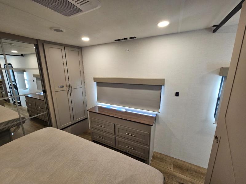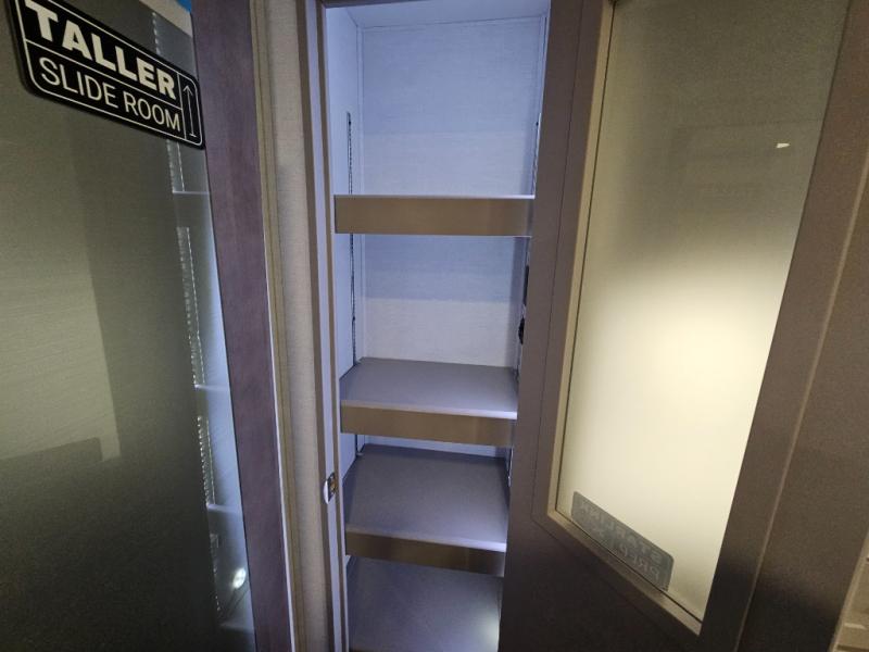 A kitchen island with countertop space makes it easy to prepare meals in this travel trailer! The floating dinette table has two chairs on one side and a movable ottoman with flip up storage on the other side to keep your games or extra table cloths in. You can store your dishes and snacks inside the hutch/pantry or in the second pantry. The front private bedroom has a queen bed slide but can be switched out for the optional king bed if you like. There is also a dresser and large wardrobe with shelving plus washer and dryer prep if you choose to add those appliances. The rear living area features a dual recliner theater seat across from an entertainment center with a 50" class HDTV with hidden storage behind it, and is also on a swing mount for all to see even at the rear sleeper sofa!