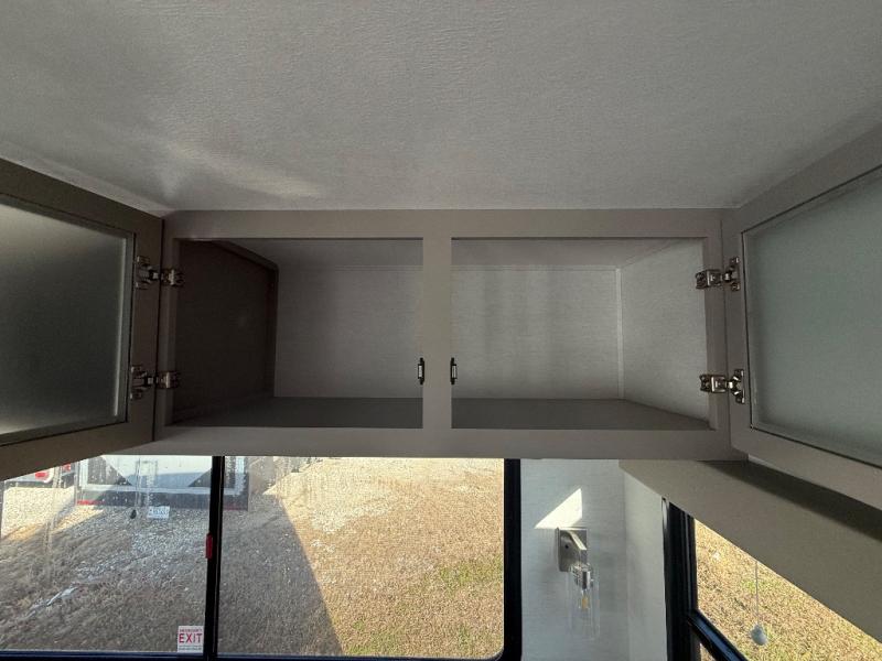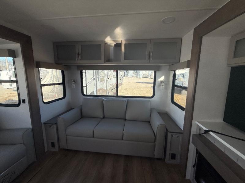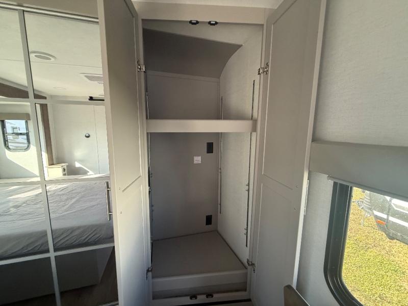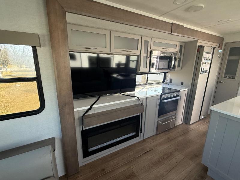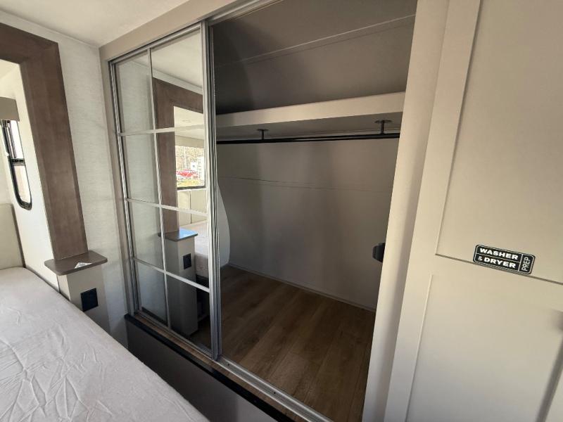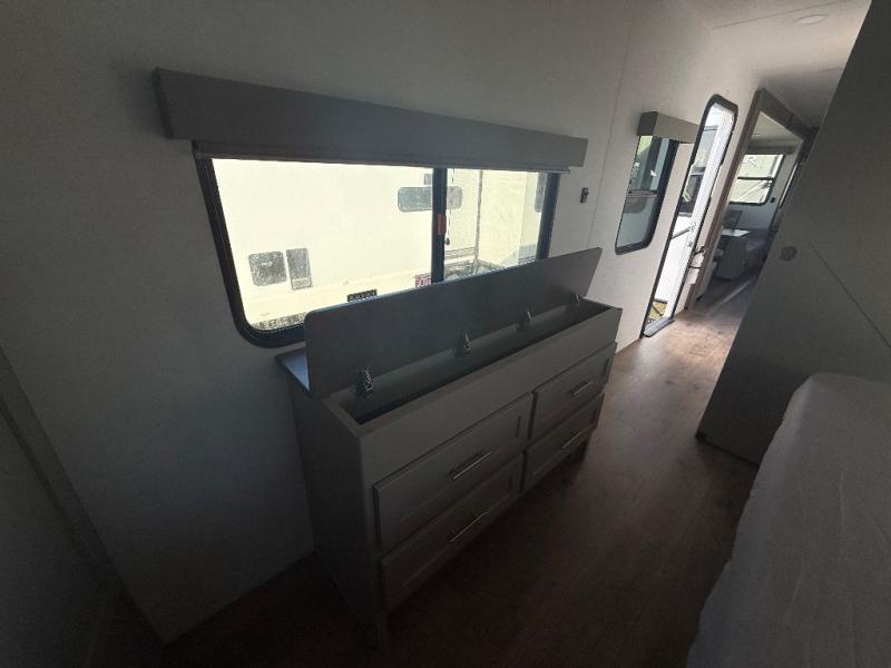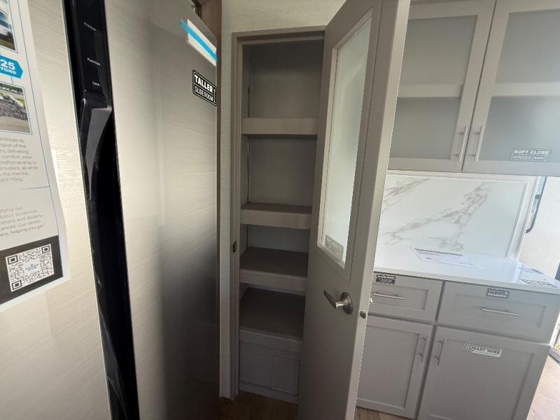 A kitchen island with countertop space makes it easy to prepare meals in this travel trailer! The floating dinette table has two chairs on one side and a movable ottoman with flip up storage on the other side to keep your games or extra table cloths in. You can store your dishes and snacks inside the hutch/pantry or in the second pantry. The front private bedroom has a queen bed slide but can be switched out for the optional king bed if you like. There is also a dresser and large wardrobe with shelving plus washer and dryer prep if you choose to add those appliances. The rear living area features a dual recliner theater seat across from an entertainment center with a 50" class HDTV with hidden storage behind it, and is also on a swing mount for all to see even at the rear sleeper sofa!