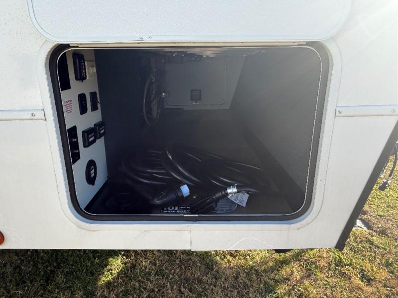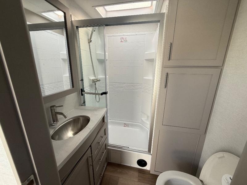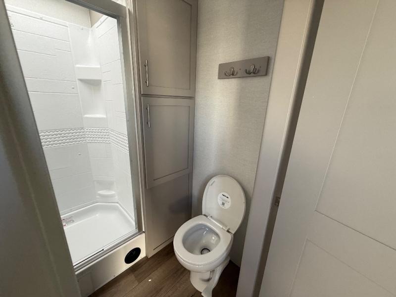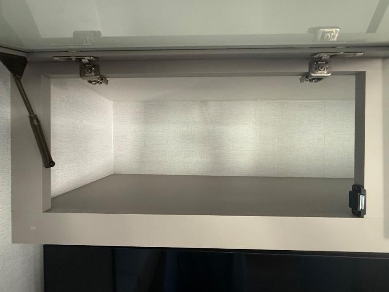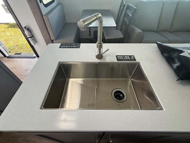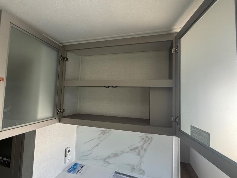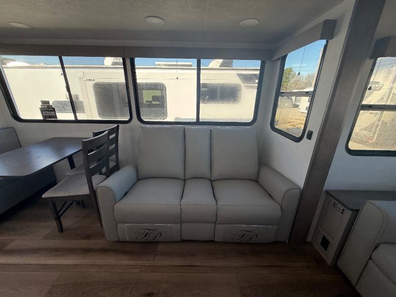 A kitchen island with countertop space makes it easy to prepare meals in this travel trailer! The floating dinette table has two chairs on one side and a movable ottoman with flip up storage on the other side to keep your games or extra table cloths in. You can store your dishes and snacks inside the hutch/pantry or in the second pantry. The front private bedroom has a queen bed slide but can be switched out for the optional king bed if you like. There is also a dresser and large wardrobe with shelving plus washer and dryer prep if you choose to add those appliances. The rear living area features a dual recliner theater seat across from an entertainment center with a 50" class HDTV with hidden storage behind it, and is also on a swing mount for all to see even at the rear sleeper sofa!