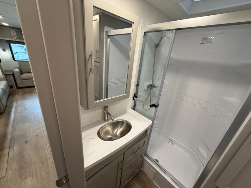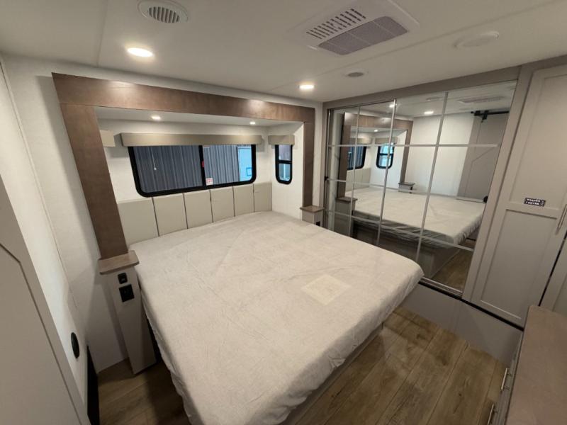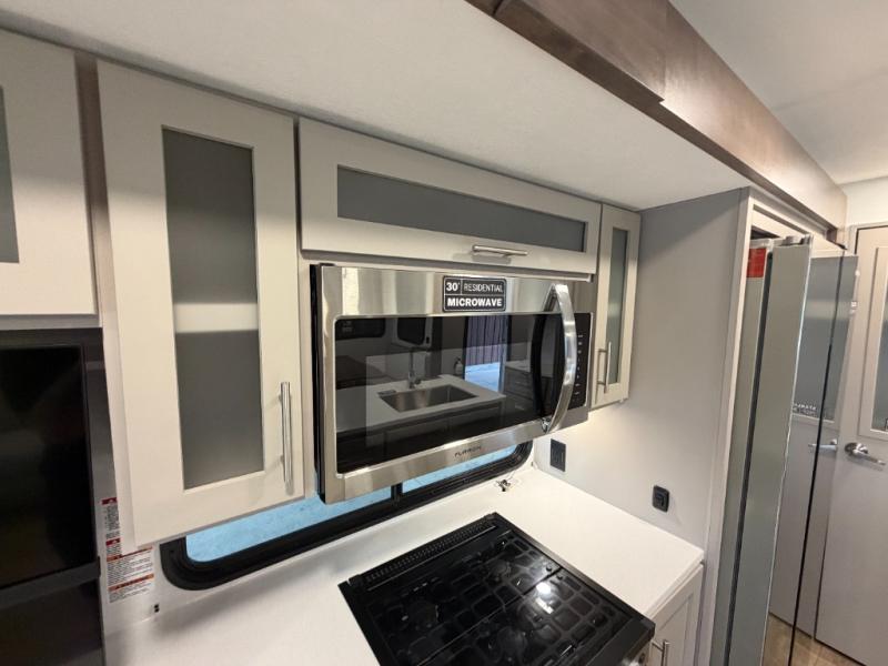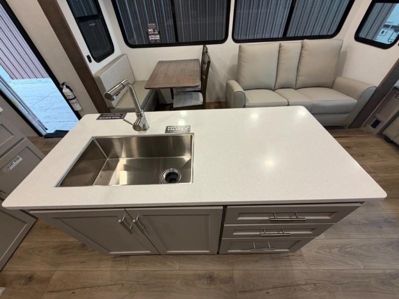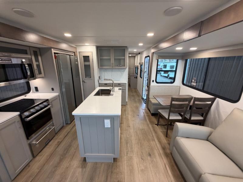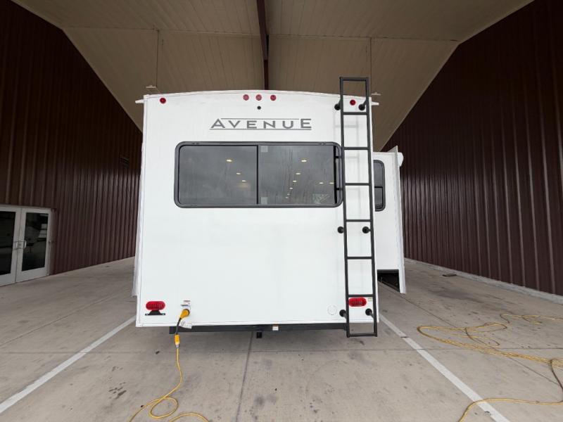 With any Avenue fifth wheel or travel trailer by Alliance RV, you will enjoy more interior space provided by the 8' 5" wide-body construction, and a long list of luxury features. Each is built with Azdel composite sidewalls both inside and out, along with a PVC roof for added strength. There are innovative storage solutions that include hidden storage behind the TV, within end tables and ottomans, and more. Since these units feature no carpet throughout, cleaning will be easier than ever, and there are flush floor slides throughout for seamless living spaces. The Avenue also comes with the OTG Solar Package with a 400 watt solar panel, inverter prep, multiple outlets, and more to keep you charged up!