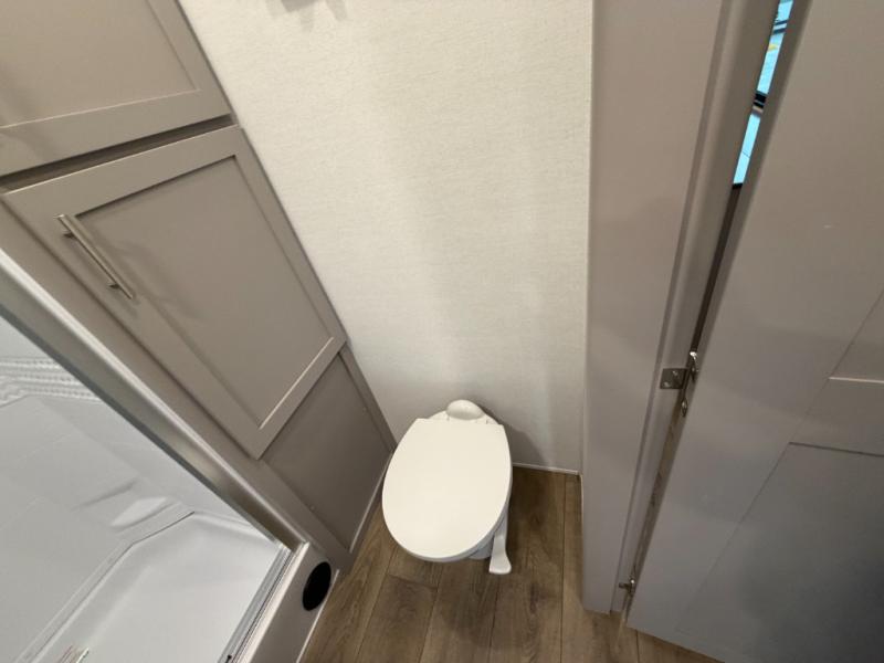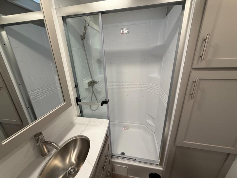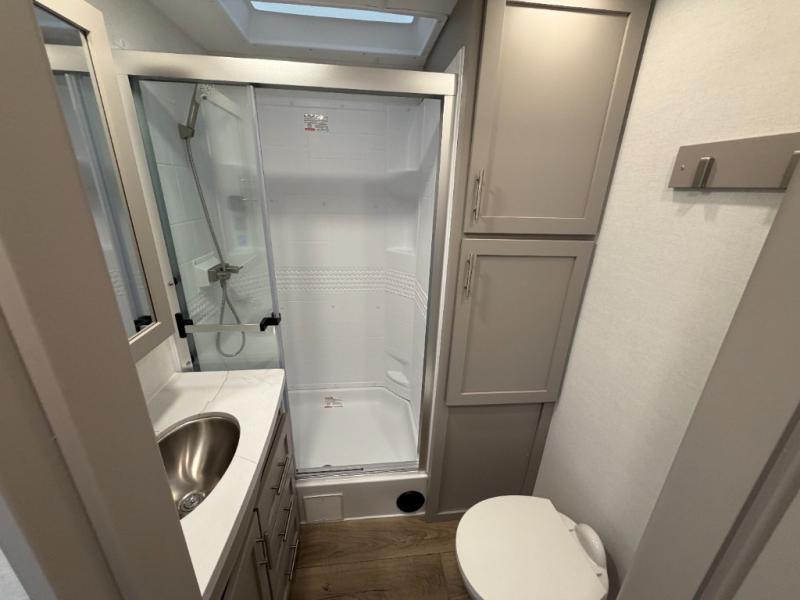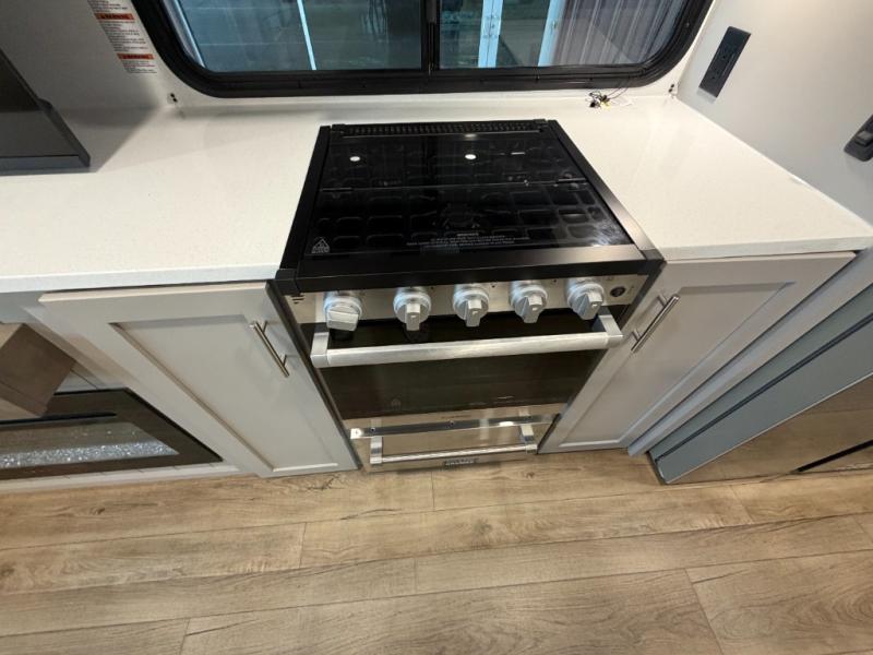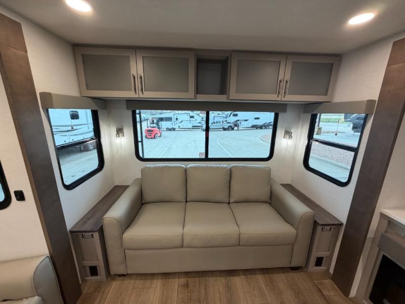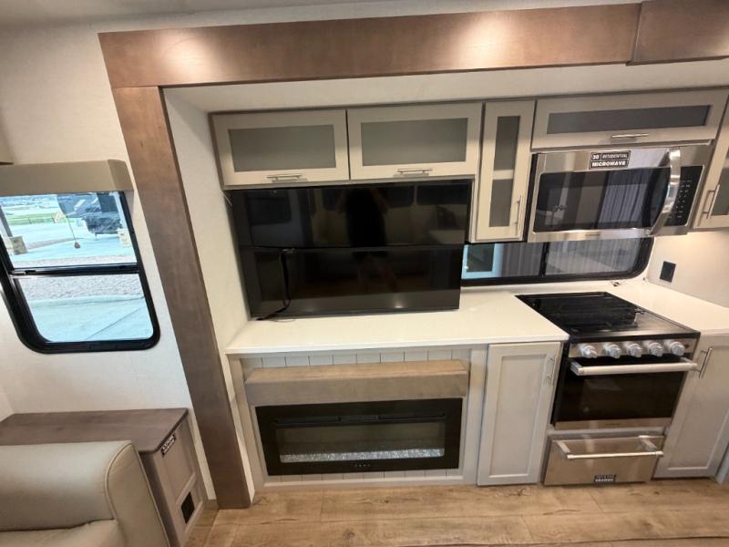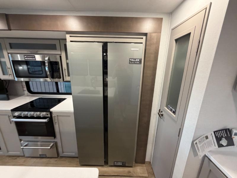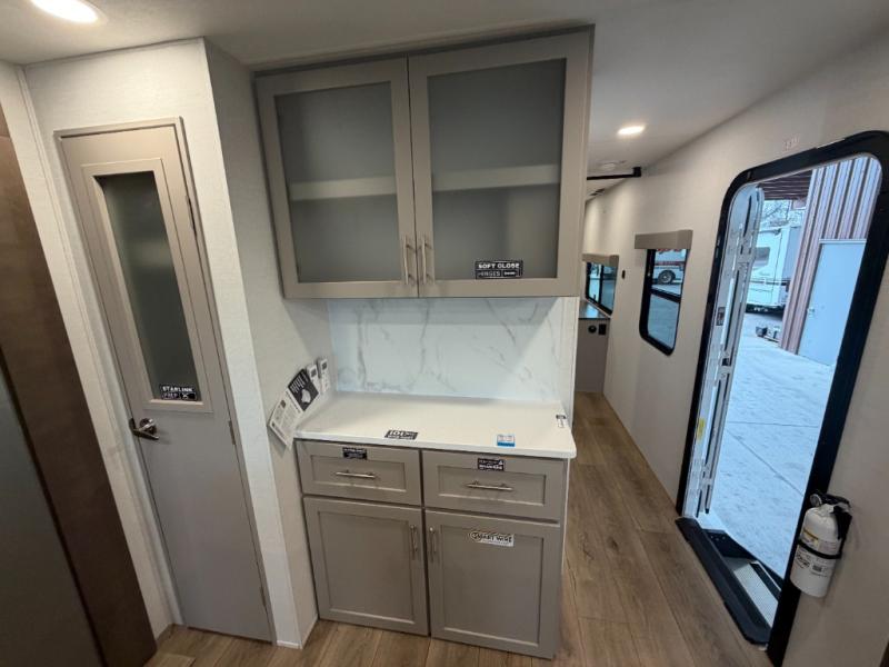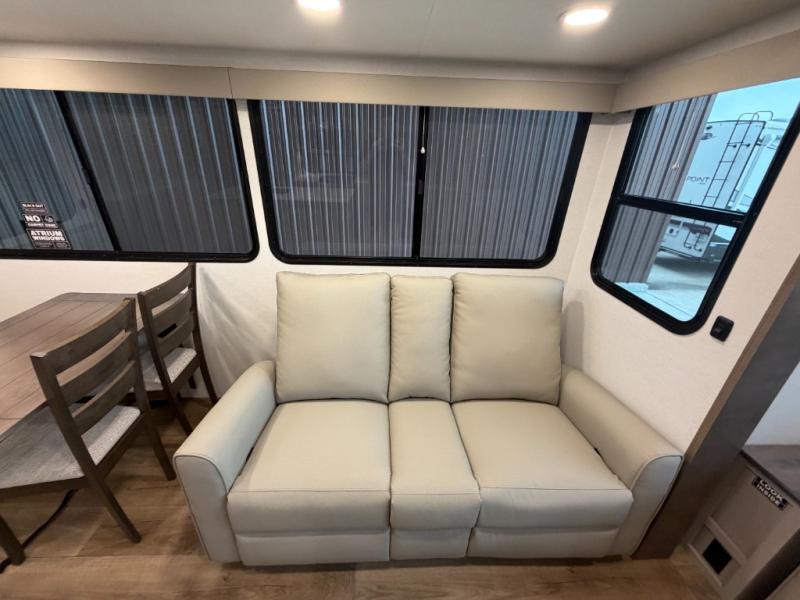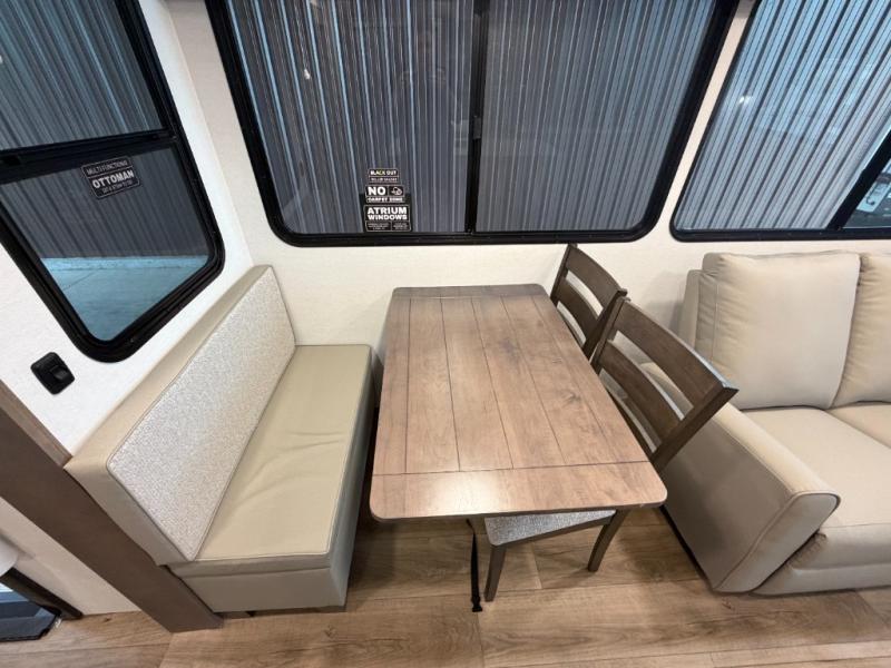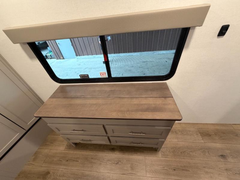A kitchen island with countertop space makes it easy to prepare meals in this travel trailer! The floating dinette table has two chairs on one side and a movable ottoman with flip up storage on the other side to keep your games or extra table cloths in. You can store your dishes and snacks inside the hutch/pantry or in the second pantry. The front private bedroom has a queen bed slide but can be switched out for the optional king bed if you like. There is also a dresser and large wardrobe with shelving plus washer and dryer prep if you choose to add those appliances. The rear living area features a dual recliner theater seat across from an entertainment center with a 50" class HDTV with hidden storage behind it, and is also on a swing mount for all to see even at the rear sleeper sofa!