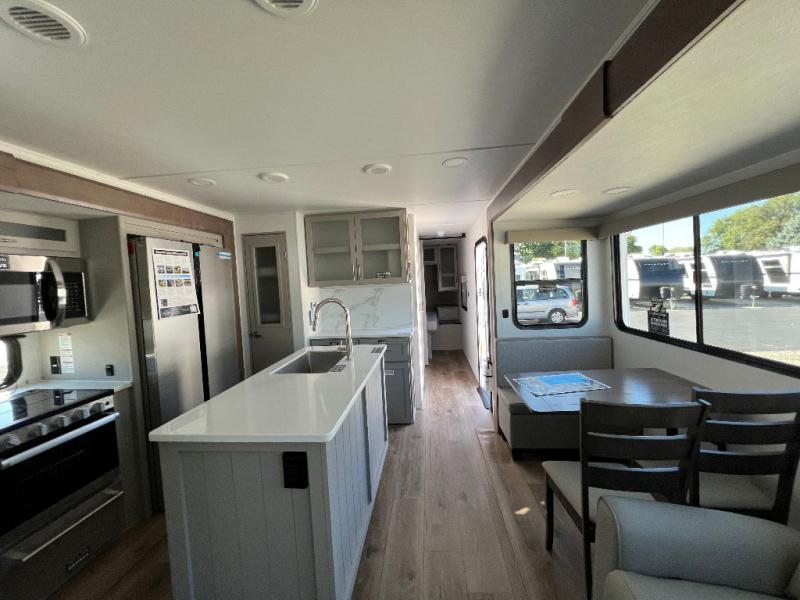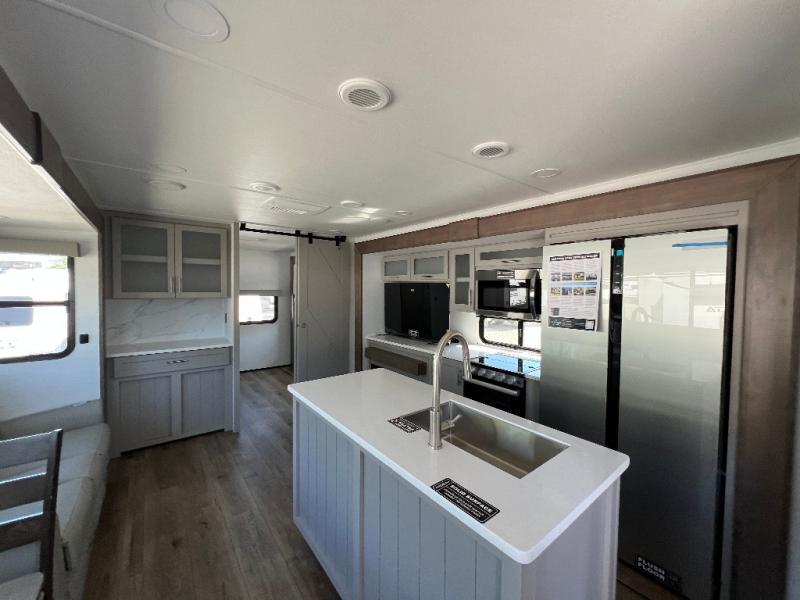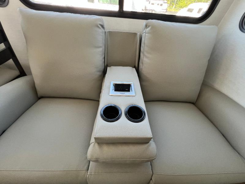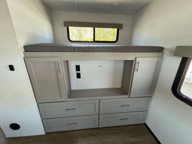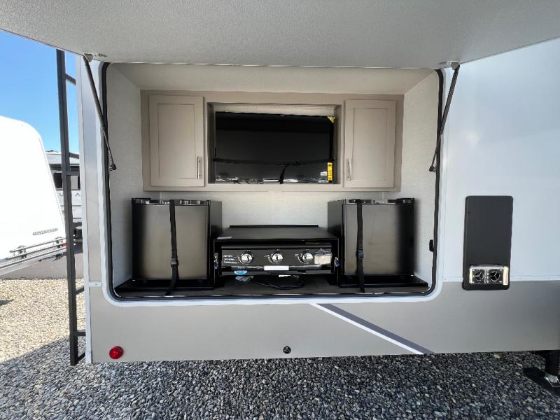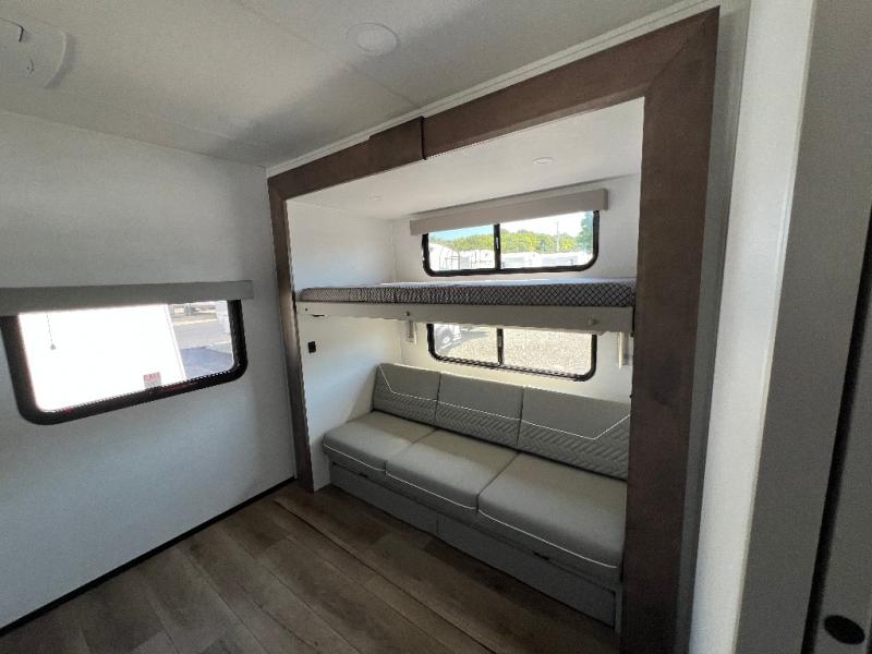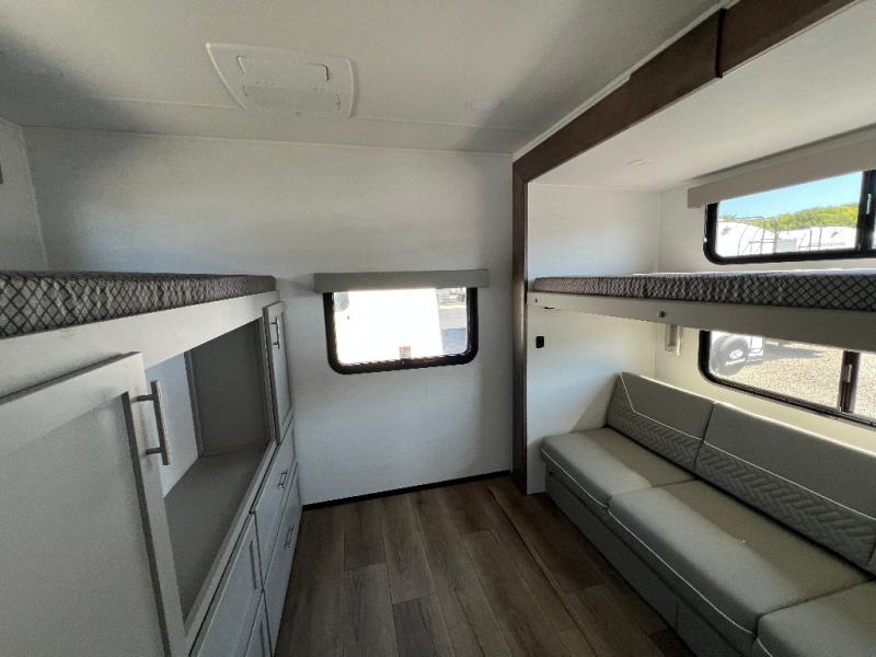 This travel trailer features a rear bunkhouse your guests or little ones are sure to love. There is a 40" x 72" bunk across from a slide out with a flip-up bunk above a cube sofa. There is also a tri-fold sofa with a pull-out trundle bed for even more sleeping space. You will enjoy the front private bedroom all to yourselves with a queen bed and king bed option, dual nightstands, and a wardrobe with washer and dryer prep. The middle living area and kitchen includes dual opposing slides for more space, a kitchen island to prep meals, and a dual recliner theater seat across from the 50" HDTV for movie nights. If the weather is nice, you may just want to make it an outdoor movie night since there is a 40" exterior TV!