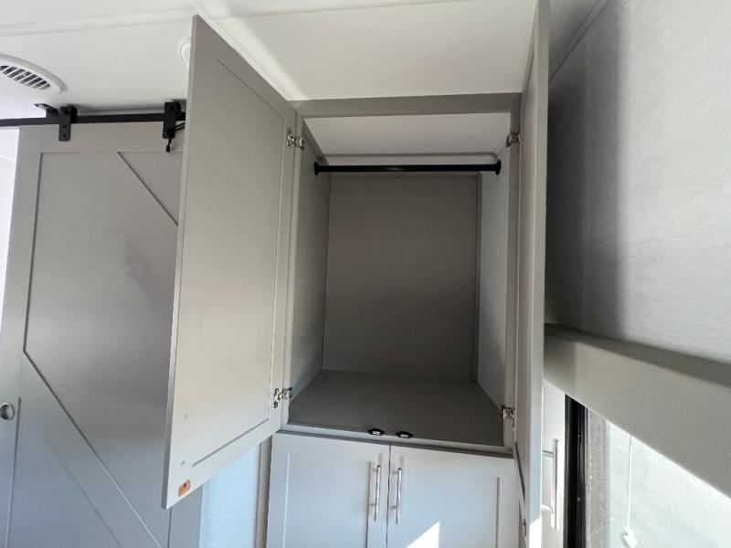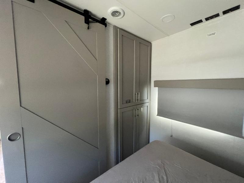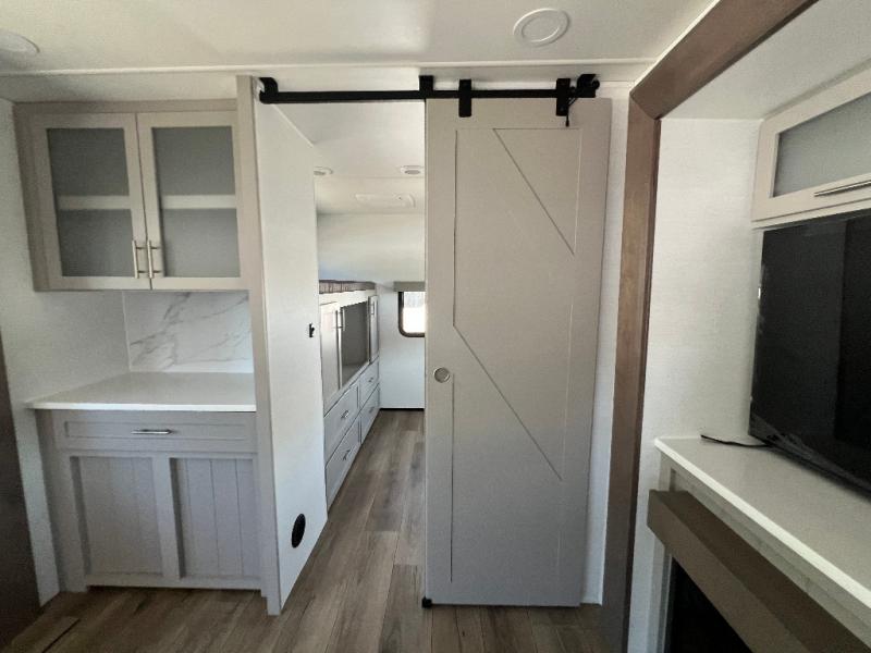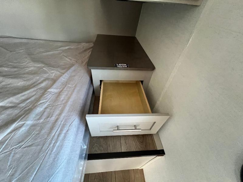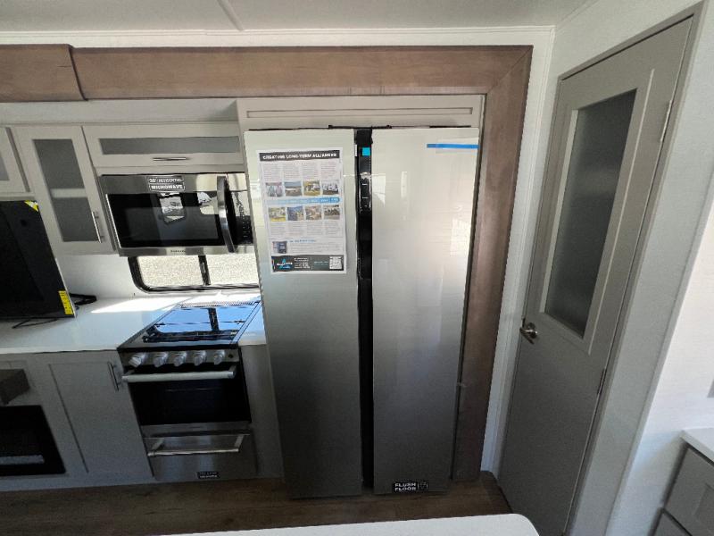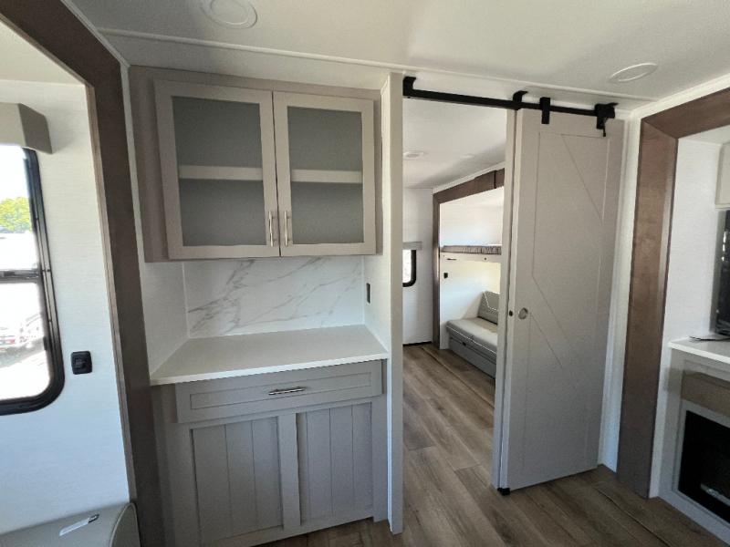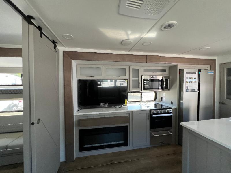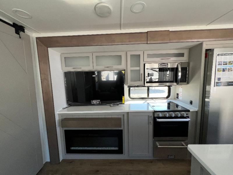 This travel trailer features a rear bunkhouse your guests or little ones are sure to love. There is a 40" x 72" bunk across from a slide out with a flip-up bunk above a cube sofa. There is also a tri-fold sofa with a pull-out trundle bed for even more sleeping space. You will enjoy the front private bedroom all to yourselves with a queen bed and king bed option, dual nightstands, and a wardrobe with washer and dryer prep. The middle living area and kitchen includes dual opposing slides for more space, a kitchen island to prep meals, and a dual recliner theater seat across from the 50" HDTV for movie nights. If the weather is nice, you may just want to make it an outdoor movie night since there is a 40" exterior TV!