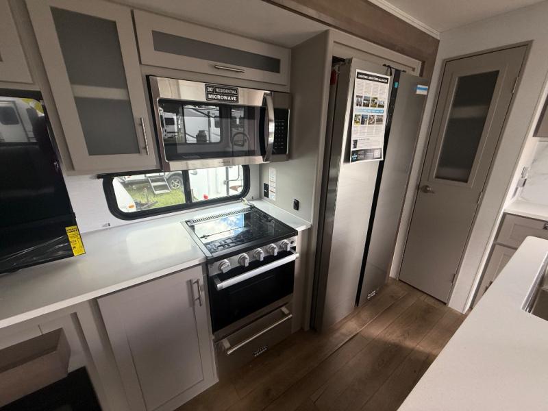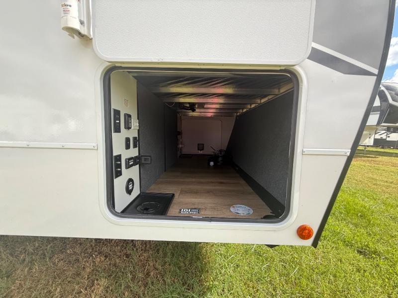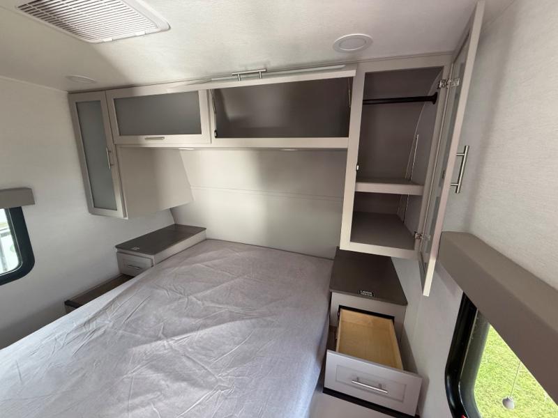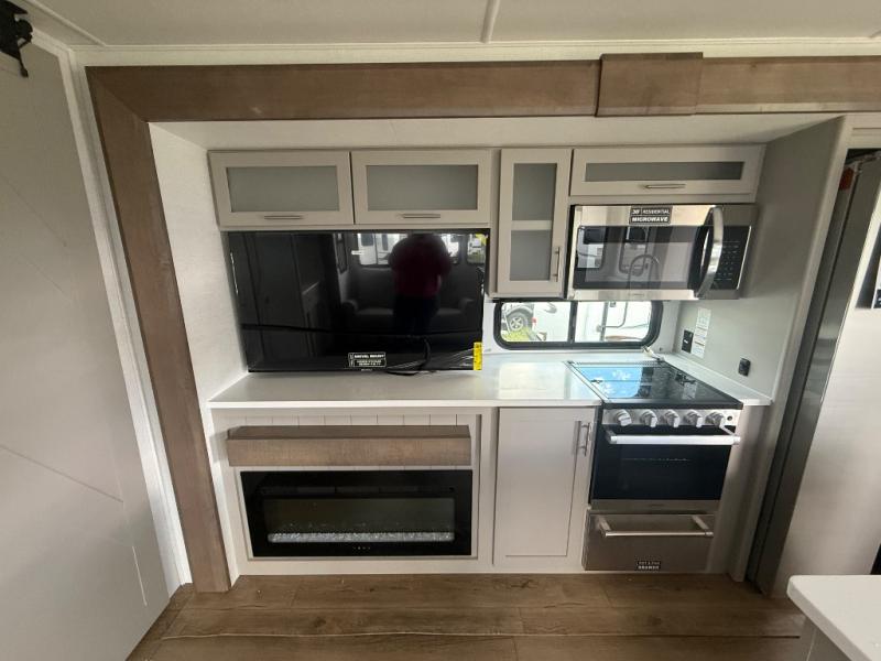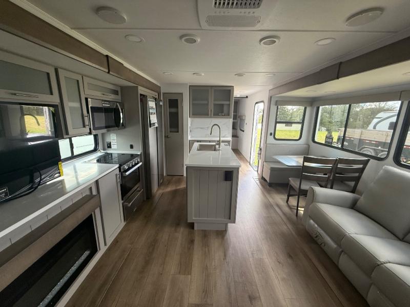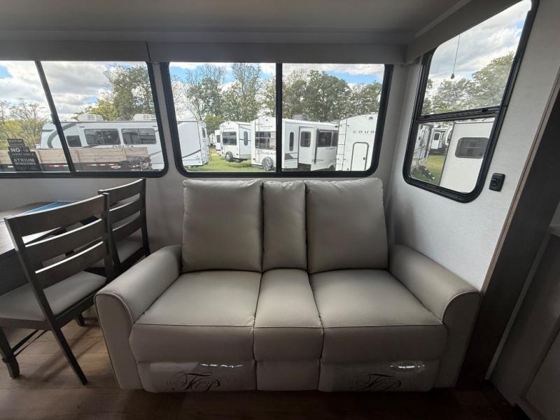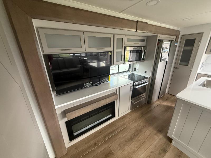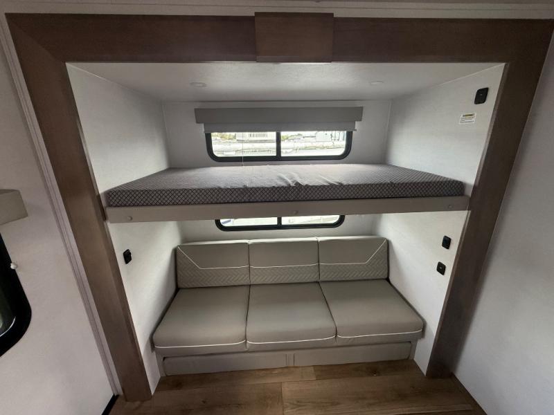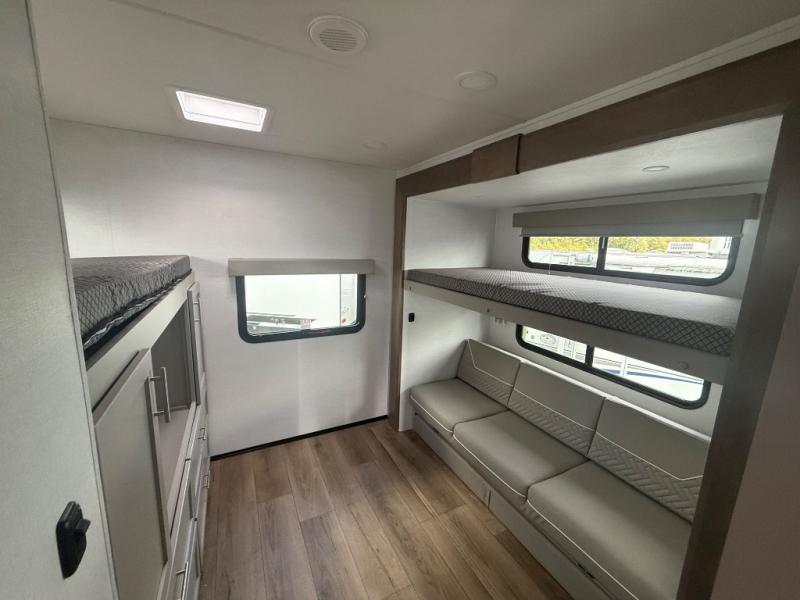 This travel trailer features a rear bunkhouse your guests or little ones are sure to love. There is a 40" x 72" bunk across from a slide out with a flip-up bunk above a cube sofa. There is also a tri-fold sofa with a pull-out trundle bed for even more sleeping space. You will enjoy the front private bedroom all to yourselves with a queen bed and king bed option, dual nightstands, and a wardrobe with washer and dryer prep. The middle living area and kitchen includes dual opposing slides for more space, a kitchen island to prep meals, and a dual recliner theater seat across from the 50" HDTV for movie nights. If the weather is nice, you may just want to make it an outdoor movie night since there is a 40" exterior TV!