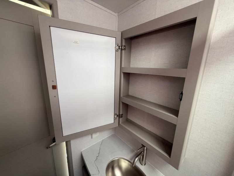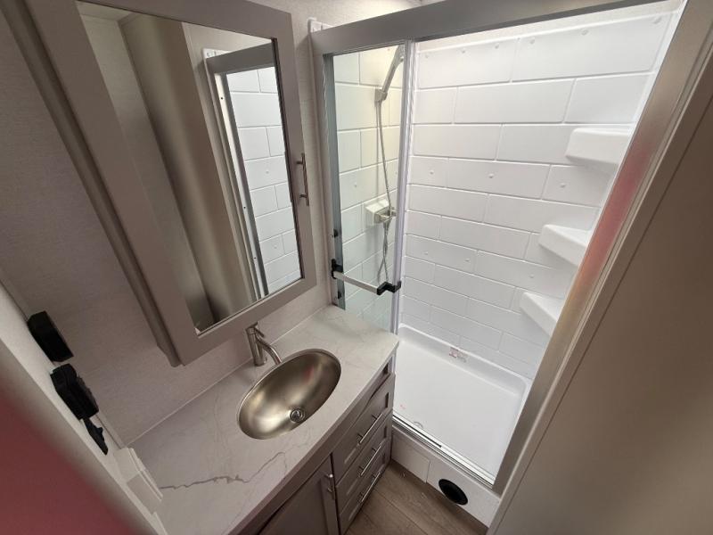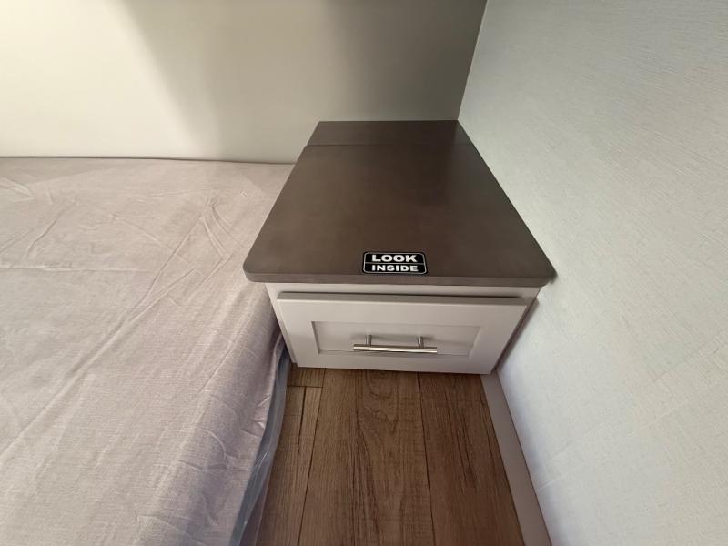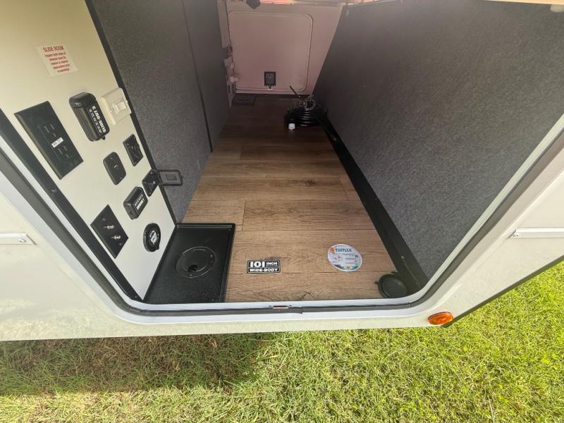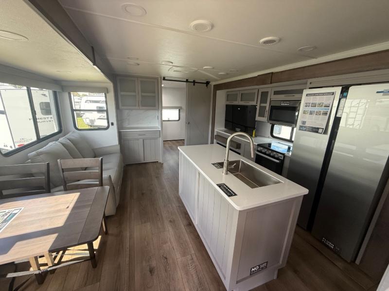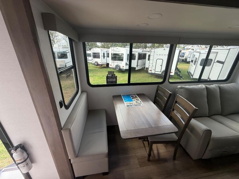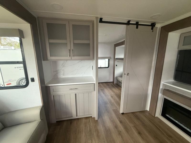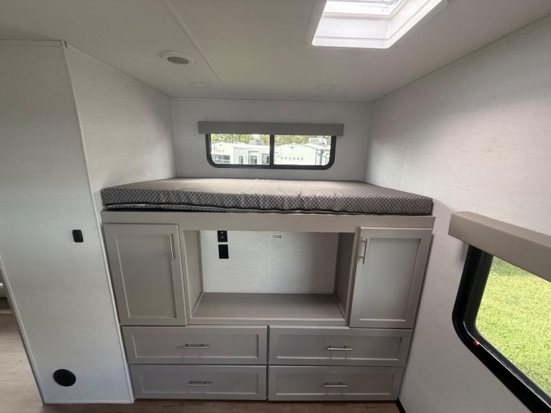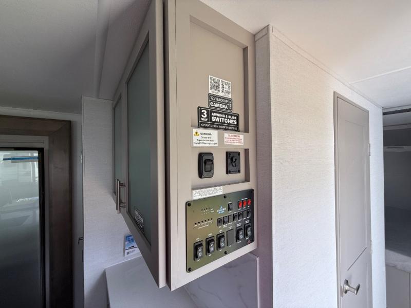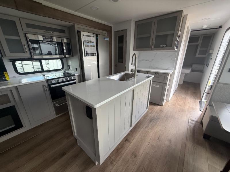 This travel trailer features a rear bunkhouse your guests or little ones are sure to love. There is a 40" x 72" bunk across from a slide out with a flip-up bunk above a cube sofa. There is also a tri-fold sofa with a pull-out trundle bed for even more sleeping space. You will enjoy the front private bedroom all to yourselves with a queen bed and king bed option, dual nightstands, and a wardrobe with washer and dryer prep. The middle living area and kitchen includes dual opposing slides for more space, a kitchen island to prep meals, and a dual recliner theater seat across from the 50" HDTV for movie nights. If the weather is nice, you may just want to make it an outdoor movie night since there is a 40" exterior TV!