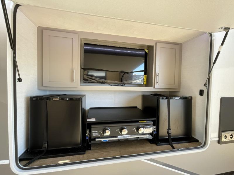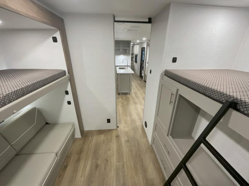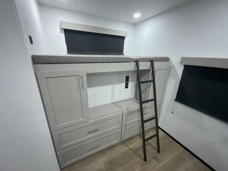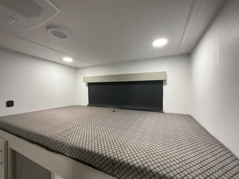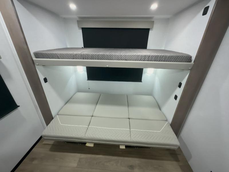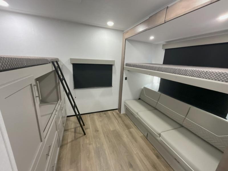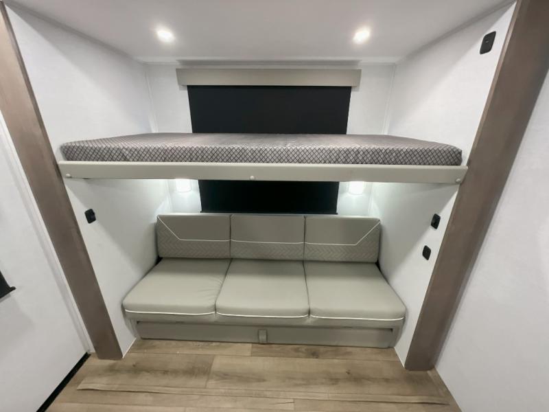 This travel trailer features a rear bunkhouse your guests or little ones are sure to love. There is a 40" x 72" bunk across from a slide out with a flip-up bunk above a cube sofa. There is also a tri-fold sofa with a pull-out trundle bed for even more sleeping space. You will enjoy the front private bedroom all to yourselves with a queen bed and king bed option, dual nightstands, and a wardrobe with washer and dryer prep. The middle living area and kitchen includes dual opposing slides for more space, a kitchen island to prep meals, and a dual recliner theater seat across from the 50" HDTV for movie nights. If the weather is nice, you may just want to make it an outdoor movie night since there is a 40" exterior TV!