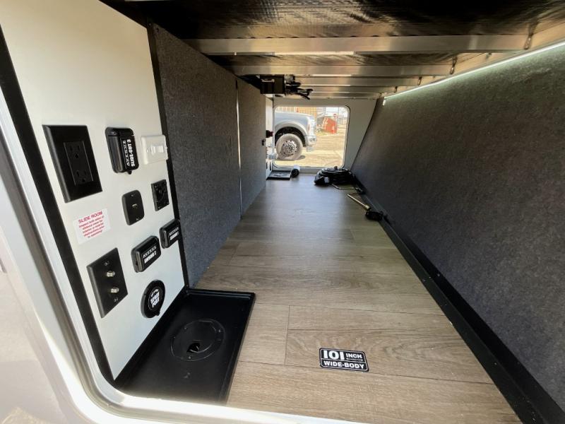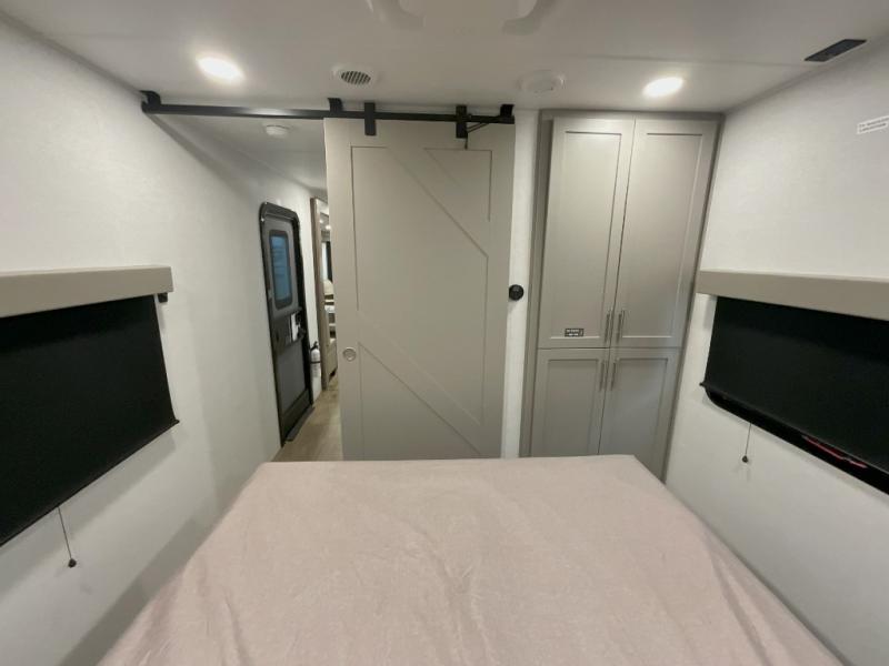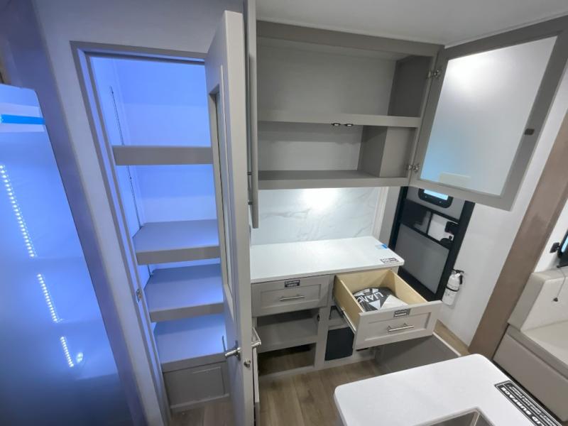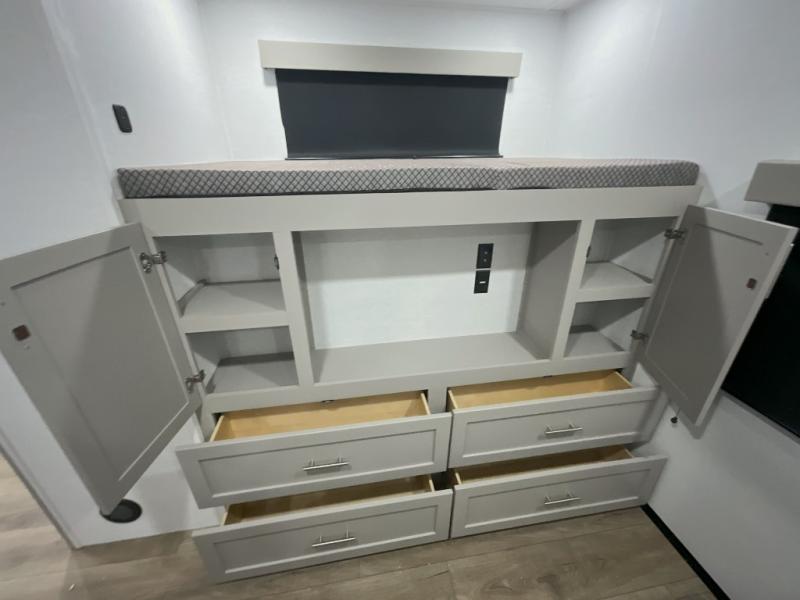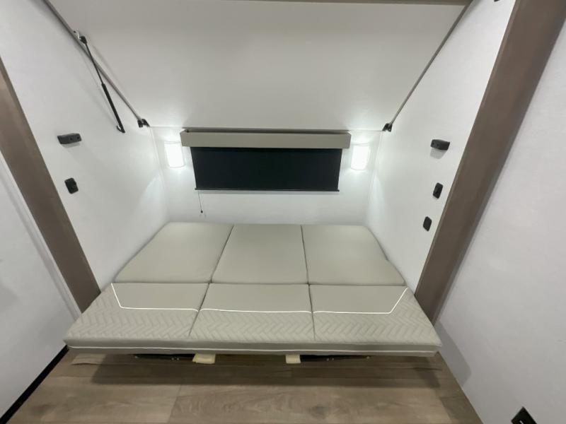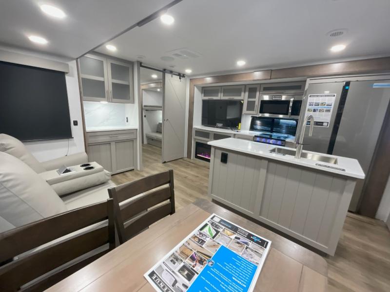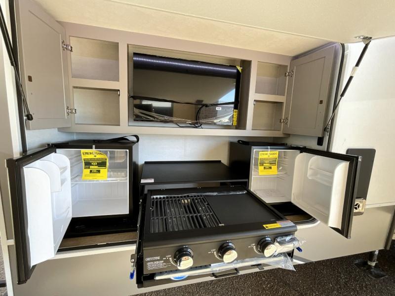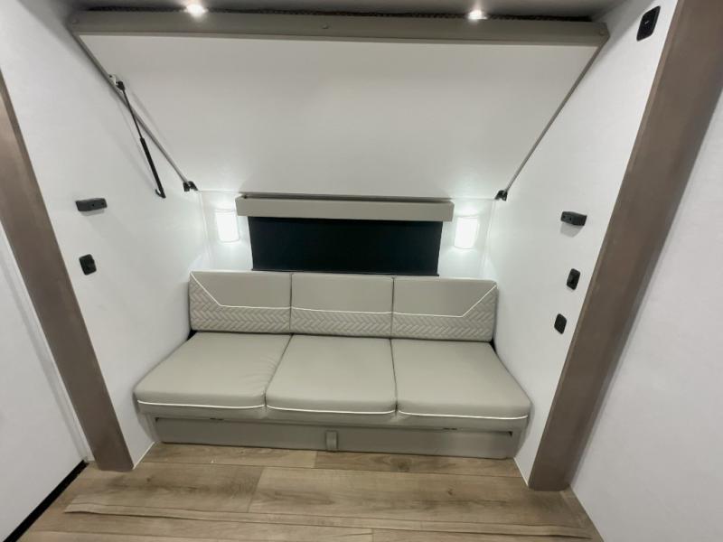 This travel trailer features a rear bunkhouse your guests or little ones are sure to love. There is a 40" x 72" bunk across from a slide out with a flip-up bunk above a cube sofa. There is also a tri-fold sofa with a pull-out trundle bed for even more sleeping space. You will enjoy the front private bedroom all to yourselves with a queen bed and king bed option, dual nightstands, and a wardrobe with washer and dryer prep. The middle living area and kitchen includes dual opposing slides for more space, a kitchen island to prep meals, and a dual recliner theater seat across from the 50" HDTV for movie nights. If the weather is nice, you may just want to make it an outdoor movie night since there is a 40" exterior TV!