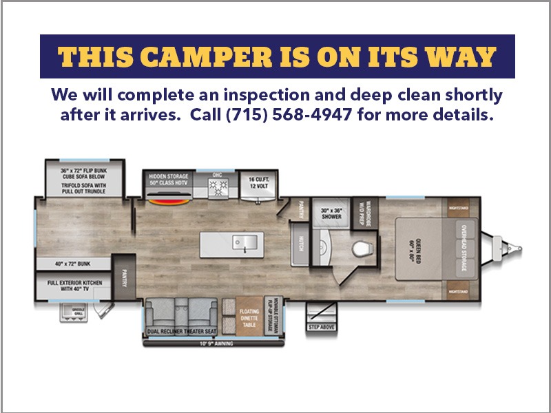 This travel trailer features a rear bunkhouse your guests or little ones are sure to love. There is a 40" x 72" bunk across from a slide out with a flip-up bunk above a cube sofa. There is also a tri-fold sofa with a pull-out trundle bed for even more sleeping space. You will enjoy the front private bedroom all to yourselves with a queen bed and king bed option, dual nightstands, and a wardrobe with washer and dryer prep. The middle living area and kitchen includes dual opposing slides for more space, a kitchen island to prep meals, and a dual recliner theater seat across from the 50" HDTV for movie nights. If the weather is nice, you may just want to make it an outdoor movie night since there is a 40" exterior TV!