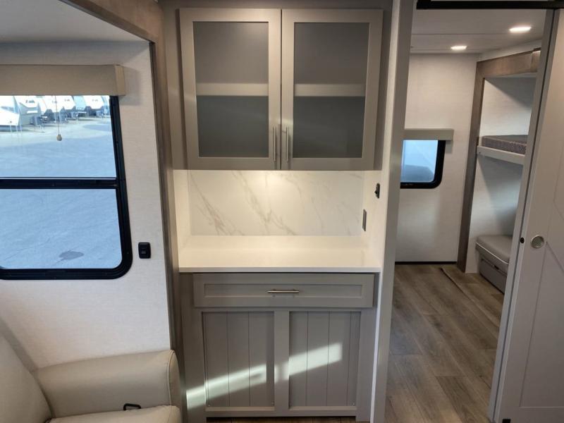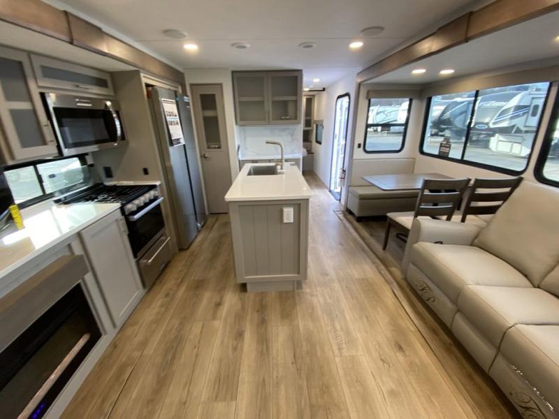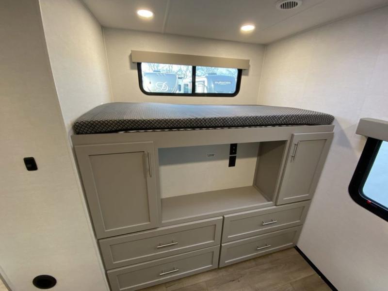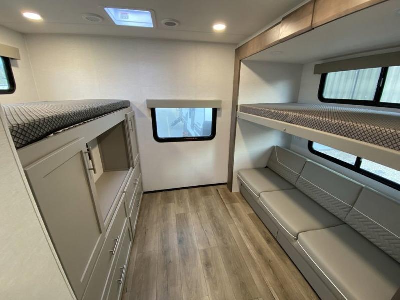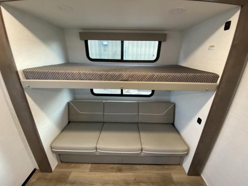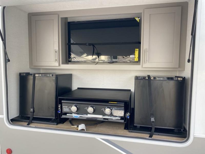 This travel trailer features a rear bunkhouse your guests or little ones are sure to love. There is a 40" x 72" bunk across from a slide out with a flip-up bunk above a cube sofa. There is also a tri-fold sofa with a pull-out trundle bed for even more sleeping space. You will enjoy the front private bedroom all to yourselves with a queen bed and king bed option, dual nightstands, and a wardrobe with washer and dryer prep. The middle living area and kitchen includes dual opposing slides for more space, a kitchen island to prep meals, and a dual recliner theater seat across from the 50" HDTV for movie nights. If the weather is nice, you may just want to make it an outdoor movie night since there is a 40" exterior TV!