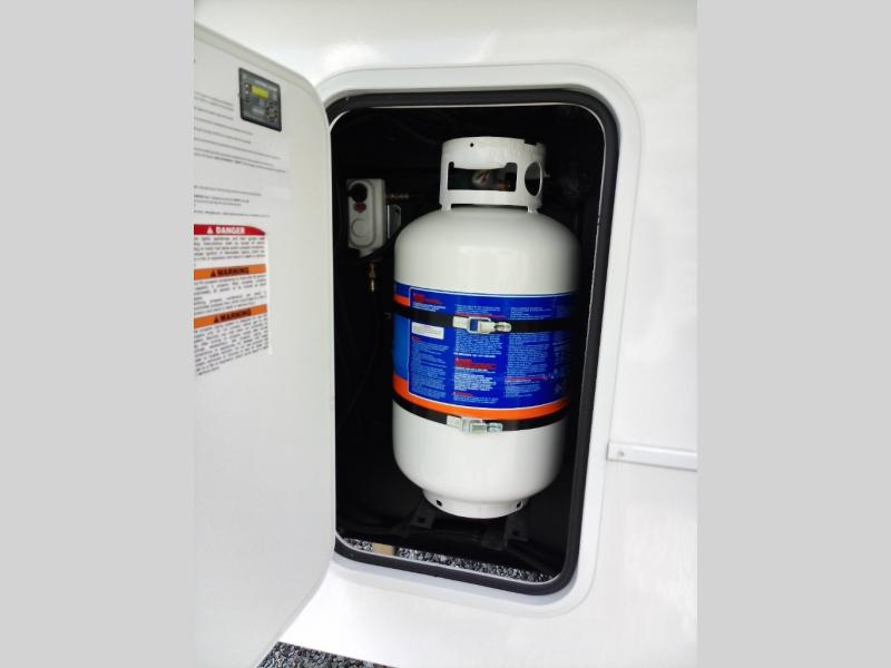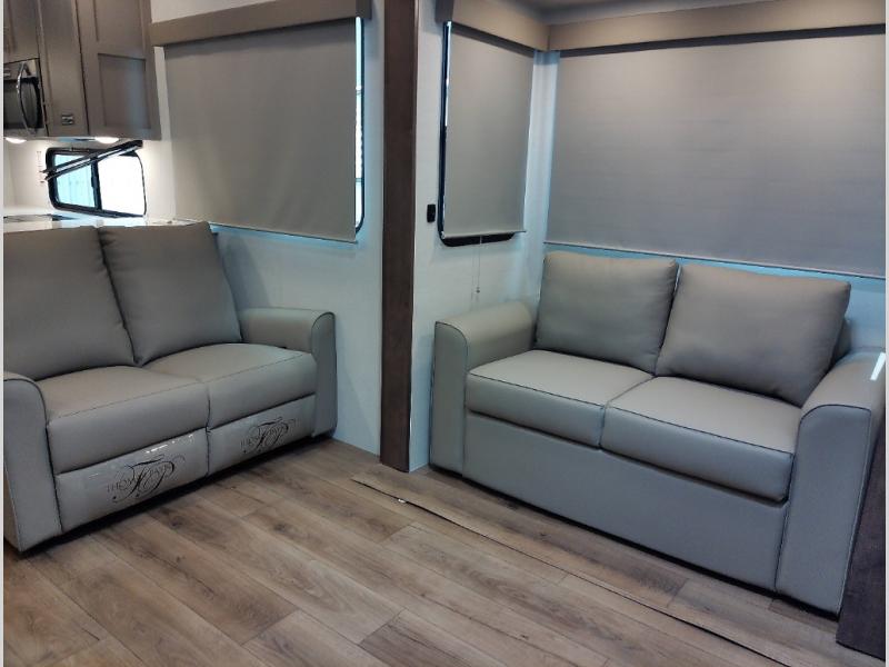 You're sure to love every minute spent in this triple slide out fifth wheel! There are dual sleeper sofas in the middle living area where your guests can sleep, while you take the queen bed slide out in the front bedroom. There is also a king bed option, a walk-in closet with washer and dryer prep, plus a dresser for even more storage. Back in the living area, you can relax on the dual recliner loveseat that sits across from the fireplace and 65" TV. Once dinner has been made on the three burner cooktop, you can dine at the floating dinette table with four chairs.