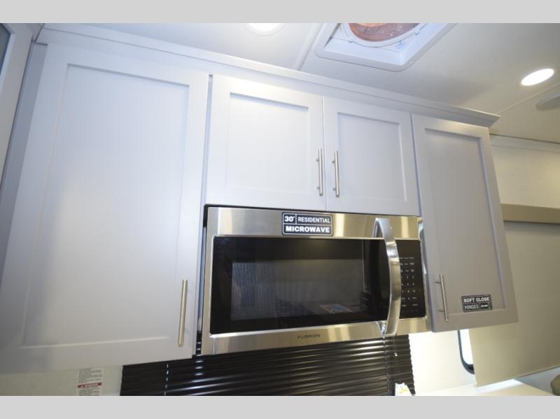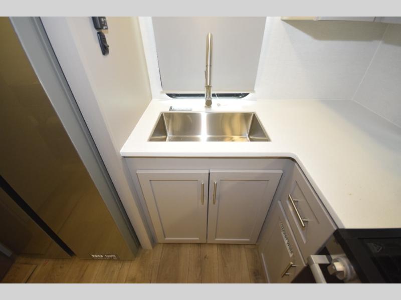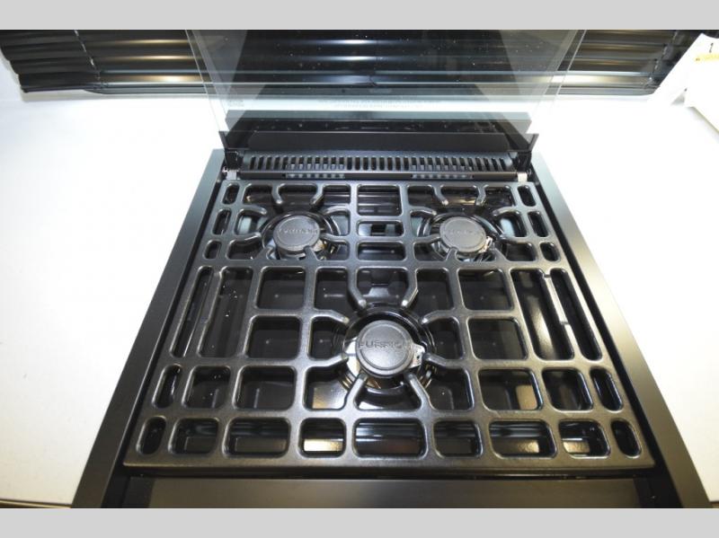 Spacious rear kitchen with residential touches, including a 16 cu. ft. 12V refrigerator, 3-burner cooktop, and a large pantry