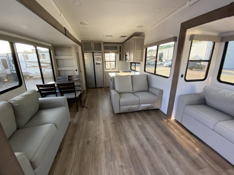 You're sure to love every minute spent in this triple slide out fifth wheel! There are dual sleeper sofas in the middle living area where your guests can sleep, while you take the queen bed slide out in the front bedroom. There is also a king bed option, a walk-in closet with washer and dryer prep, plus a dresser for even more storage. Back in the living area, you can relax on the dual recliner loveseat that sits across from the fireplace and 65" TV. Once dinner has been made on the three burner cooktop, you can dine at the floating dinette table with four chairs.