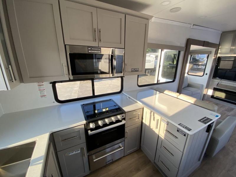 With any Avenue fifth wheel or travel trailer by Alliance RV, you will enjoy more interior space provided by the 8' 5" wide-body construction, and a long list of luxury features. Each is built with Azdel composite sidewalls both inside and out, along with a PVC roof for added strength. There are innovative storage solutions that include hidden storage behind the TV, within end tables and ottomans, and more. Since these units feature no carpet throughout, cleaning will be easier than ever, and there are flush floor slides throughout for seamless living spaces. The Avenue also comes with the OTG Solar Package with a 400 watt solar panel, inverter prep, multiple outlets, and more to keep you charged up!