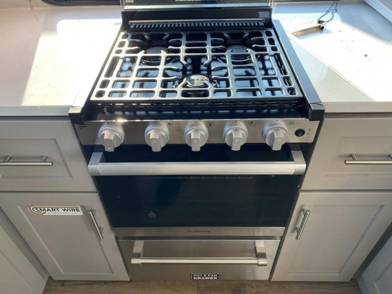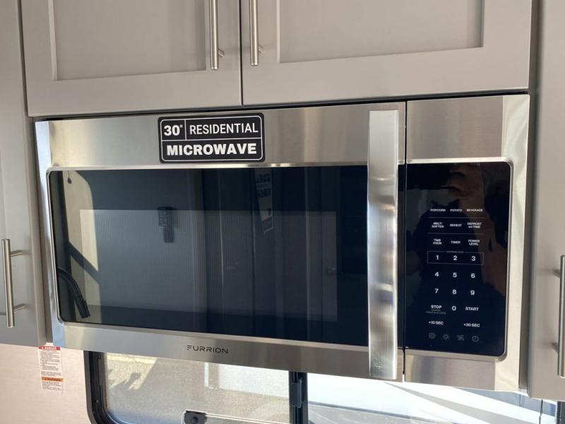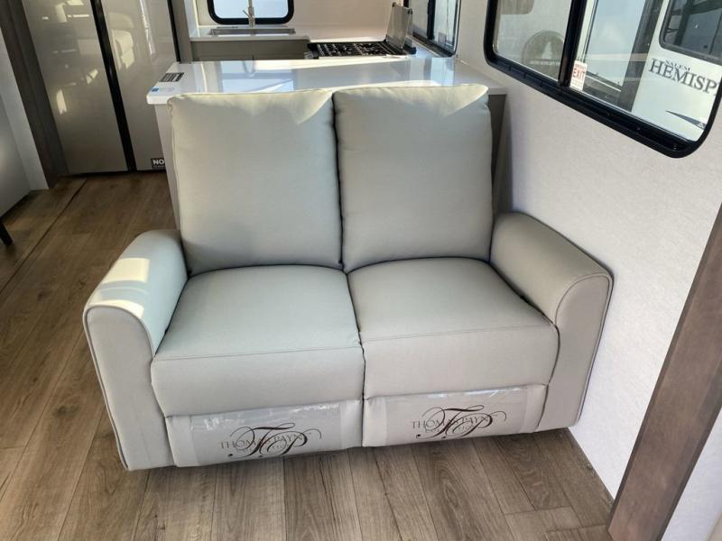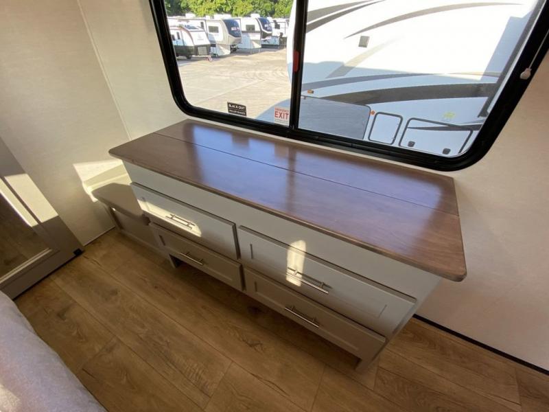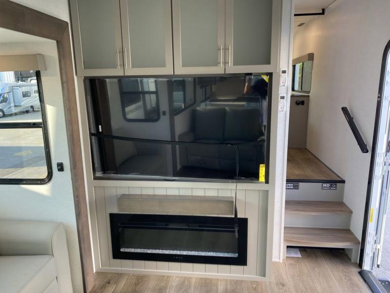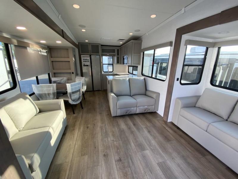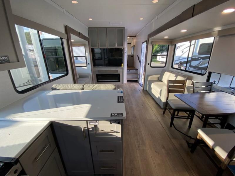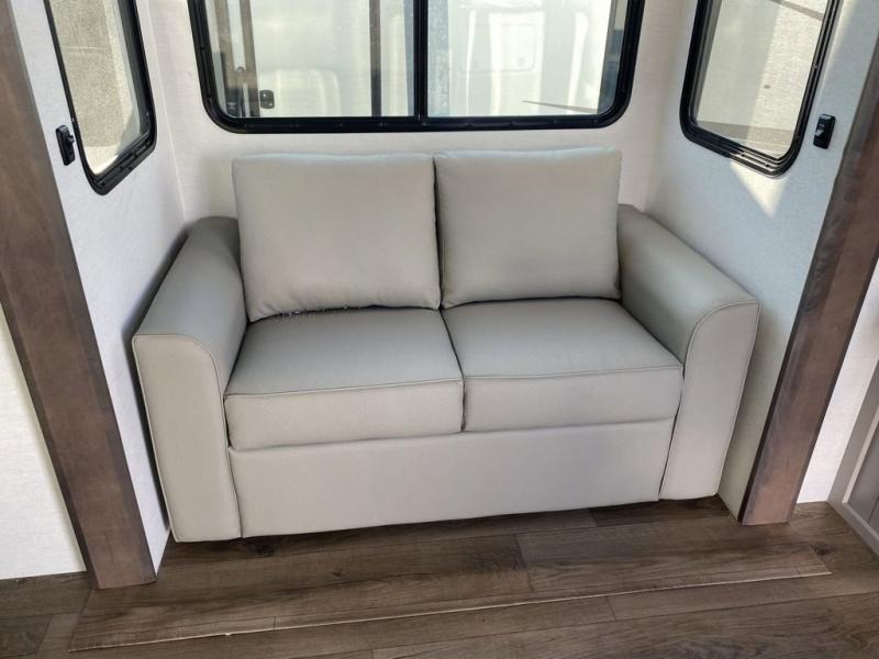You're sure to love every minute spent in this triple slide out fifth wheel! There are dual sleeper sofas in the middle living area where your guests can sleep, while you take the queen bed slide out in the front bedroom. There is also a king bed option, a walk-in closet with washer and dryer prep, plus a dresser for even more storage. Back in the living area, you can relax on the dual recliner loveseat that sits across from the fireplace and 65" TV. Once dinner has been made on the three burner cooktop, you can dine at the floating dinette table with four chairs.