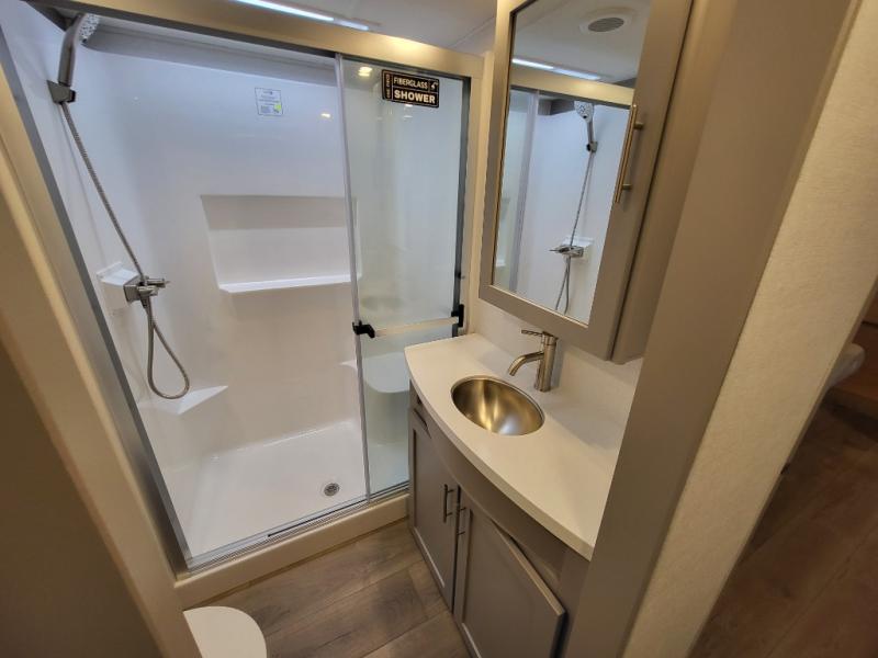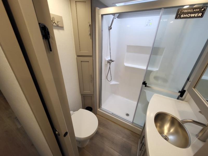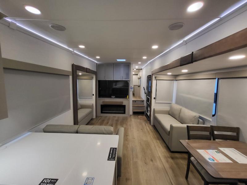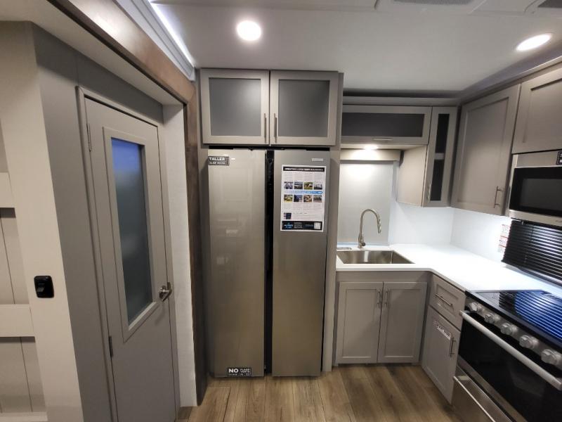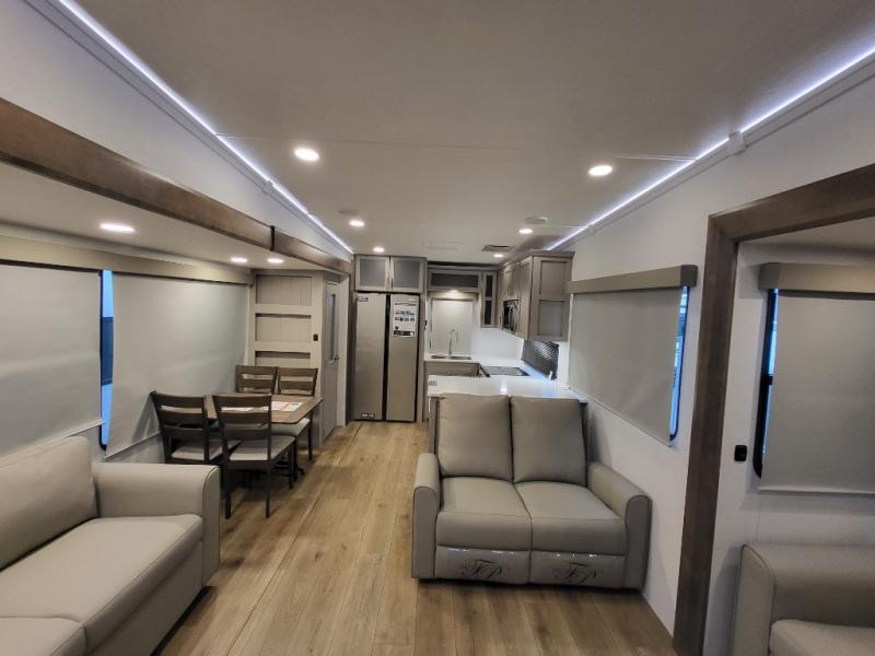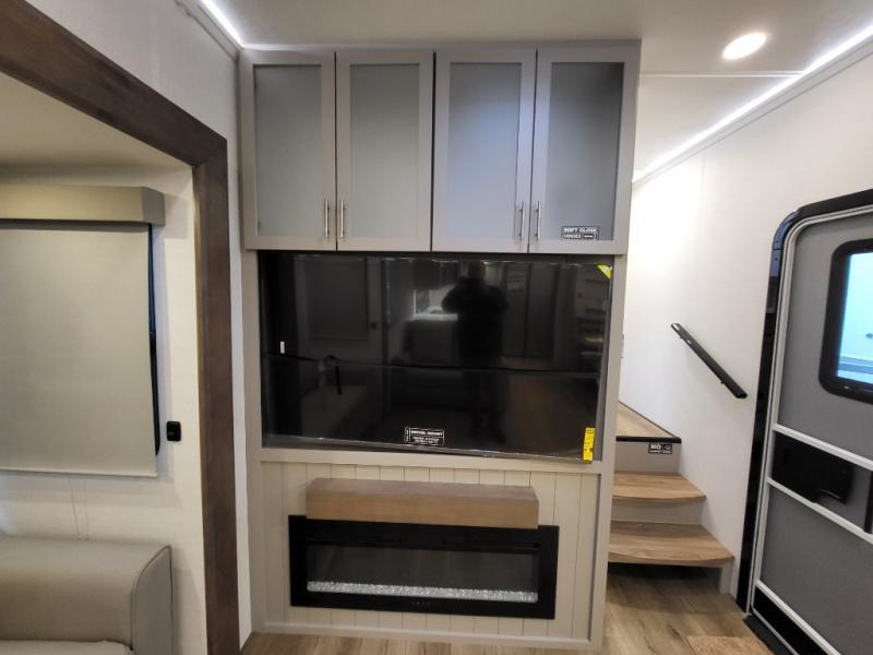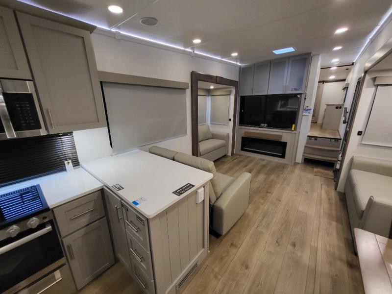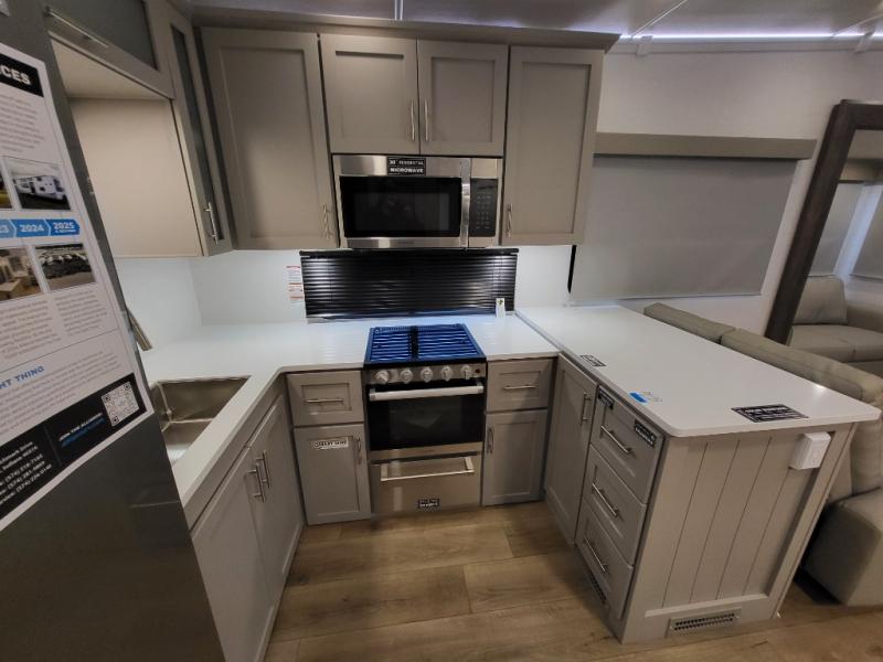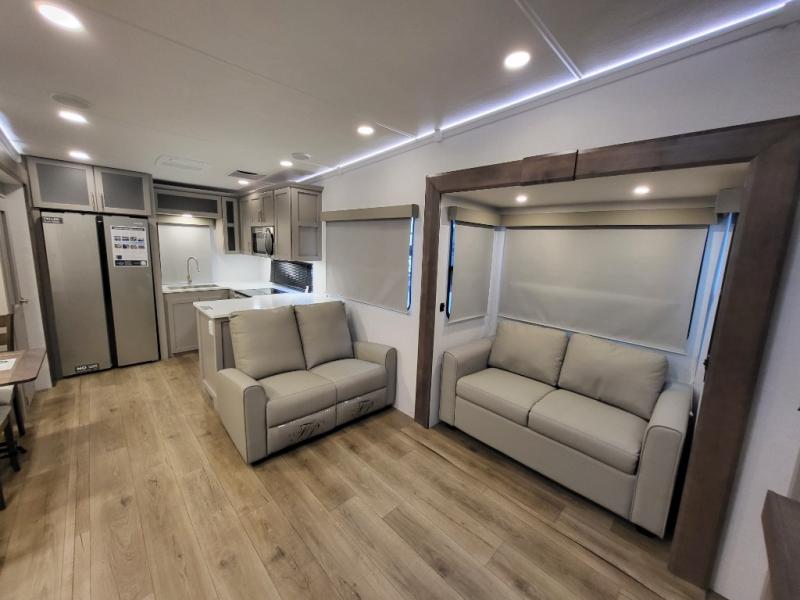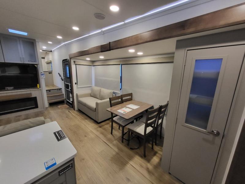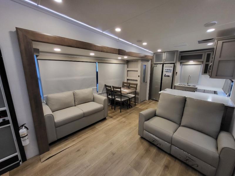 You're sure to love every minute spent in this triple slide out fifth wheel! There are dual sleeper sofas in the middle living area where your guests can sleep, while you take the queen bed slide out in the front bedroom. There is also a king bed option, a walk-in closet with washer and dryer prep, plus a dresser for even more storage. Back in the living area, you can relax on the dual recliner loveseat that sits across from the fireplace and 65" TV. Once dinner has been made on the three burner cooktop, you can dine at the floating dinette table with four chairs.