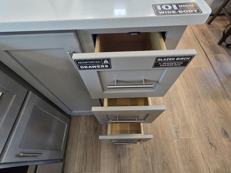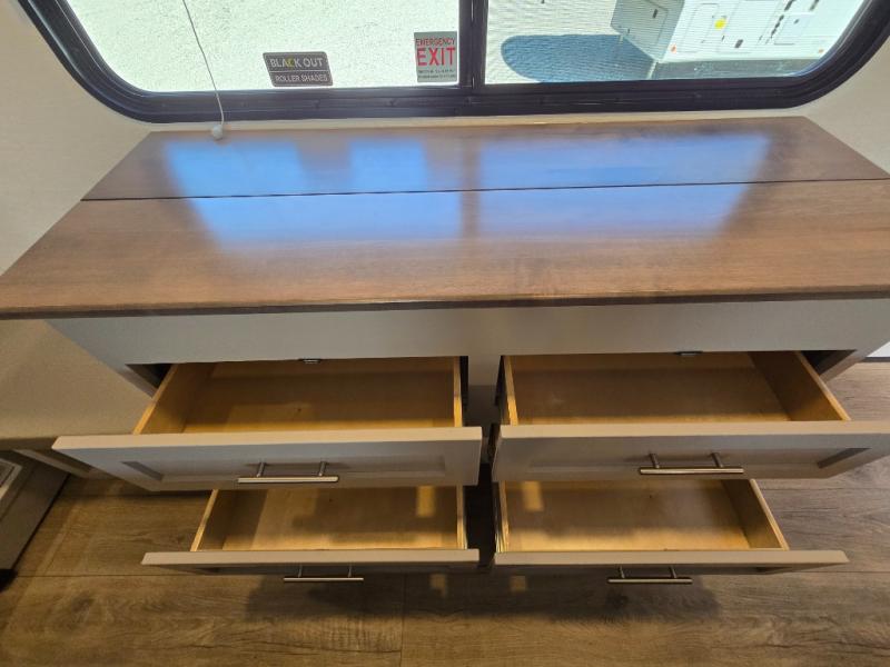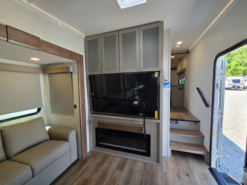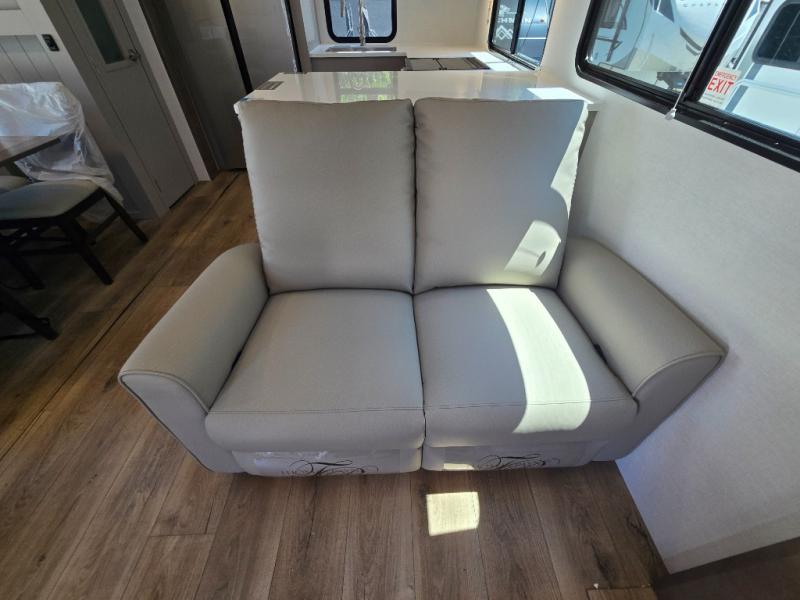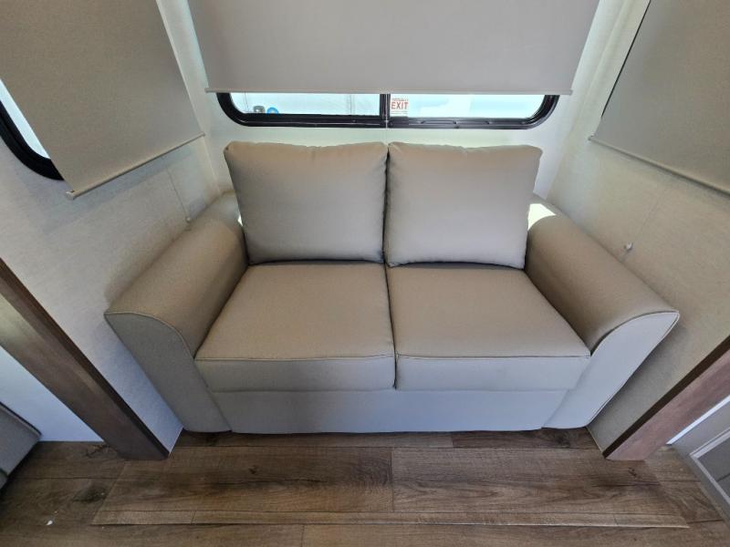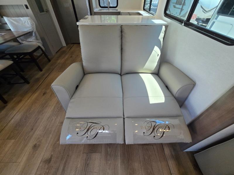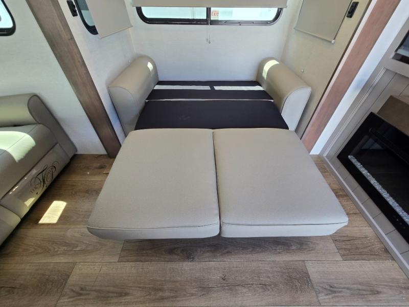 You're sure to love every minute spent in this triple slide out fifth wheel! There are dual sleeper sofas in the middle living area where your guests can sleep, while you take the queen bed slide out in the front bedroom. There is also a king bed option, a walk-in closet with washer and dryer prep, plus a dresser for even more storage. Back in the living area, you can relax on the dual recliner loveseat that sits across from the fireplace and 65" TV. Once dinner has been made on the three burner cooktop, you can dine at the floating dinette table with four chairs.