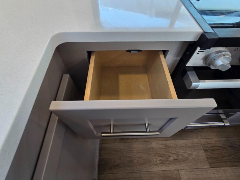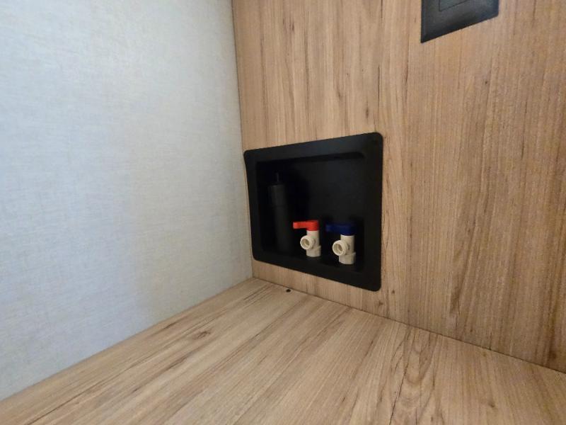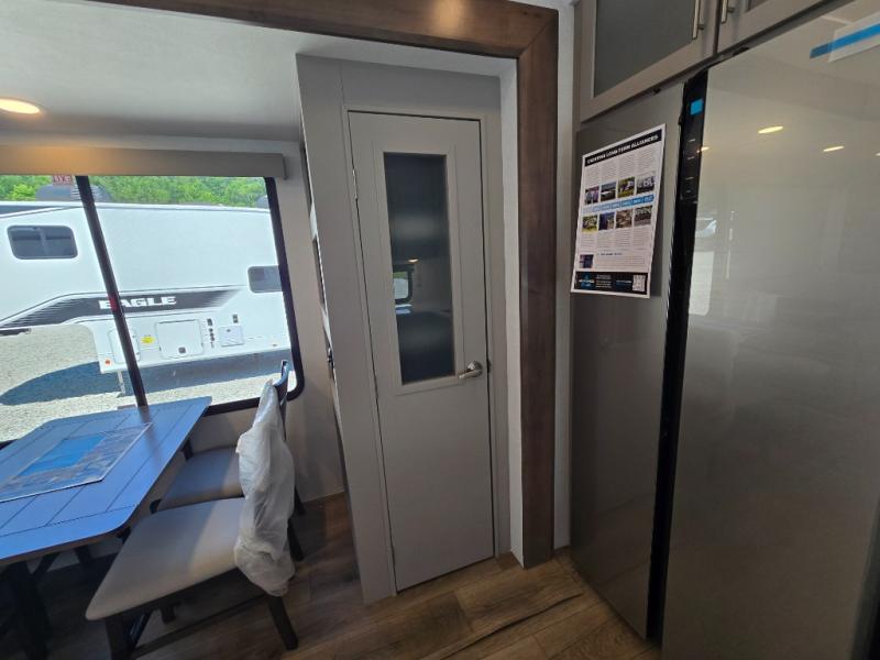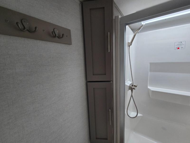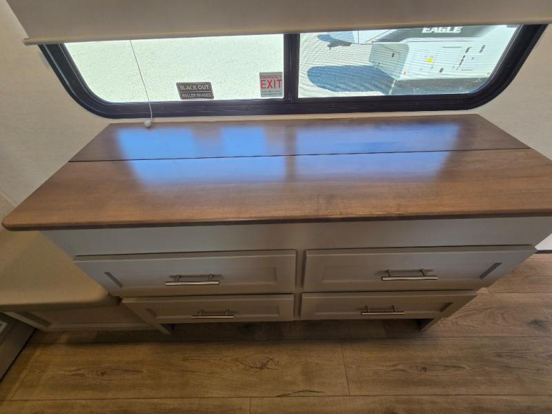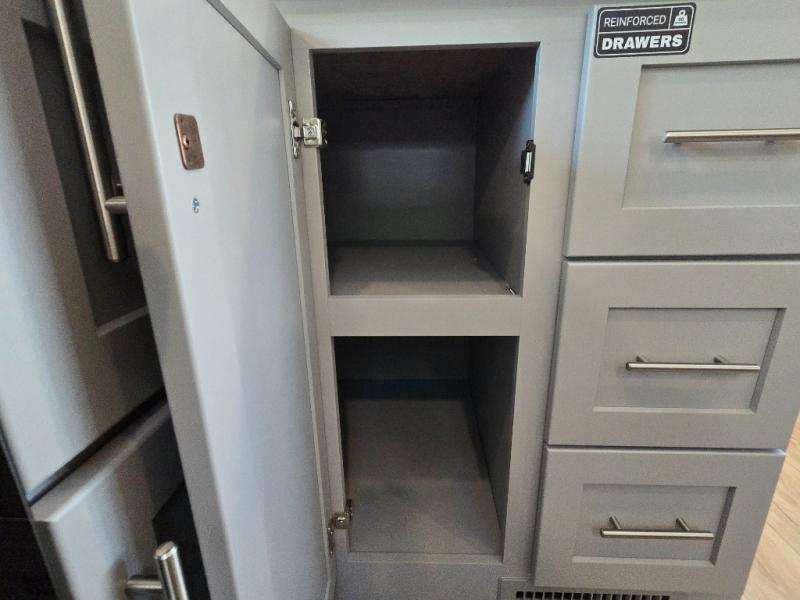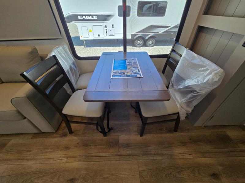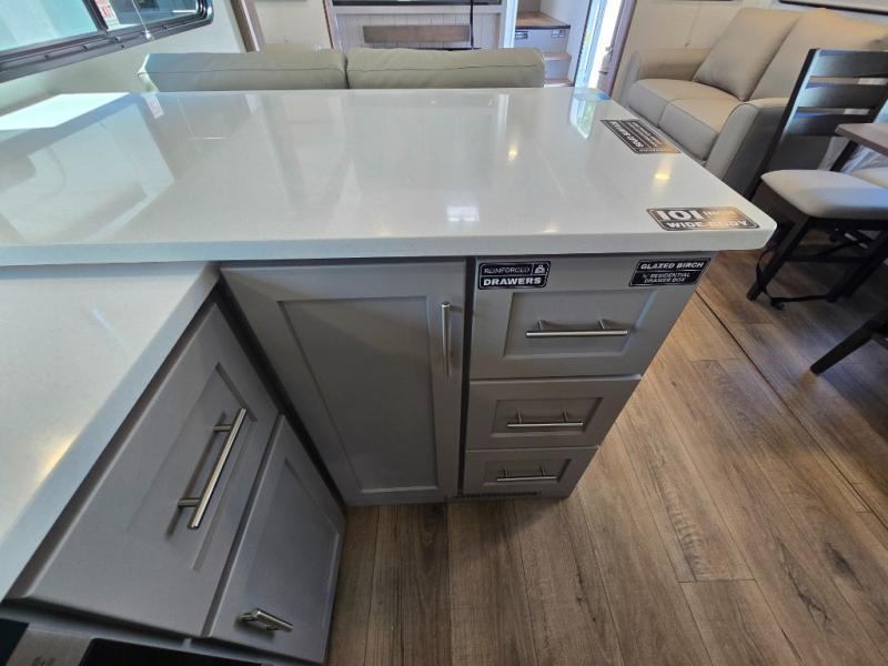 You're sure to love every minute spent in this triple slide out fifth wheel! There are dual sleeper sofas in the middle living area where your guests can sleep, while you take the queen bed slide out in the front bedroom. There is also a king bed option, a walk-in closet with washer and dryer prep, plus a dresser for even more storage. Back in the living area, you can relax on the dual recliner loveseat that sits across from the fireplace and 65" TV. Once dinner has been made on the three burner cooktop, you can dine at the floating dinette table with four chairs.