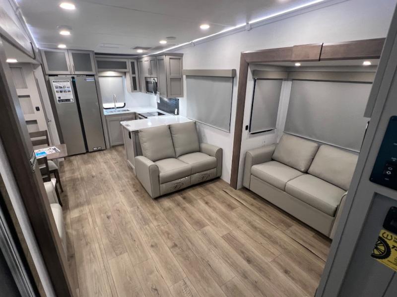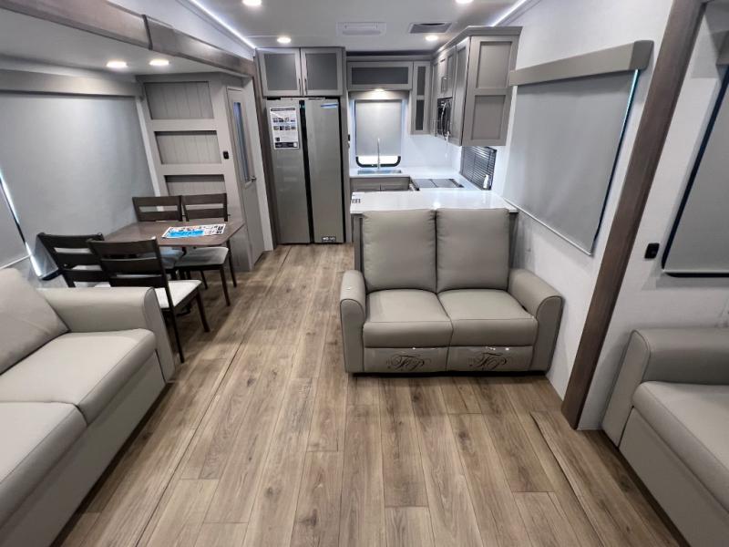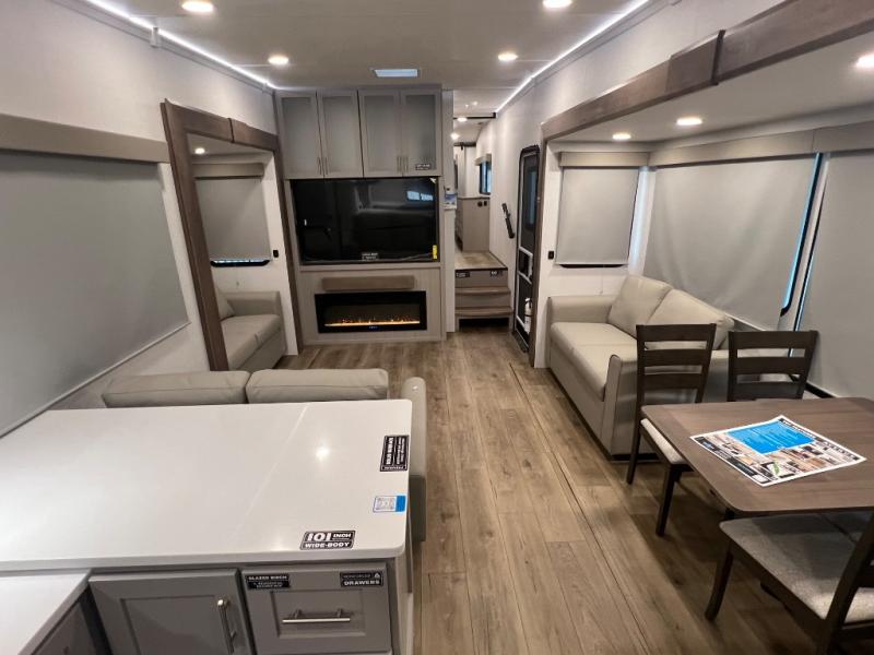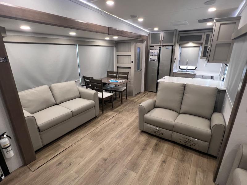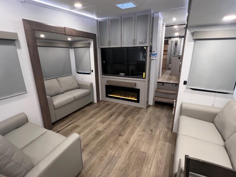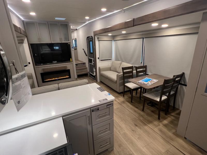 You're sure to love every minute spent in this triple slide out fifth wheel! There are dual sleeper sofas in the middle living area where your guests can sleep, while you take the queen bed slide out in the front bedroom. There is also a king bed option, a walk-in closet with washer and dryer prep, plus a dresser for even more storage. Back in the living area, you can relax on the dual recliner loveseat that sits across from the fireplace and 65" TV. Once dinner has been made on the three burner cooktop, you can dine at the floating dinette table with four chairs.