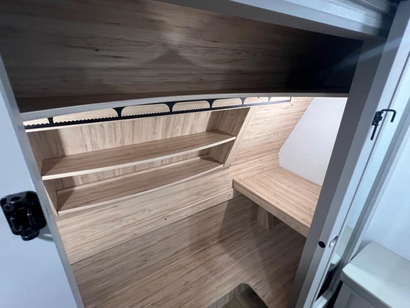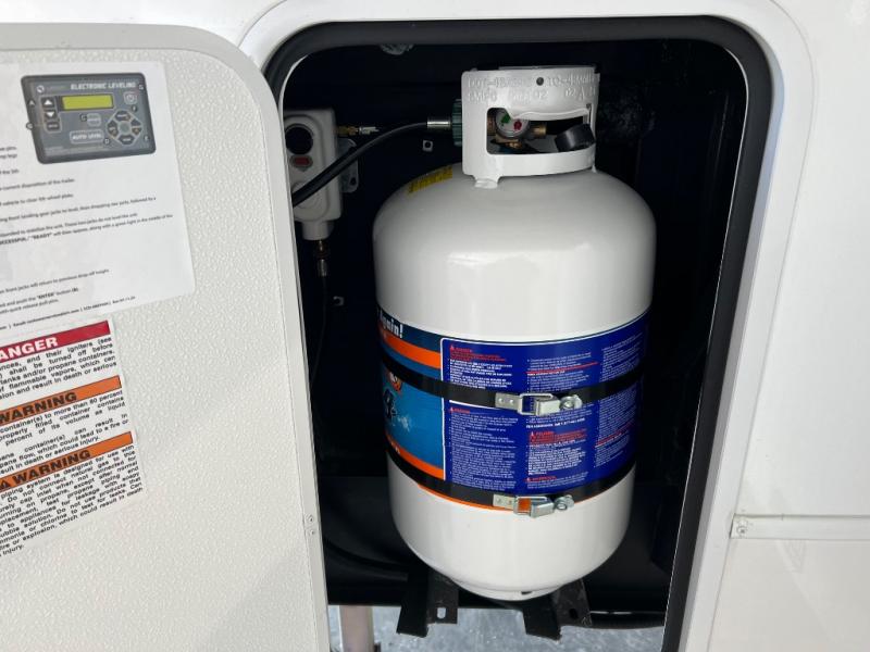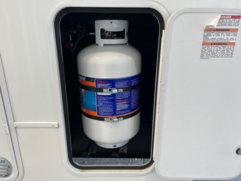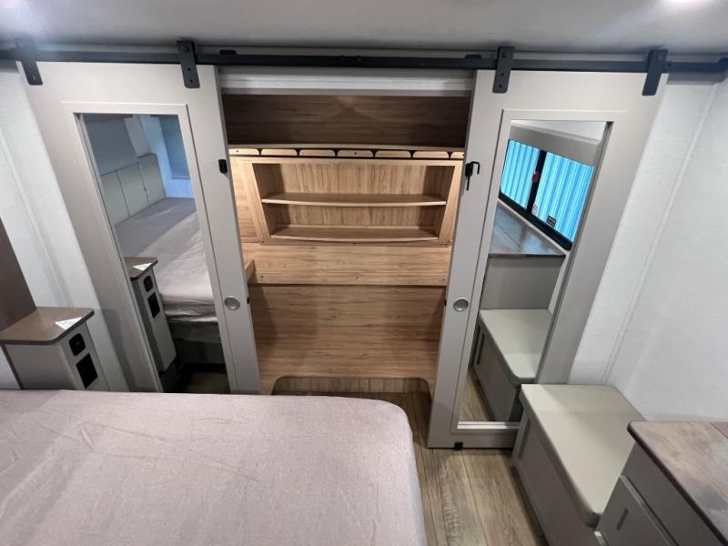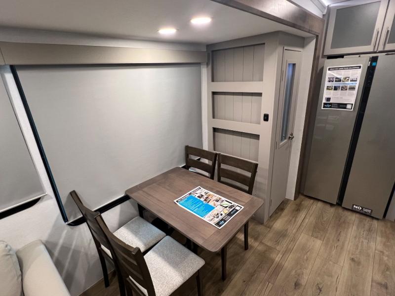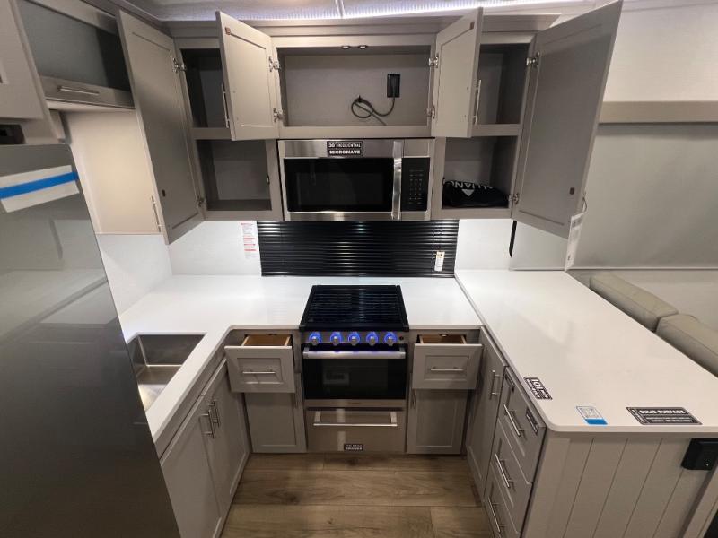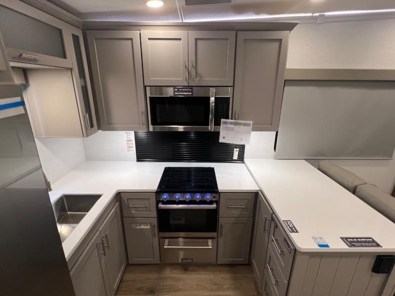 You're sure to love every minute spent in this triple slide out fifth wheel! There are dual sleeper sofas in the middle living area where your guests can sleep, while you take the queen bed slide out in the front bedroom. There is also a king bed option, a walk-in closet with washer and dryer prep, plus a dresser for even more storage. Back in the living area, you can relax on the dual recliner loveseat that sits across from the fireplace and 65" TV. Once dinner has been made on the three burner cooktop, you can dine at the floating dinette table with four chairs.