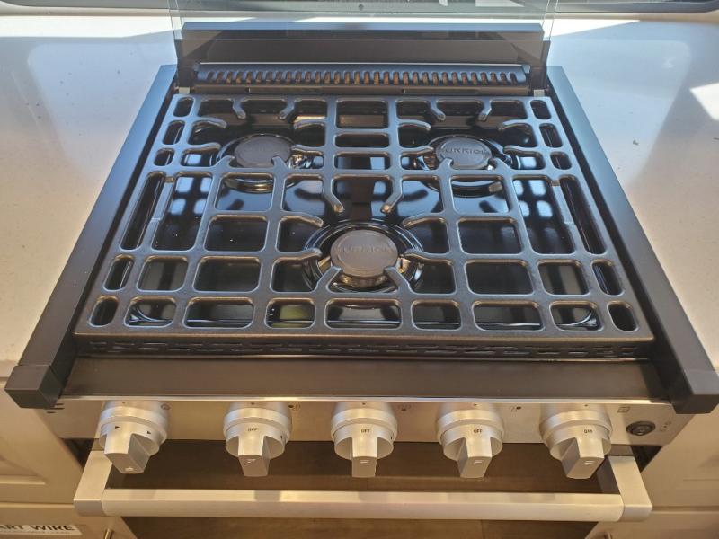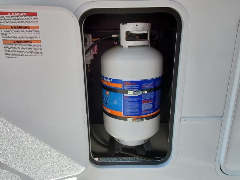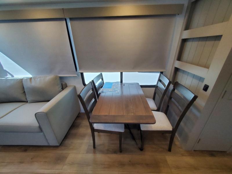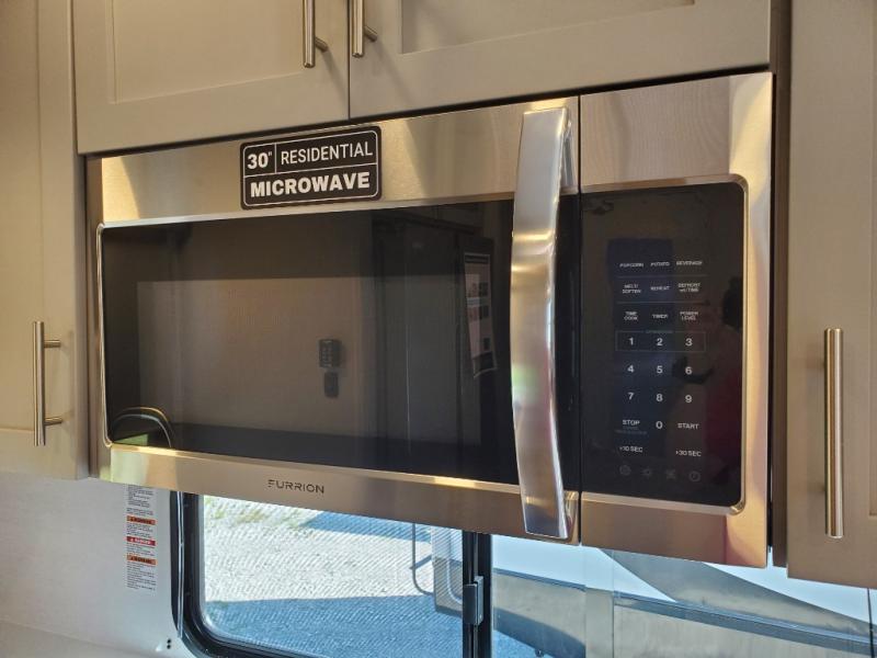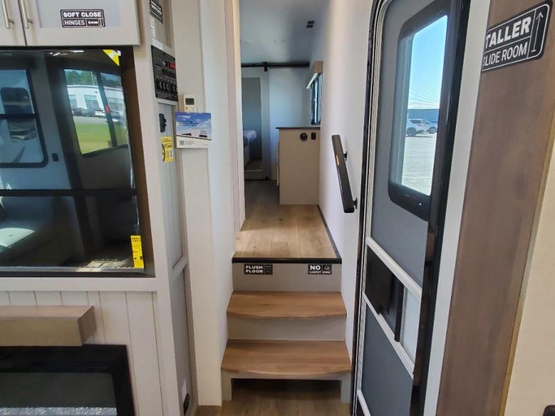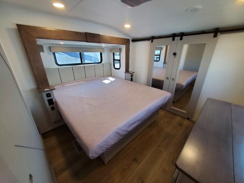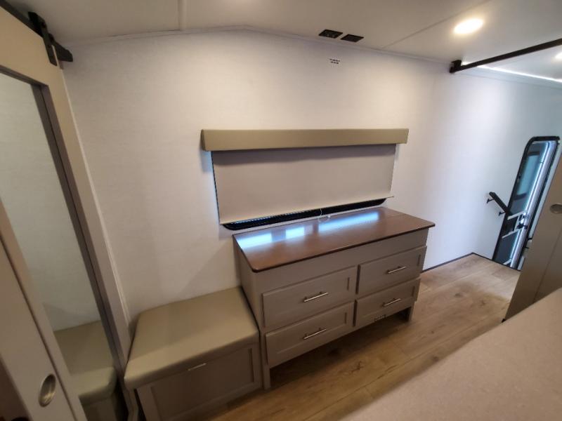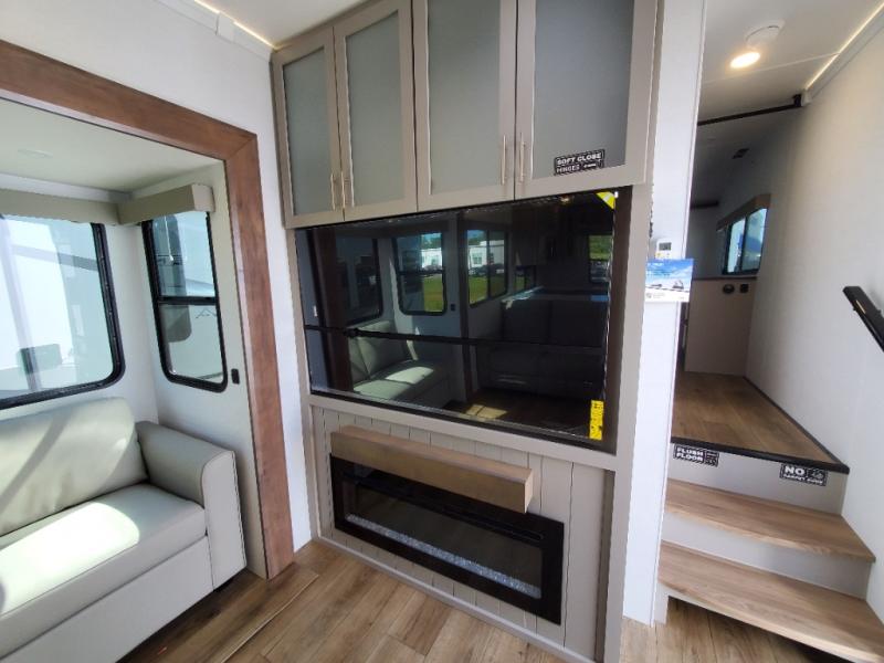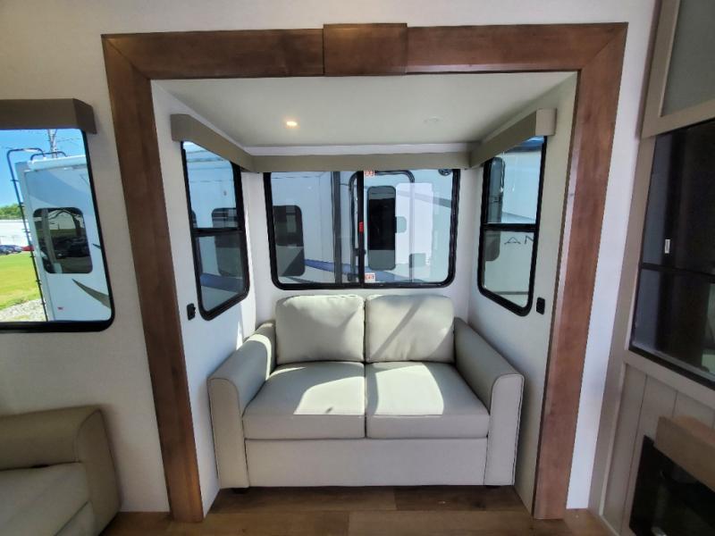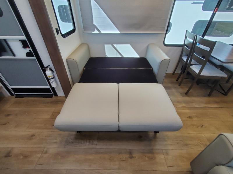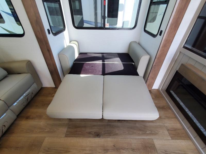 You're sure to love every minute spent in this triple slide out fifth wheel! There are dual sleeper sofas in the middle living area where your guests can sleep, while you take the queen bed slide out in the front bedroom. There is also a king bed option, a walk-in closet with washer and dryer prep, plus a dresser for even more storage. Back in the living area, you can relax on the dual recliner loveseat that sits across from the fireplace and 65" TV. Once dinner has been made on the three burner cooktop, you can dine at the floating dinette table with four chairs.