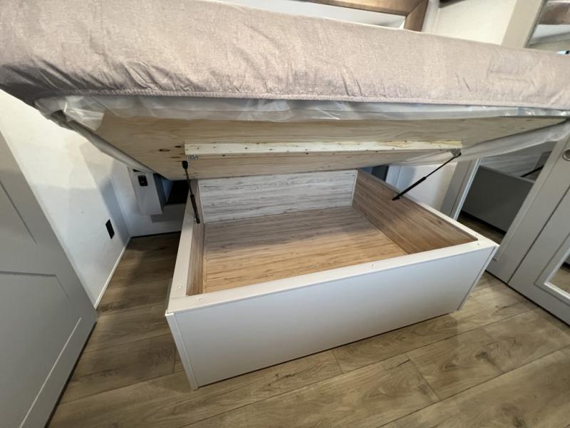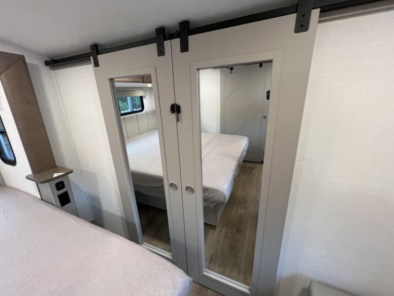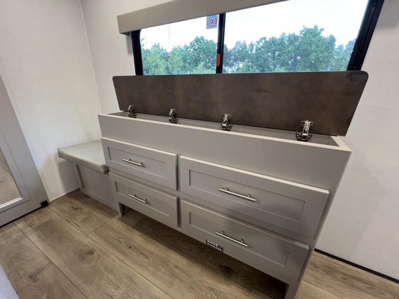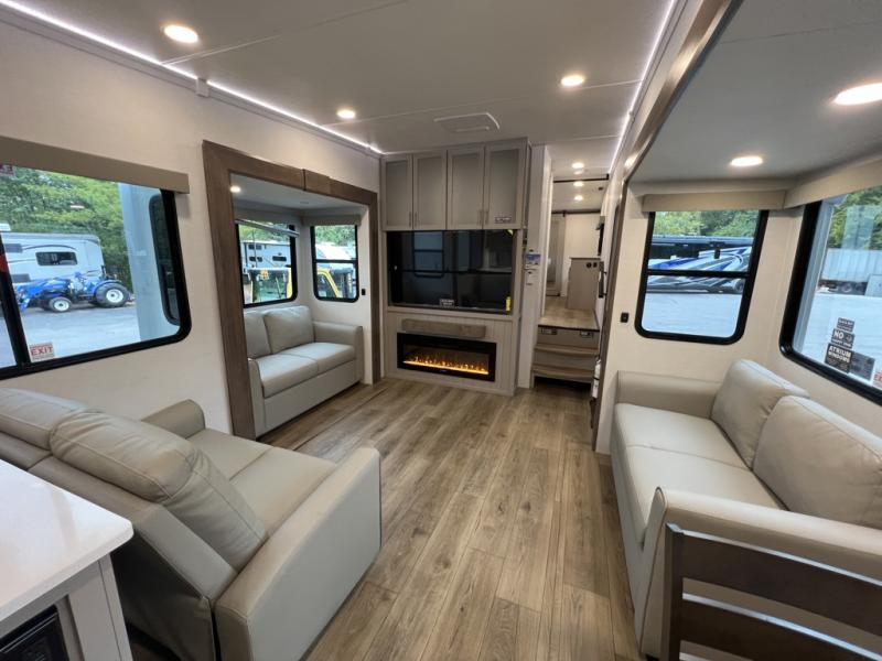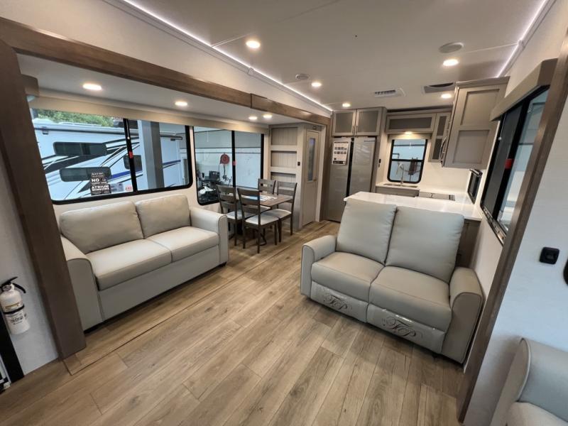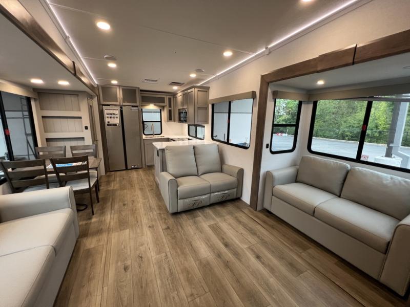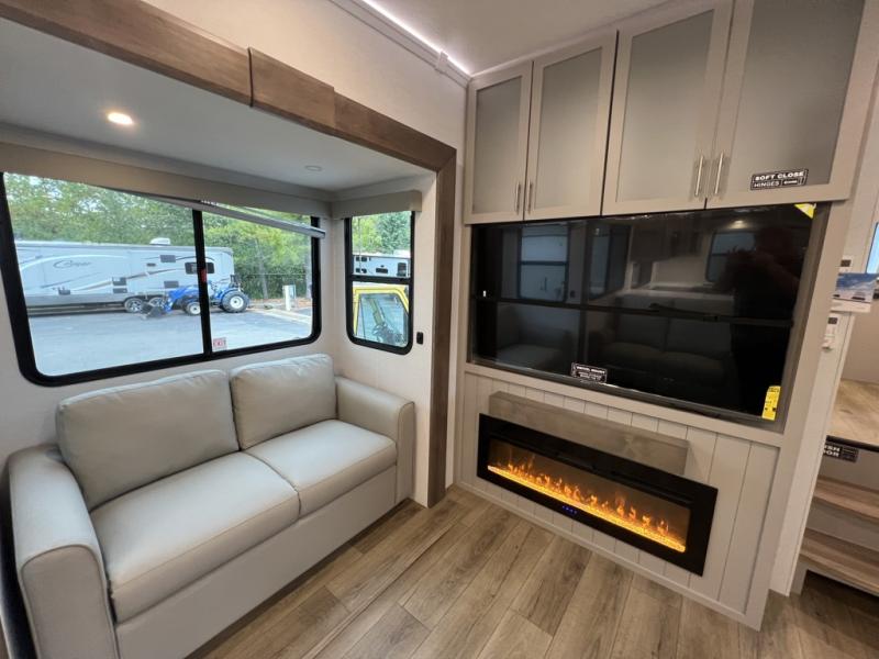 You're sure to love every minute spent in this triple slide out fifth wheel! There are dual sleeper sofas in the middle living area where your guests can sleep, while you take the queen bed slide out in the front bedroom. There is also a king bed option, a walk-in closet with washer and dryer prep, plus a dresser for even more storage. Back in the living area, you can relax on the dual recliner loveseat that sits across from the fireplace and 65" TV. Once dinner has been made on the three burner cooktop, you can dine at the floating dinette table with four chairs.