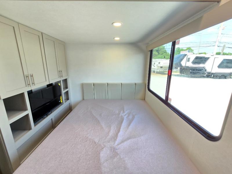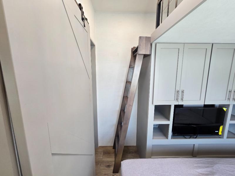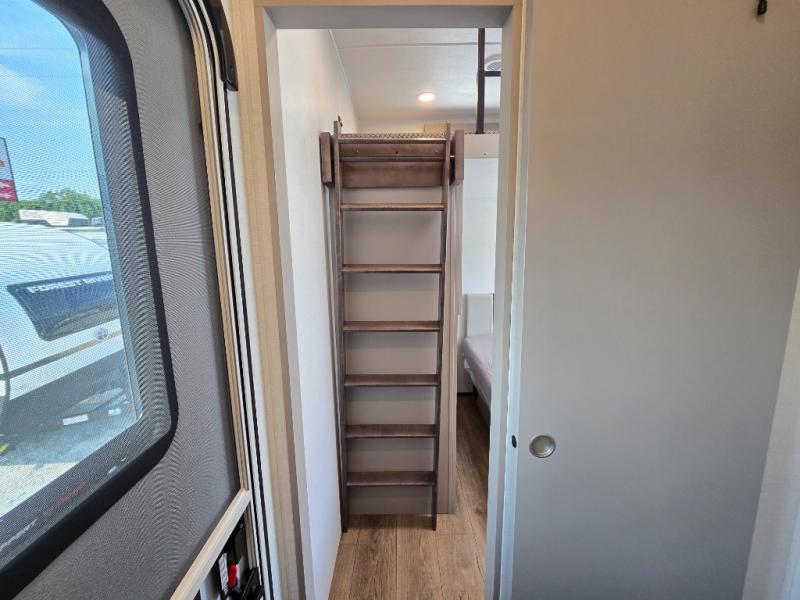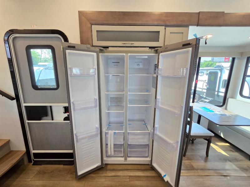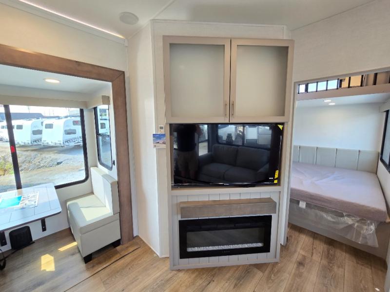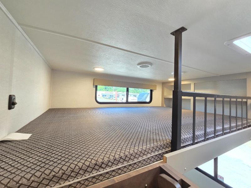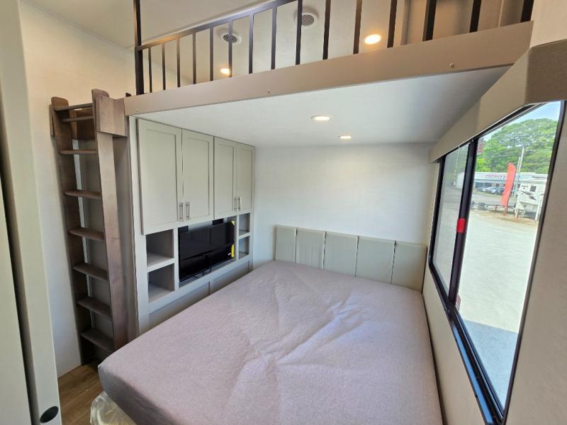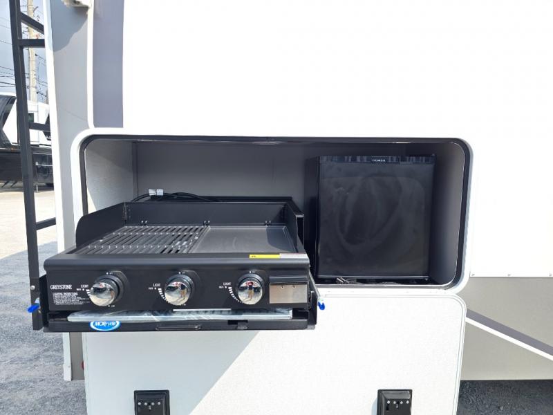 The whole gang can join in on the fun in this fifth wheel! The rear private 54" x 74" loft bed features a lower 60" x 70" bed beneath with storage and a TV, and its very own half bathroom with private entry/exit to the outside. There is also an exterior baggage door so you can easily pack gear straight into this room. The living area comes with dual recliner theater seating, a swing out 50" class HDTV, and a floating dinette table with two chairs and a movable ottoman with flip up storage. There is also a 16 cu. ft. 12 volt refrigerator and pull-out pantry here for food storage. And you can easily prepare your best home cooked meals using the three burner cooktop. When you're ready to wind down your night, head to the front private bedroom and relax on the queen bed slide which could be switched out for the optional king bed if you like! This unit also features an outdoor griddle and refrigerator under the loft space.