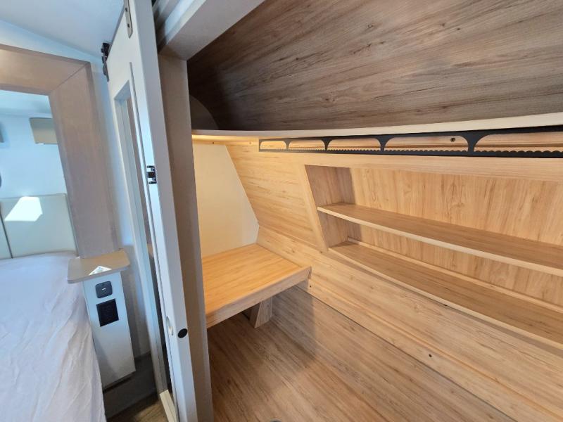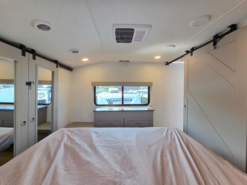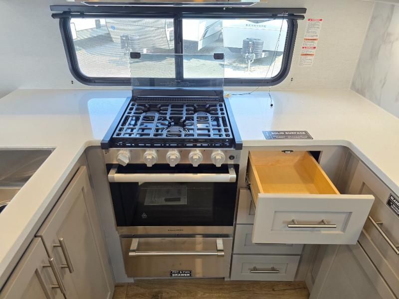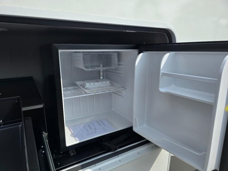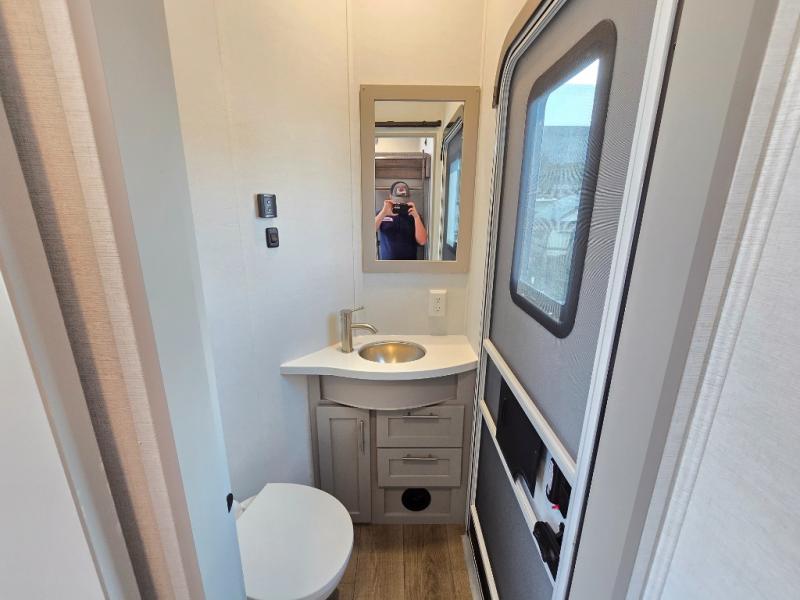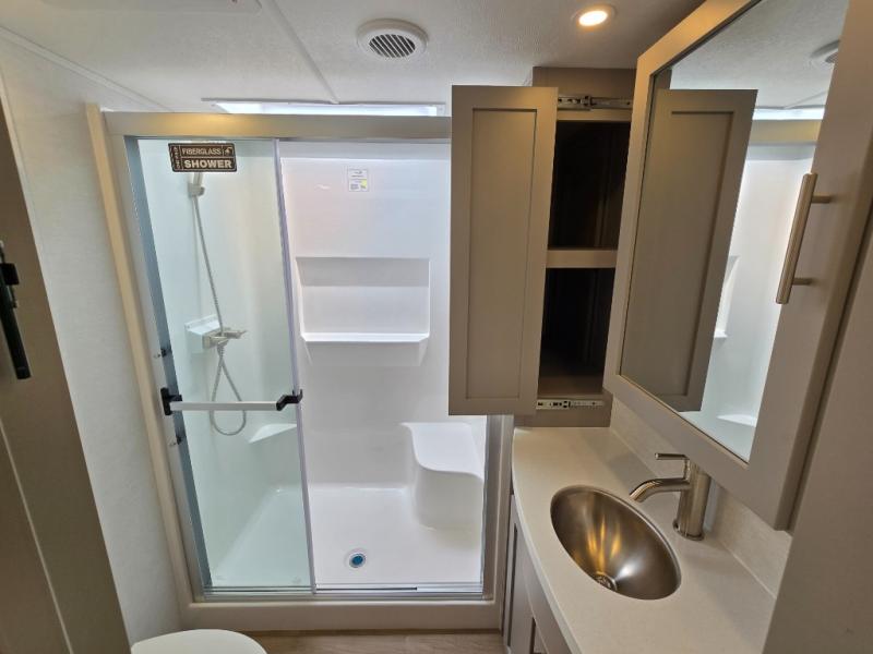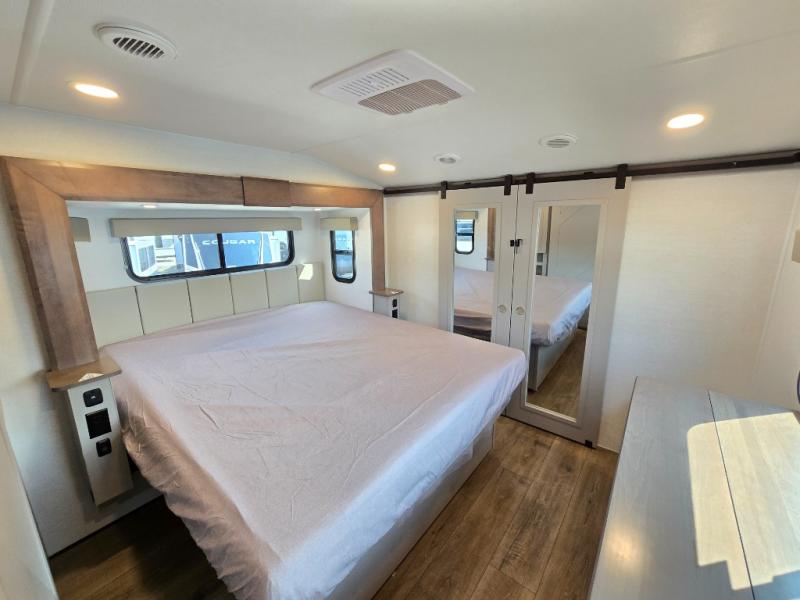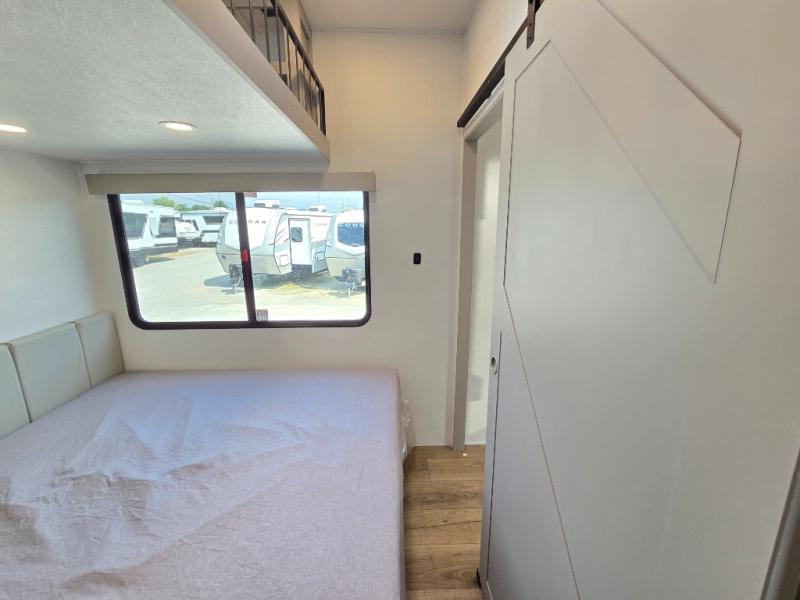 The whole gang can join in on the fun in this fifth wheel! The rear private 54" x 74" loft bed features a lower 60" x 70" bed beneath with storage and a TV, and its very own half bathroom with private entry/exit to the outside. There is also an exterior baggage door so you can easily pack gear straight into this room. The living area comes with dual recliner theater seating, a swing out 50" class HDTV, and a floating dinette table with two chairs and a movable ottoman with flip up storage. There is also a 16 cu. ft. 12 volt refrigerator and pull-out pantry here for food storage. And you can easily prepare your best home cooked meals using the three burner cooktop. When you're ready to wind down your night, head to the front private bedroom and relax on the queen bed slide which could be switched out for the optional king bed if you like! This unit also features an outdoor griddle and refrigerator under the loft space.