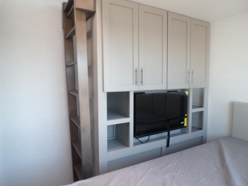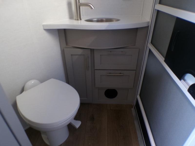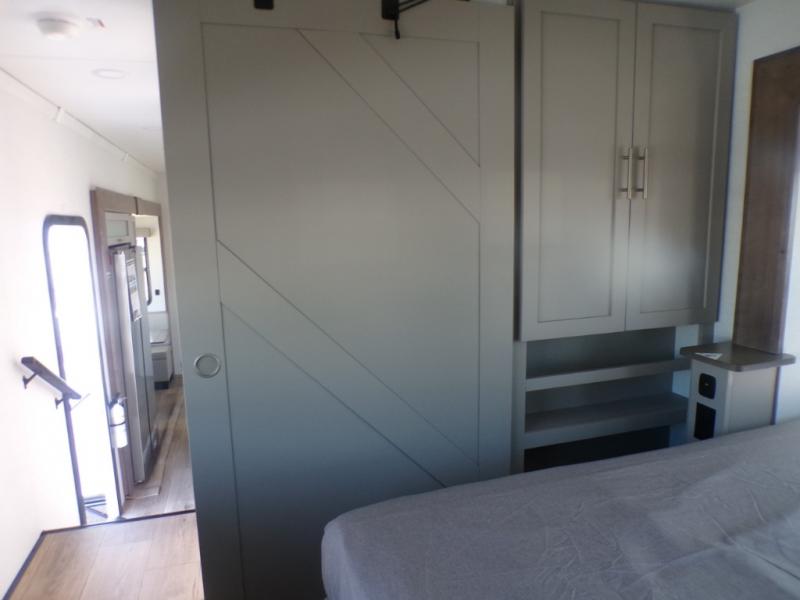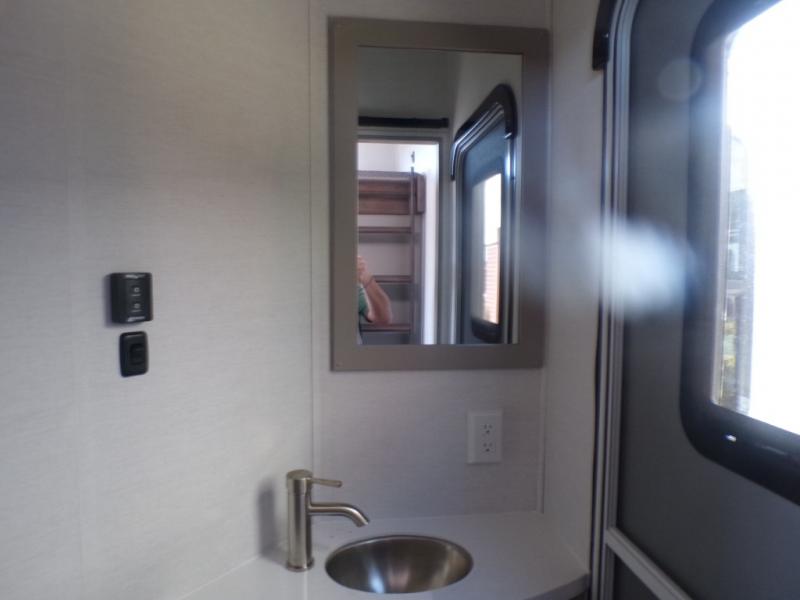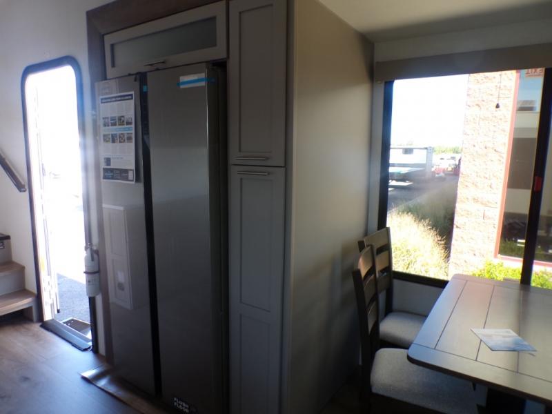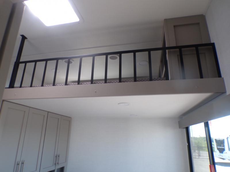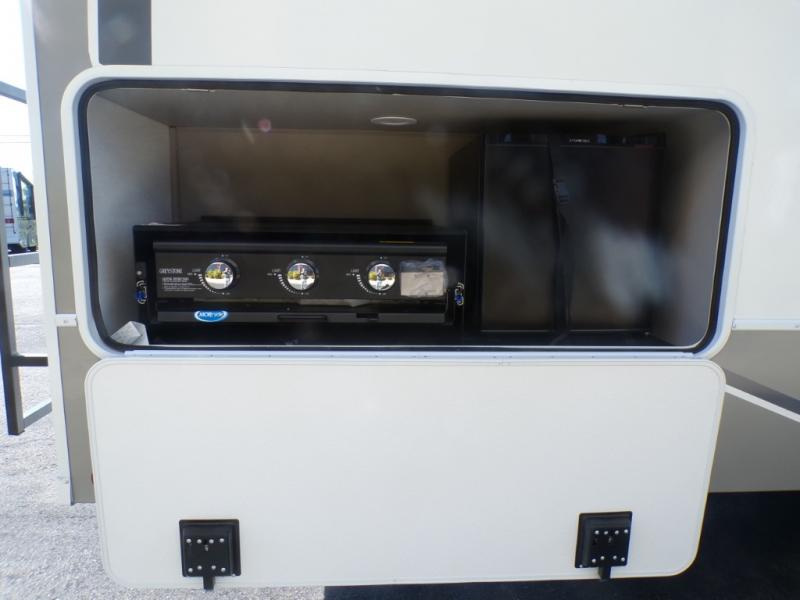 The whole gang can join in on the fun in this fifth wheel! The rear private 54" x 74" loft bed features a lower 60" x 70" bed beneath with storage and a TV, and its very own half bathroom with private entry/exit to the outside. There is also an exterior baggage door so you can easily pack gear straight into this room. The living area comes with dual recliner theater seating, a swing out 50" class HDTV, and a floating dinette table with two chairs and a movable ottoman with flip up storage. There is also a 16 cu. ft. 12 volt refrigerator and pull-out pantry here for food storage. And you can easily prepare your best home cooked meals using the three burner cooktop. When you're ready to wind down your night, head to the front private bedroom and relax on the queen bed slide which could be switched out for the optional king bed if you like! This unit also features an outdoor griddle and refrigerator under the loft space.