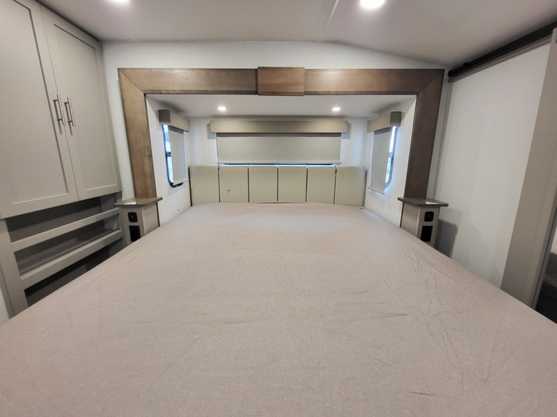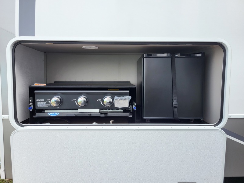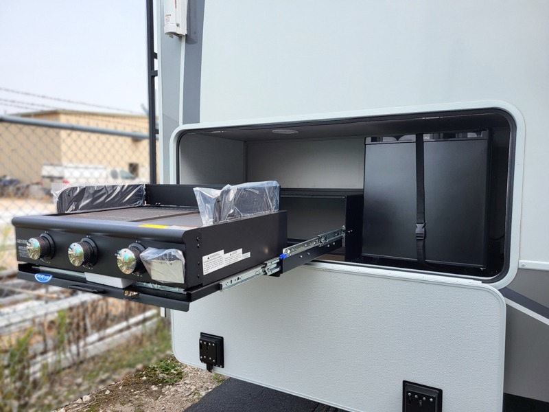 The whole gang can join in on the fun in this fifth wheel! The rear private 54" x 74" loft bed features a lower 60" x 70" bed beneath with storage and a TV, and its very own half bathroom with private entry/exit to the outside. There is also an exterior baggage door so you can easily pack gear straight into this room. The living area comes with dual recliner theater seating, a swing out 50" class HDTV, and a floating dinette table with two chairs and a movable ottoman with flip up storage. There is also a 16 cu. ft. 12 volt refrigerator and pull-out pantry here for food storage. And you can easily prepare your best home cooked meals using the three burner cooktop. When you're ready to wind down your night, head to the front private bedroom and relax on the queen bed slide which could be switched out for the optional king bed if you like! This unit also features an outdoor griddle and refrigerator under the loft space.