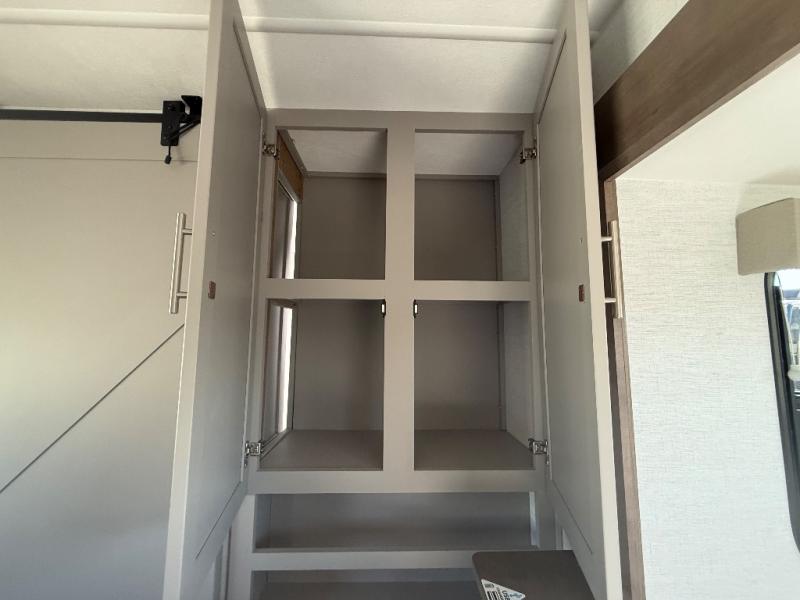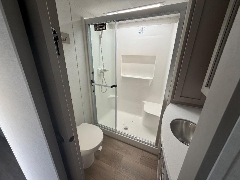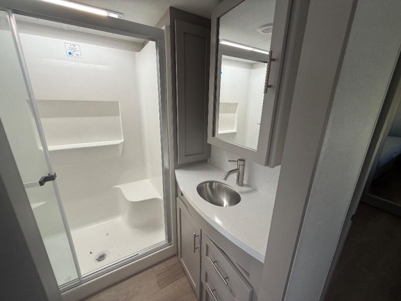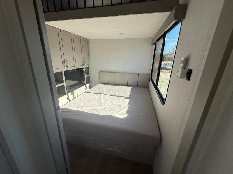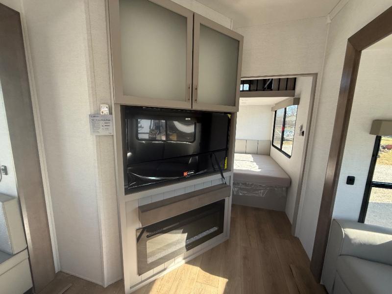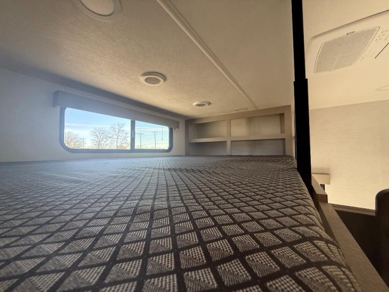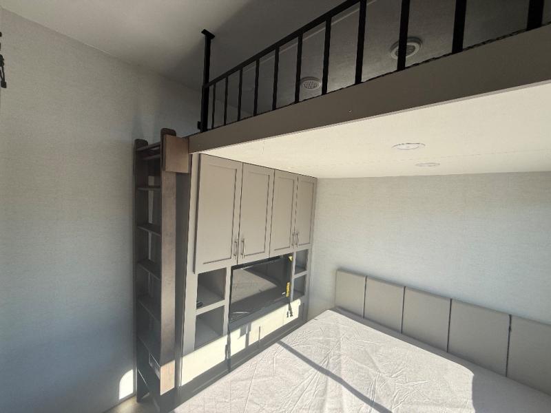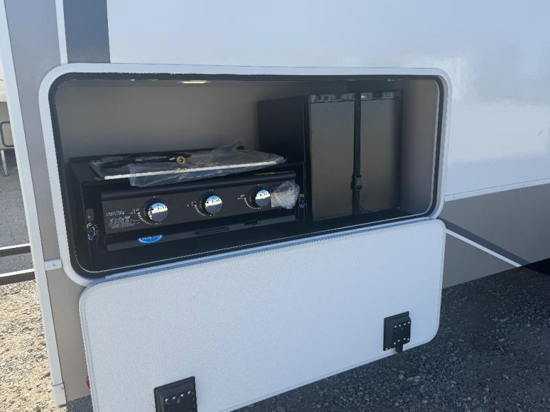 The whole gang can join in on the fun in this fifth wheel! The rear private 54" x 74" loft bed features a lower 60" x 70" bed beneath with storage and a TV, and its very own half bathroom with private entry/exit to the outside. There is also an exterior baggage door so you can easily pack gear straight into this room. The living area comes with dual recliner theater seating, a swing out 50" class HDTV, and a floating dinette table with two chairs and a movable ottoman with flip up storage. There is also a 16 cu. ft. 12 volt refrigerator and pull-out pantry here for food storage. And you can easily prepare your best home cooked meals using the three burner cooktop. When you're ready to wind down your night, head to the front private bedroom and relax on the queen bed slide which could be switched out for the optional king bed if you like! This unit also features an outdoor griddle and refrigerator under the loft space.
